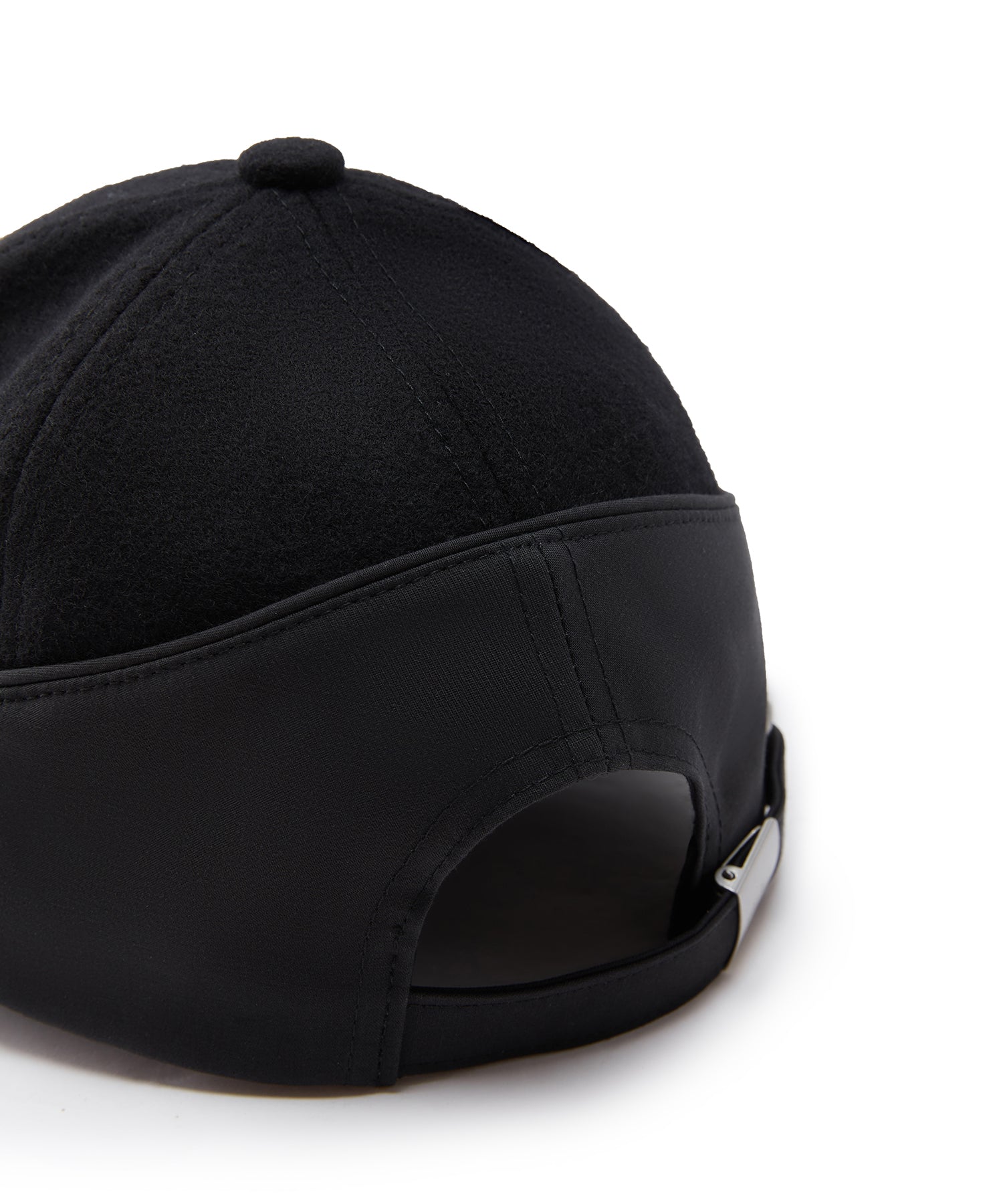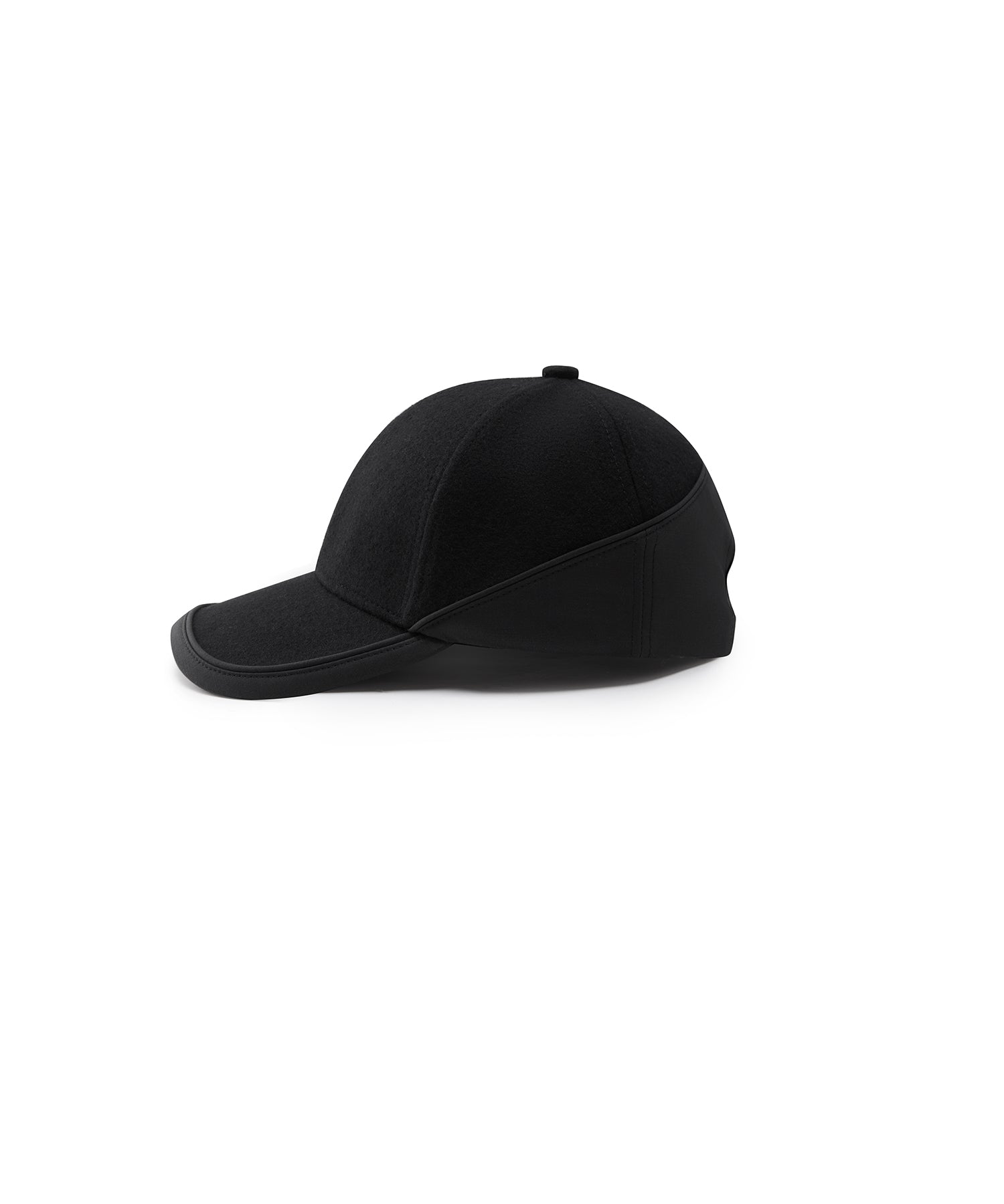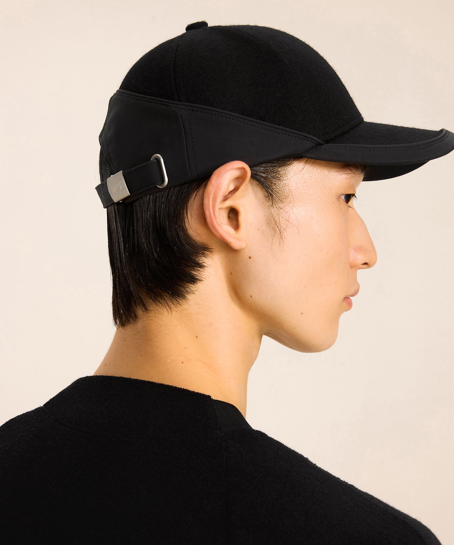 暖かみのあるウール素材を使用したベースボールキャップ。ツバから後ろにかけて施された別布の切り替えラインがデザインのポイントです。シンプルながら存在感があり、スタイリングのアクセントとして活躍します。