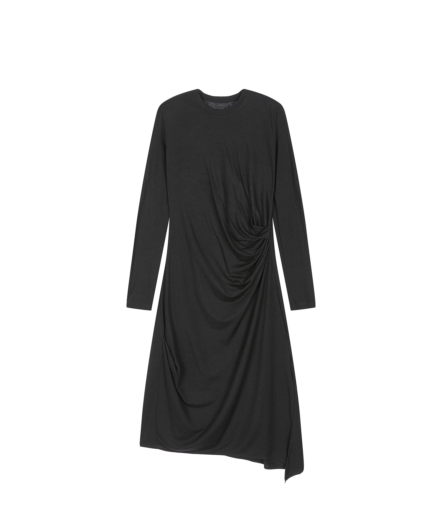 マキシ丈のエレガントなニットドレス。流れるようなドレープが美しいシルエットを描き、左裾のスリットがアシンメトリーな表情をプラスします。一枚でスタイルが完成する、モードで洗練された一着です。