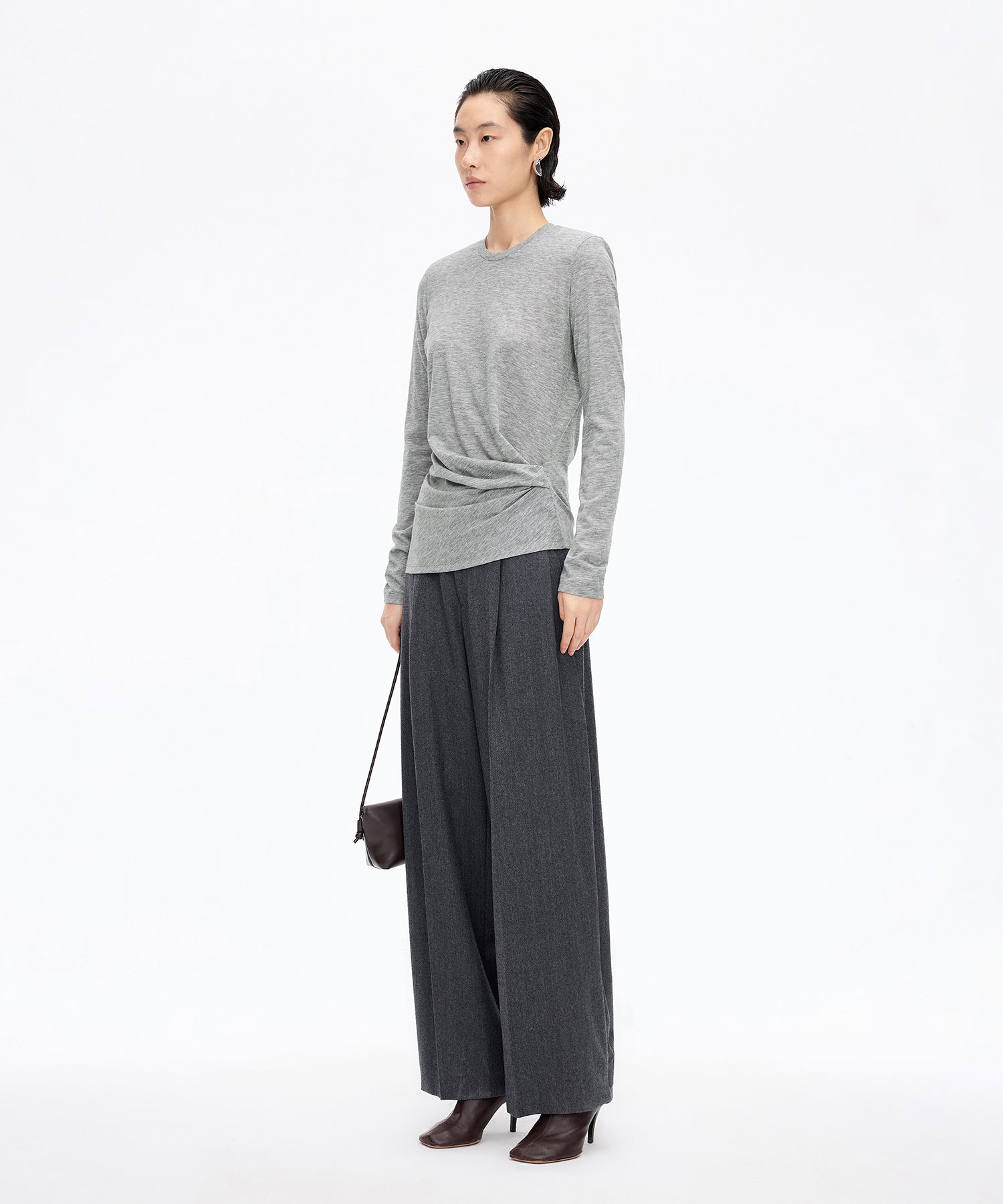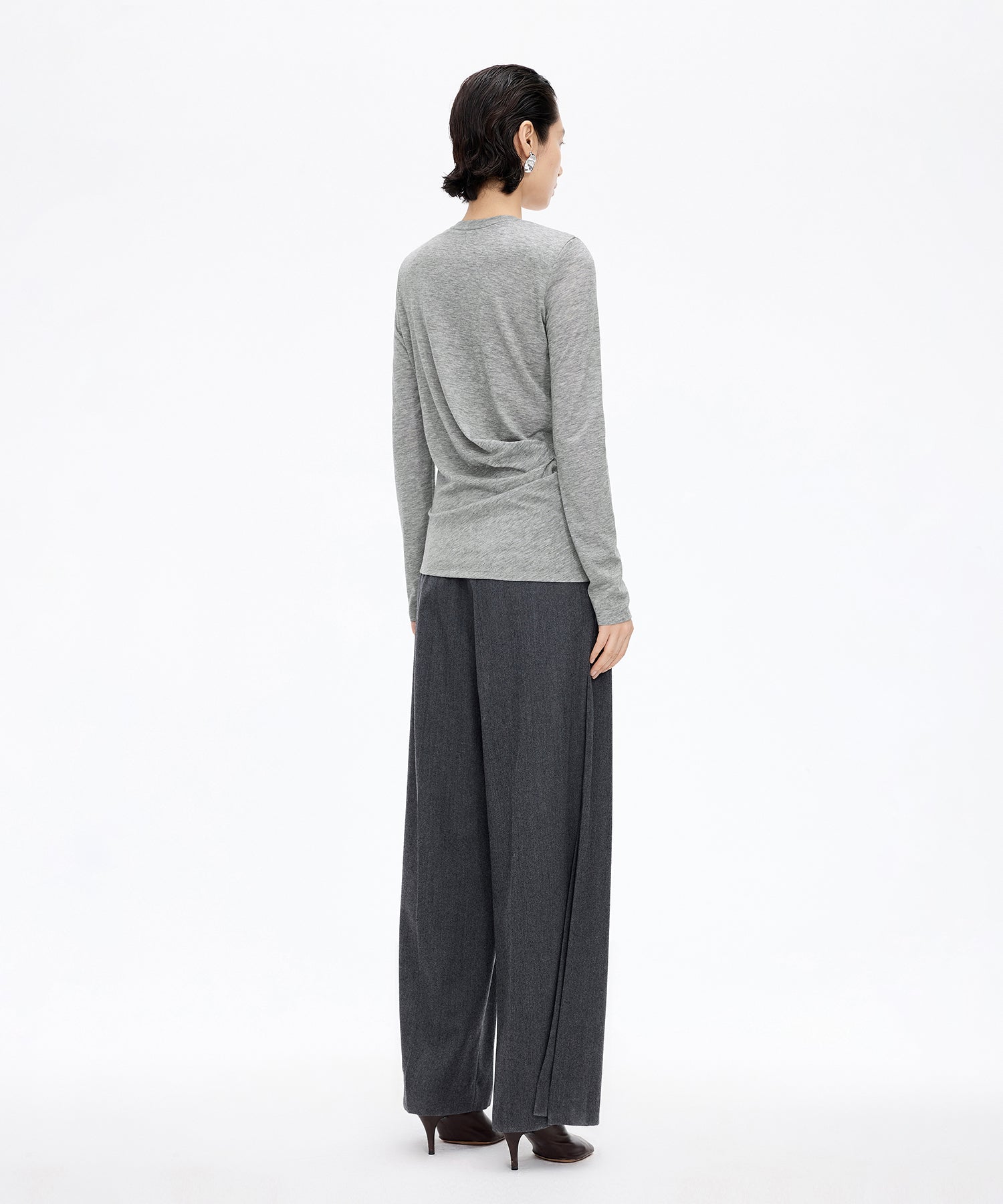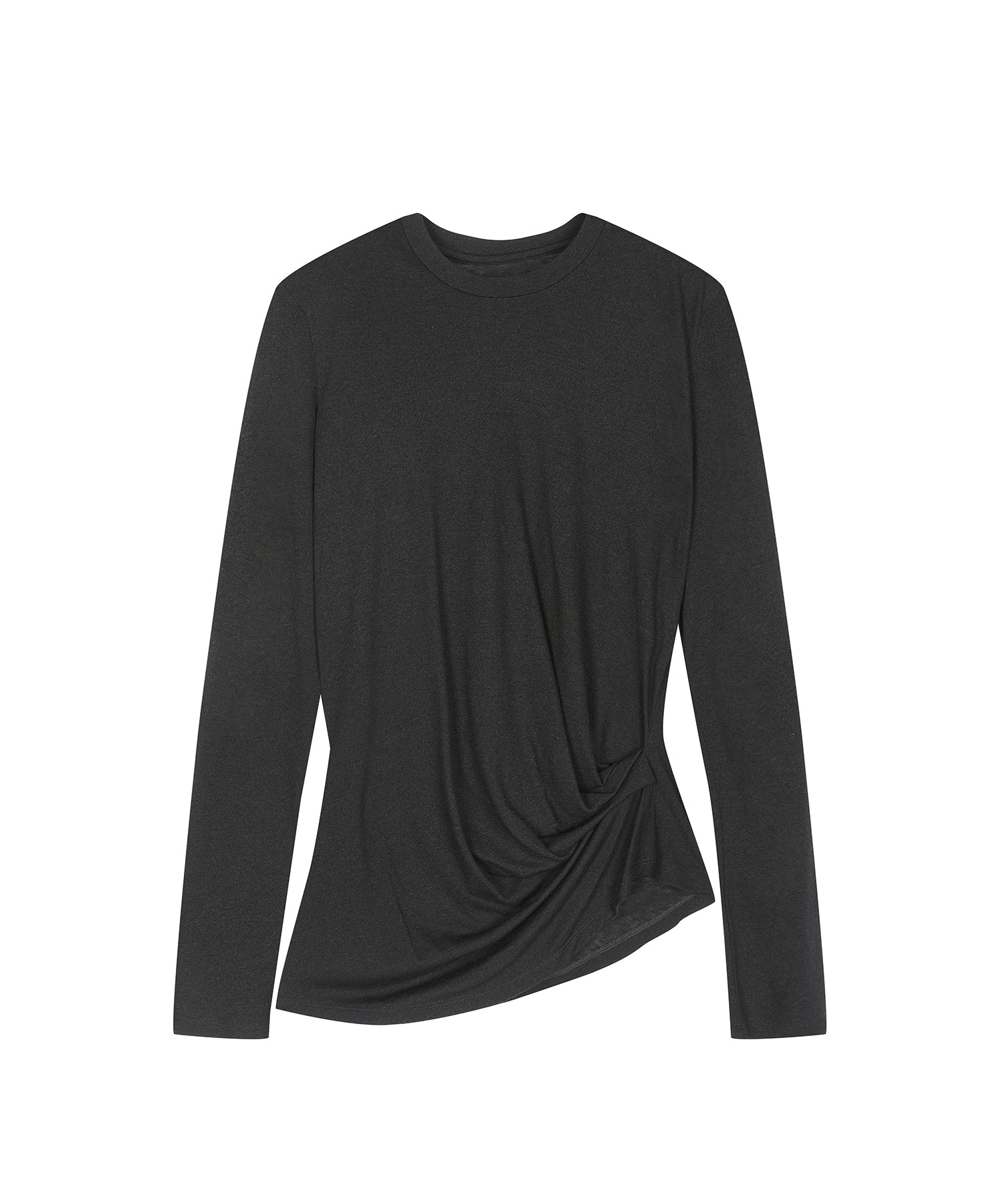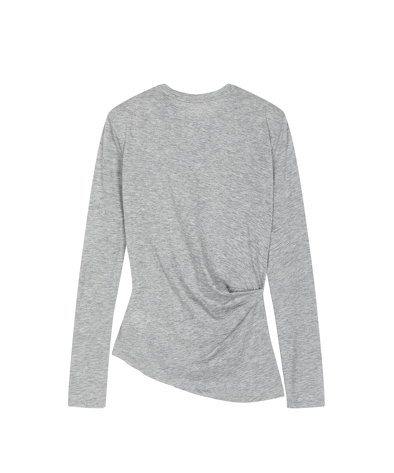 柔らかな風合いと上品なシルエットが魅力のアシンメトリーニット。ウエストに施されたさりげないねじりデザインが自然なドレープを生み出し、女性らしい立体的なラインを描きます。単品ではもちろん、ジャケットやカーディガンのインナーとしても活躍する一着です。