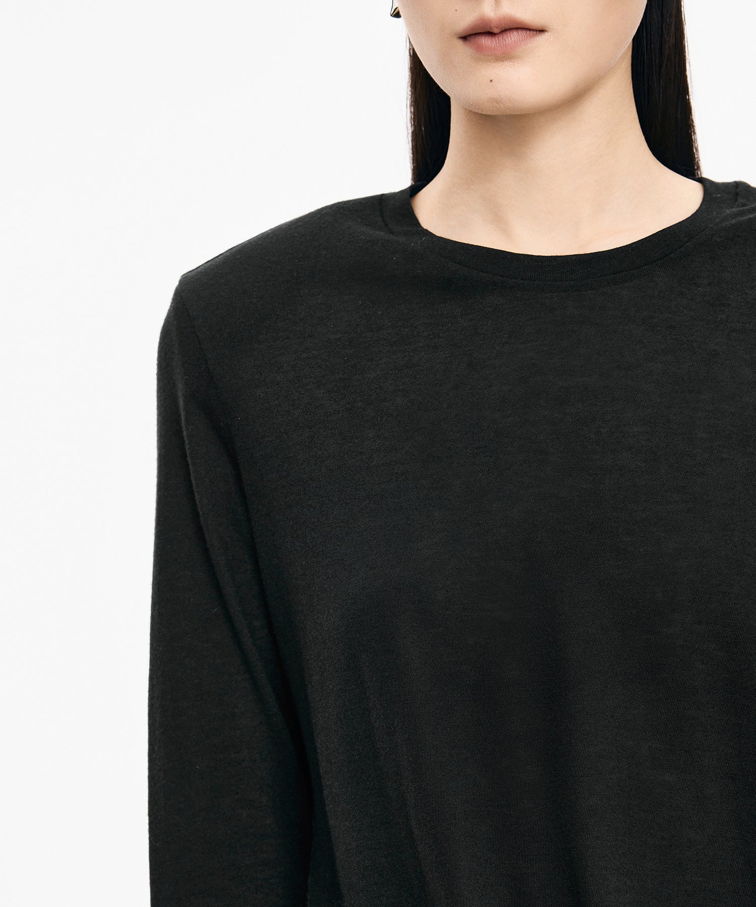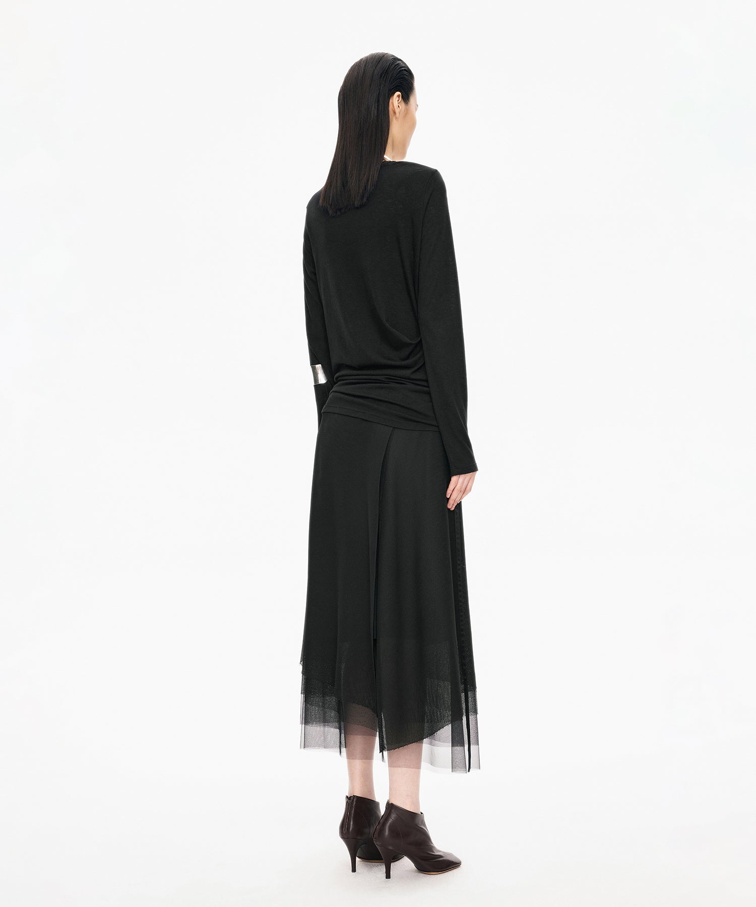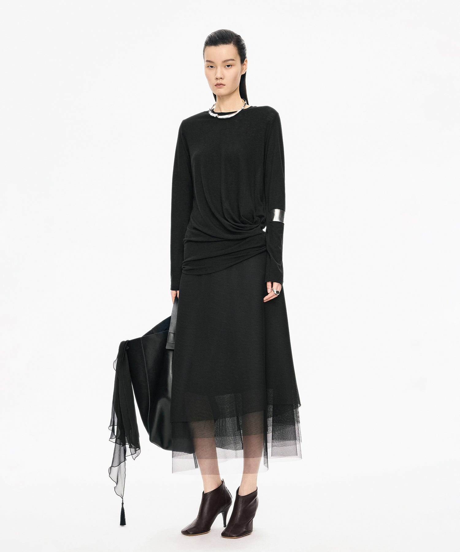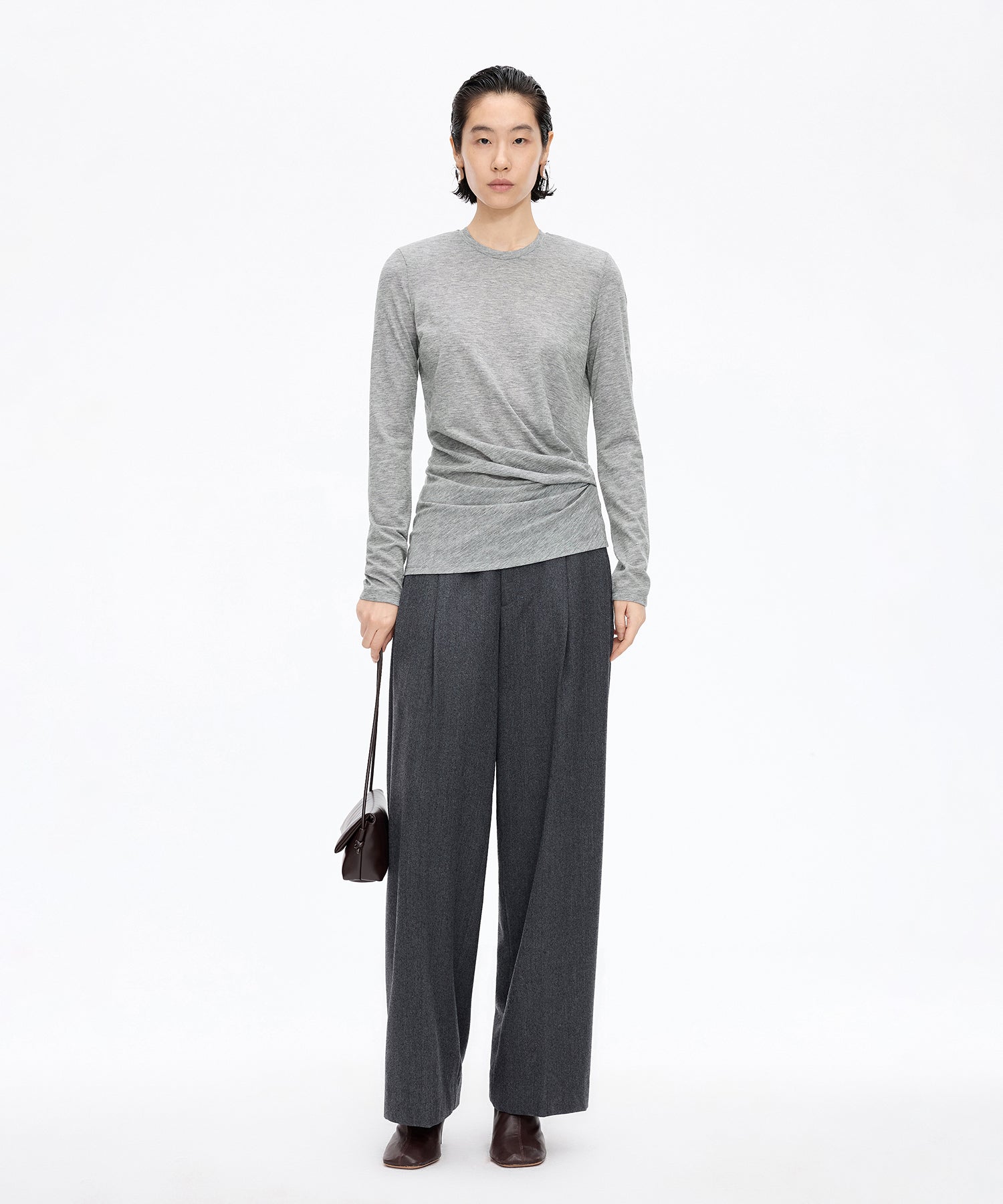 柔らかな風合いと上品なシルエットが魅力のアシンメトリーニット。ウエストに施されたさりげないねじりデザインが自然なドレープを生み出し、女性らしい立体的なラインを描きます。単品ではもちろん、ジャケットやカーディガンのインナーとしても活躍する一着です。