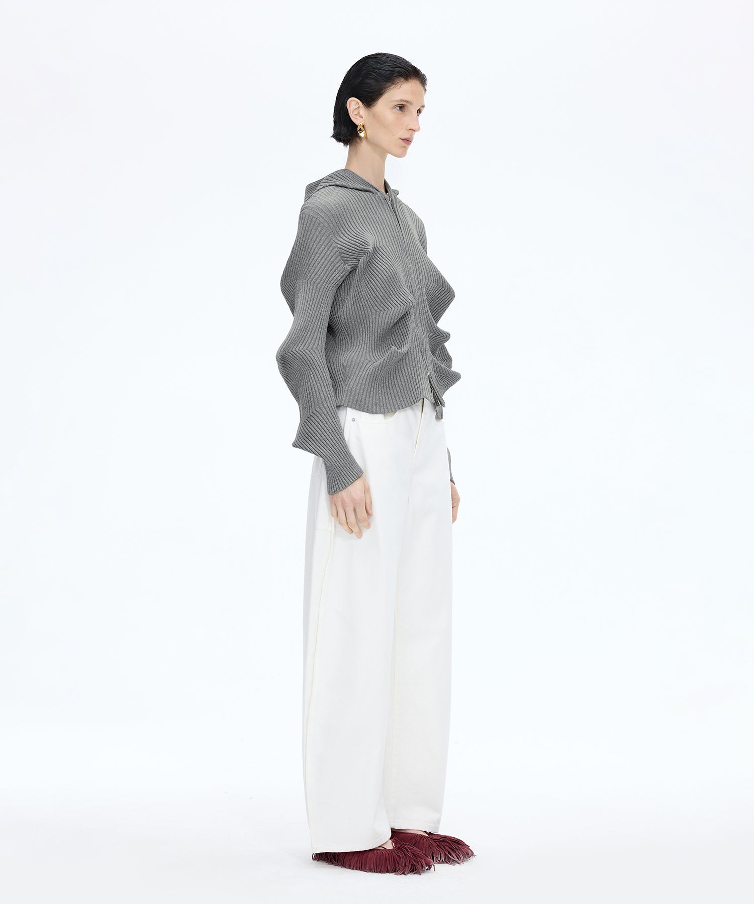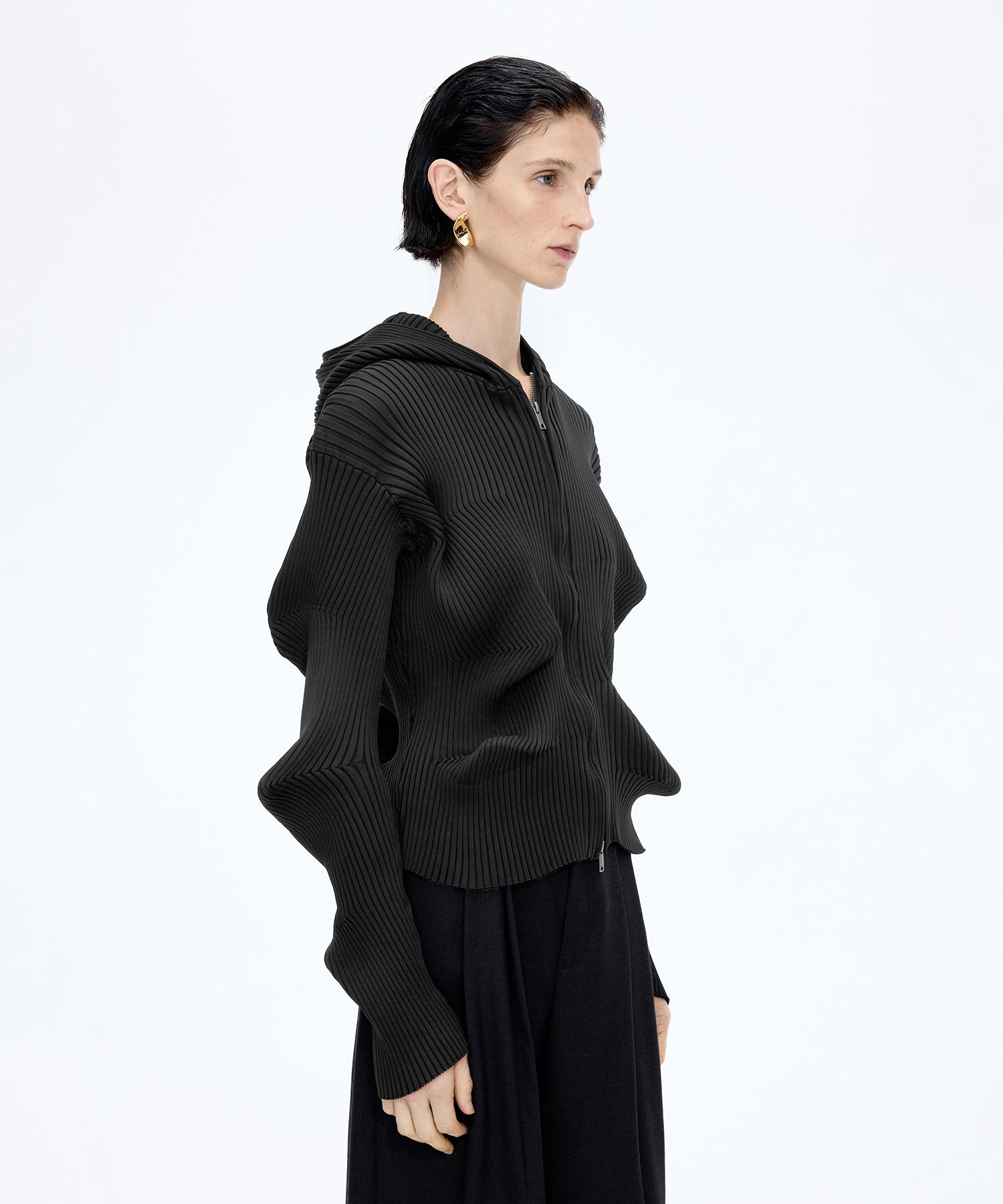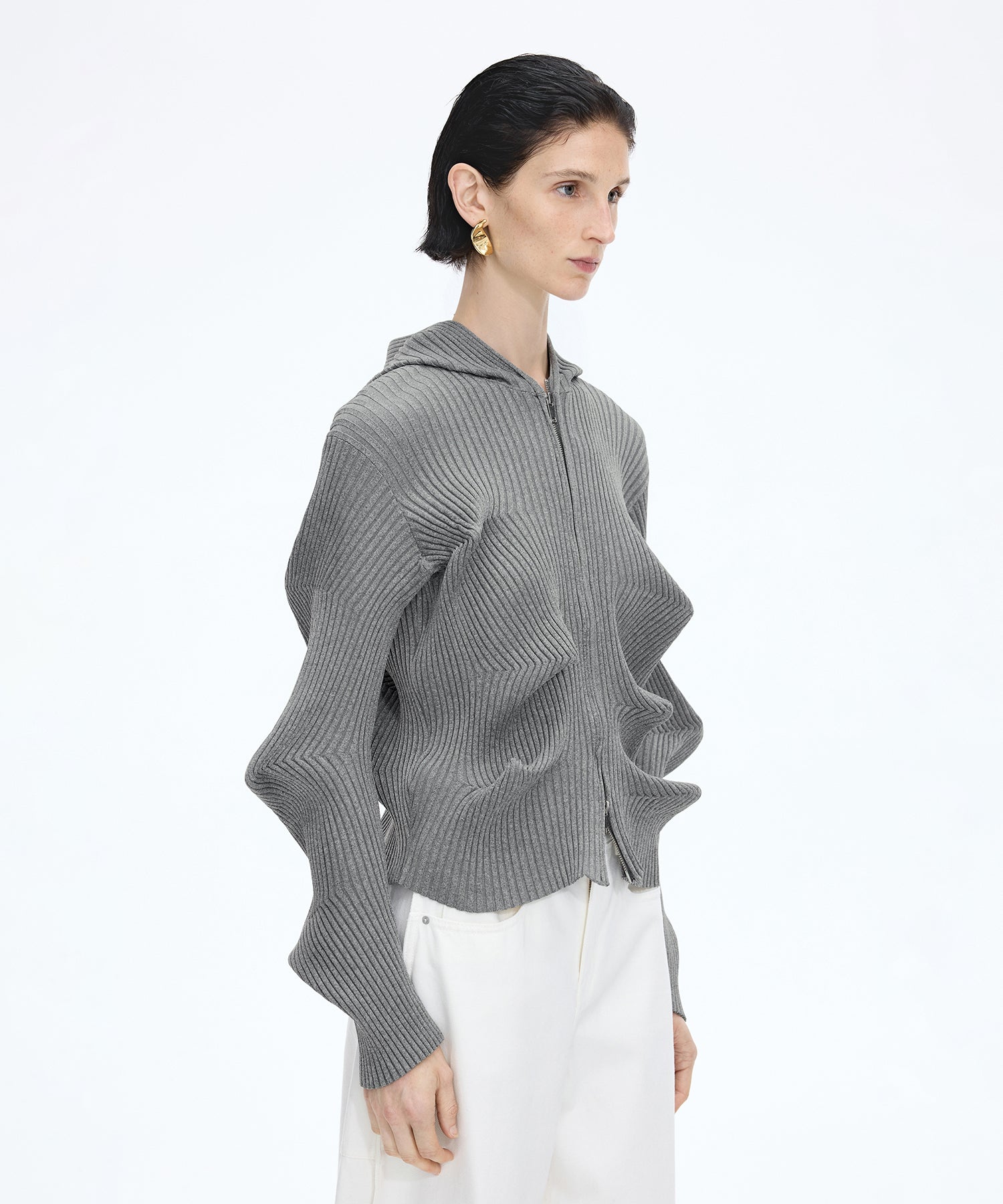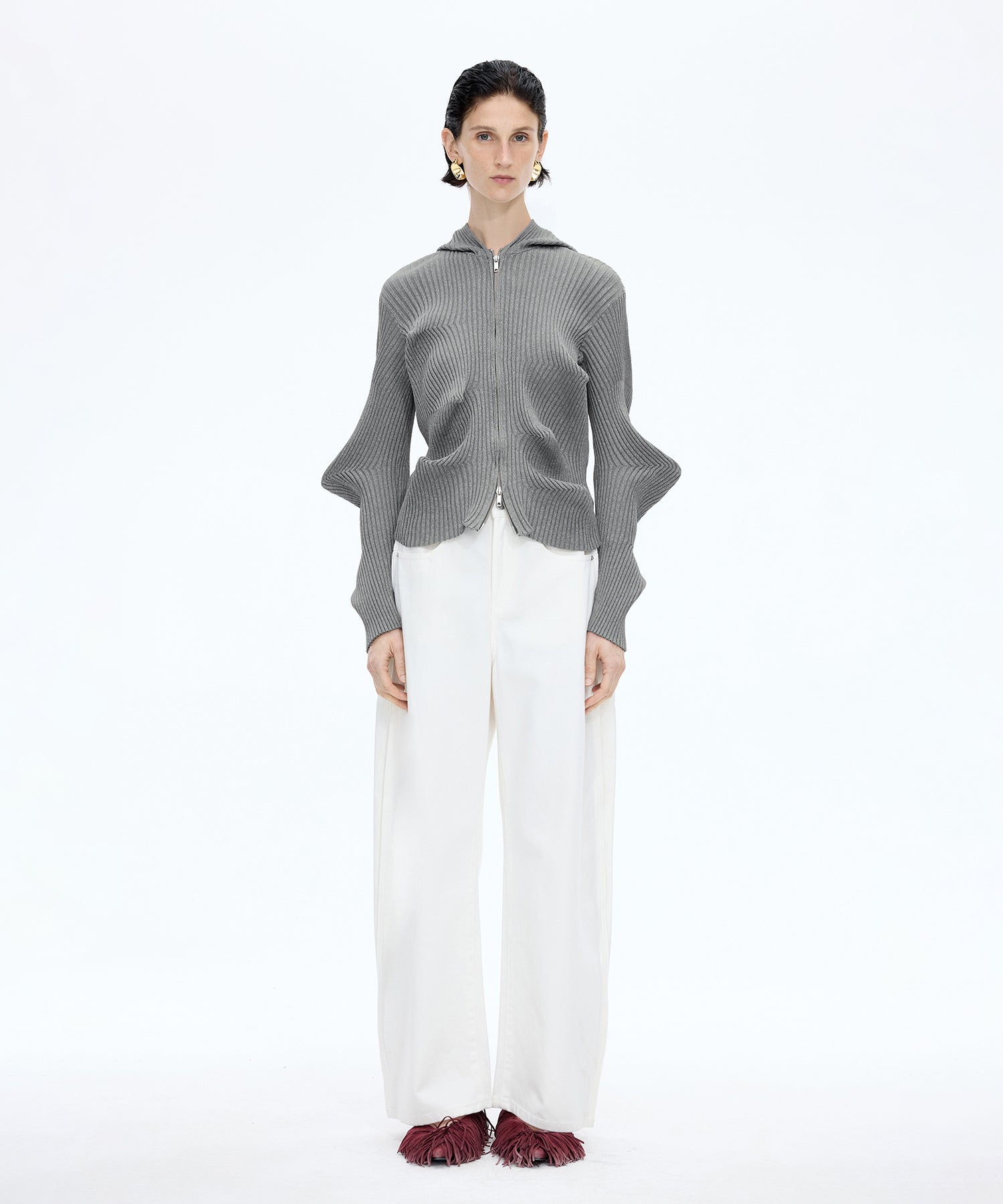 JNBY定番のユニークなフォルムが魅力のジップアップカーディガン。ニットならではの立体的なシルエットを楽しめます。ファッショナブルなデザインで、スタイリングに個性と洗練をプラスする一着です。