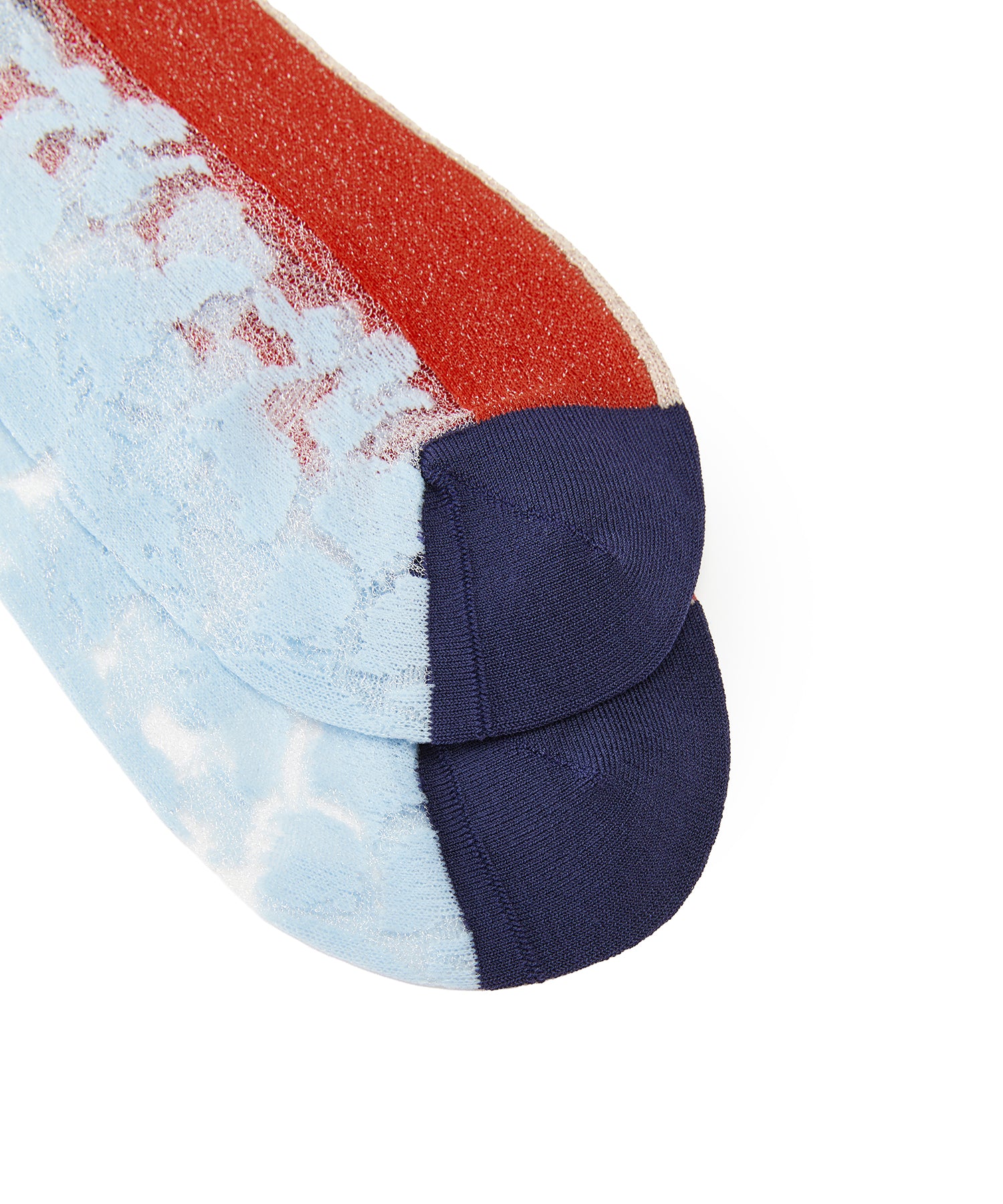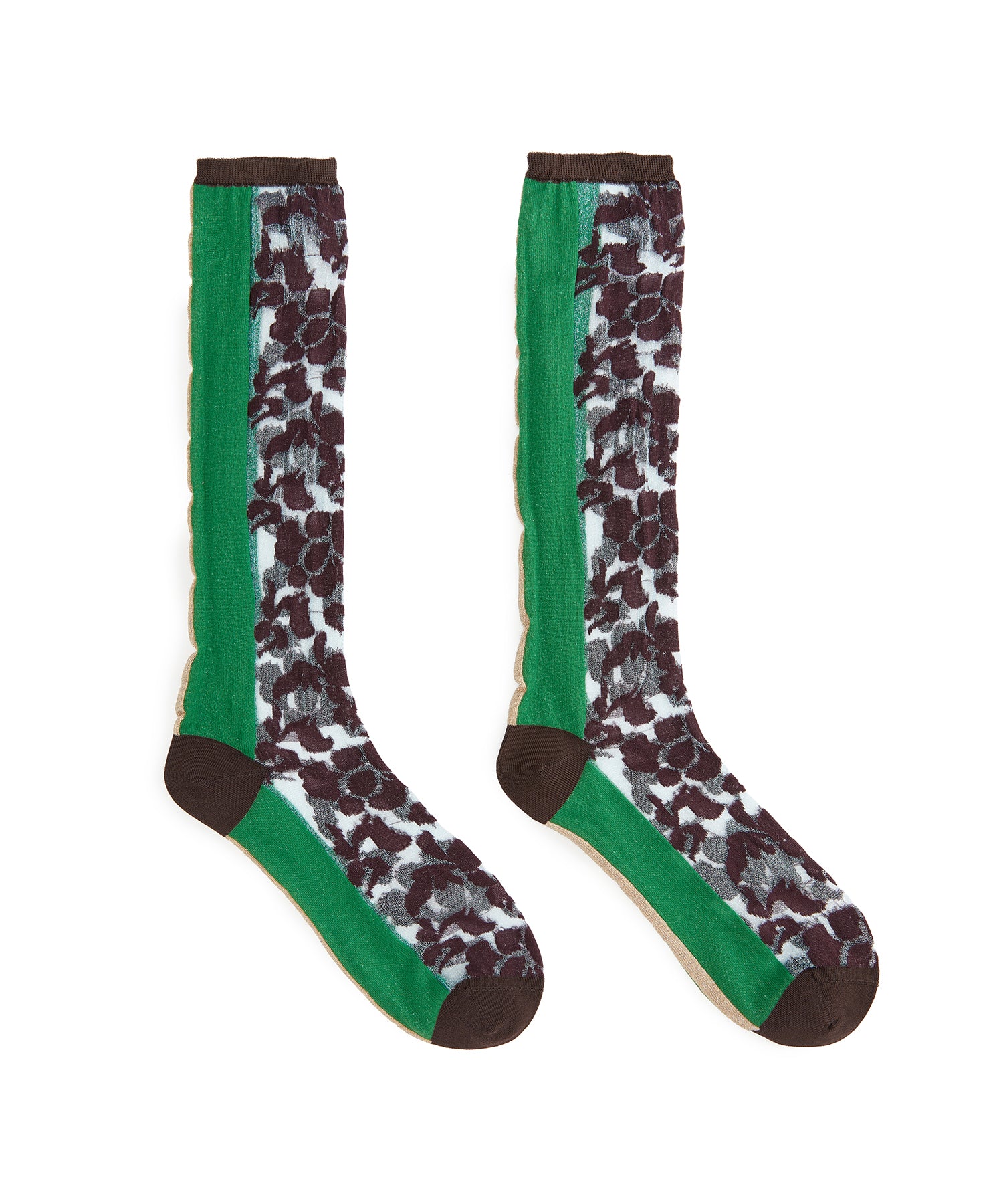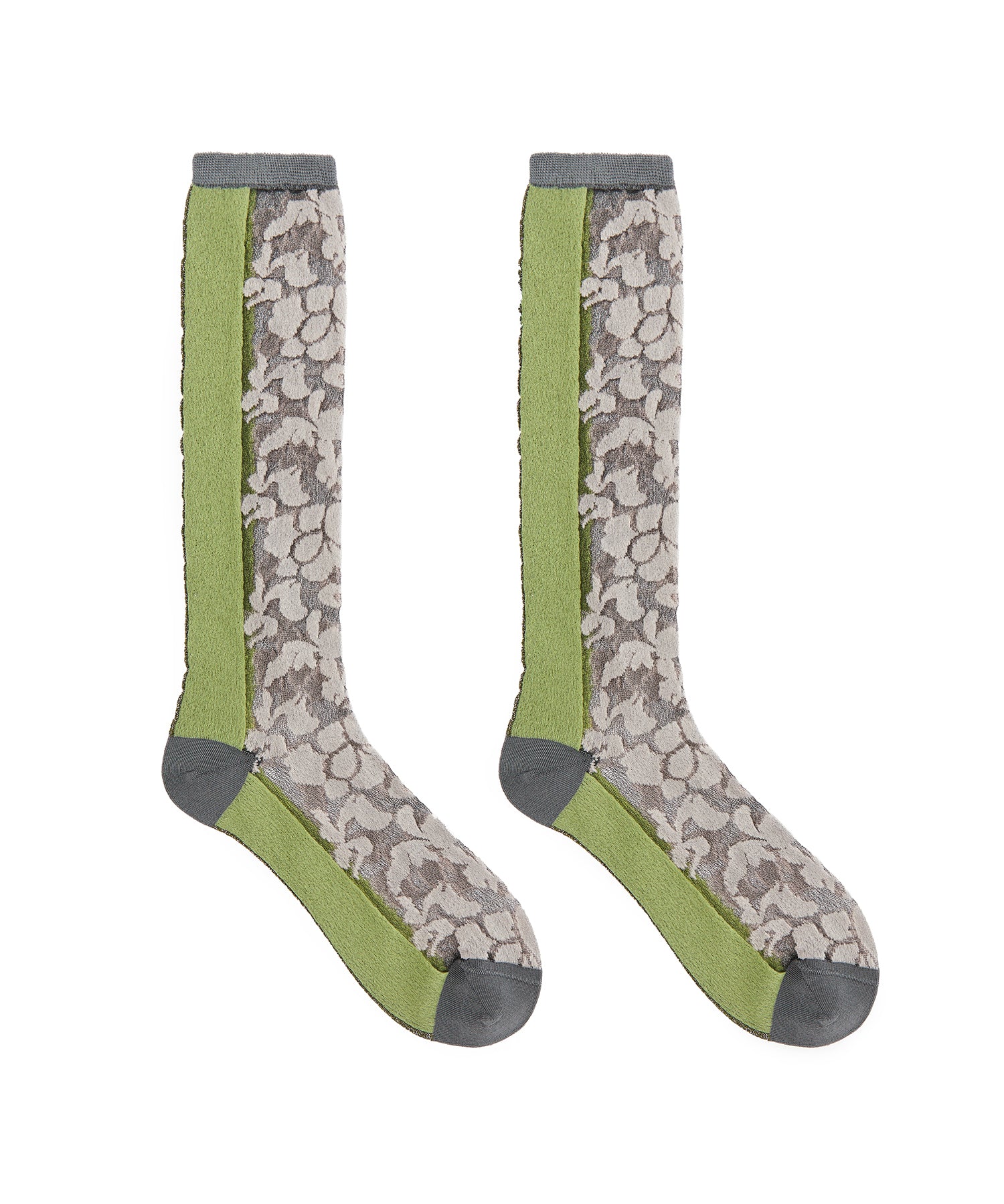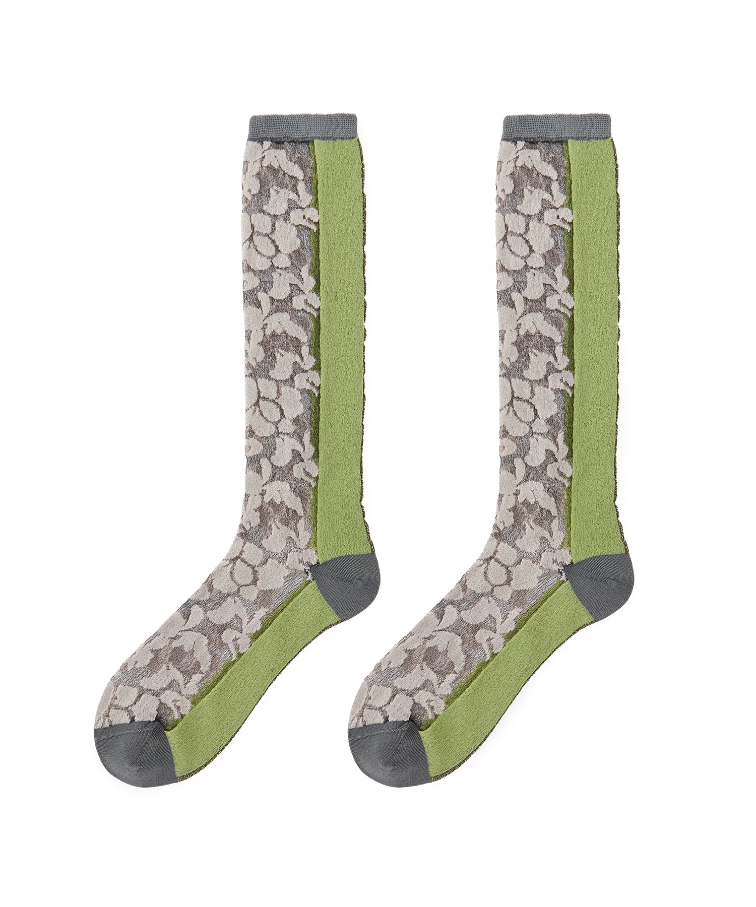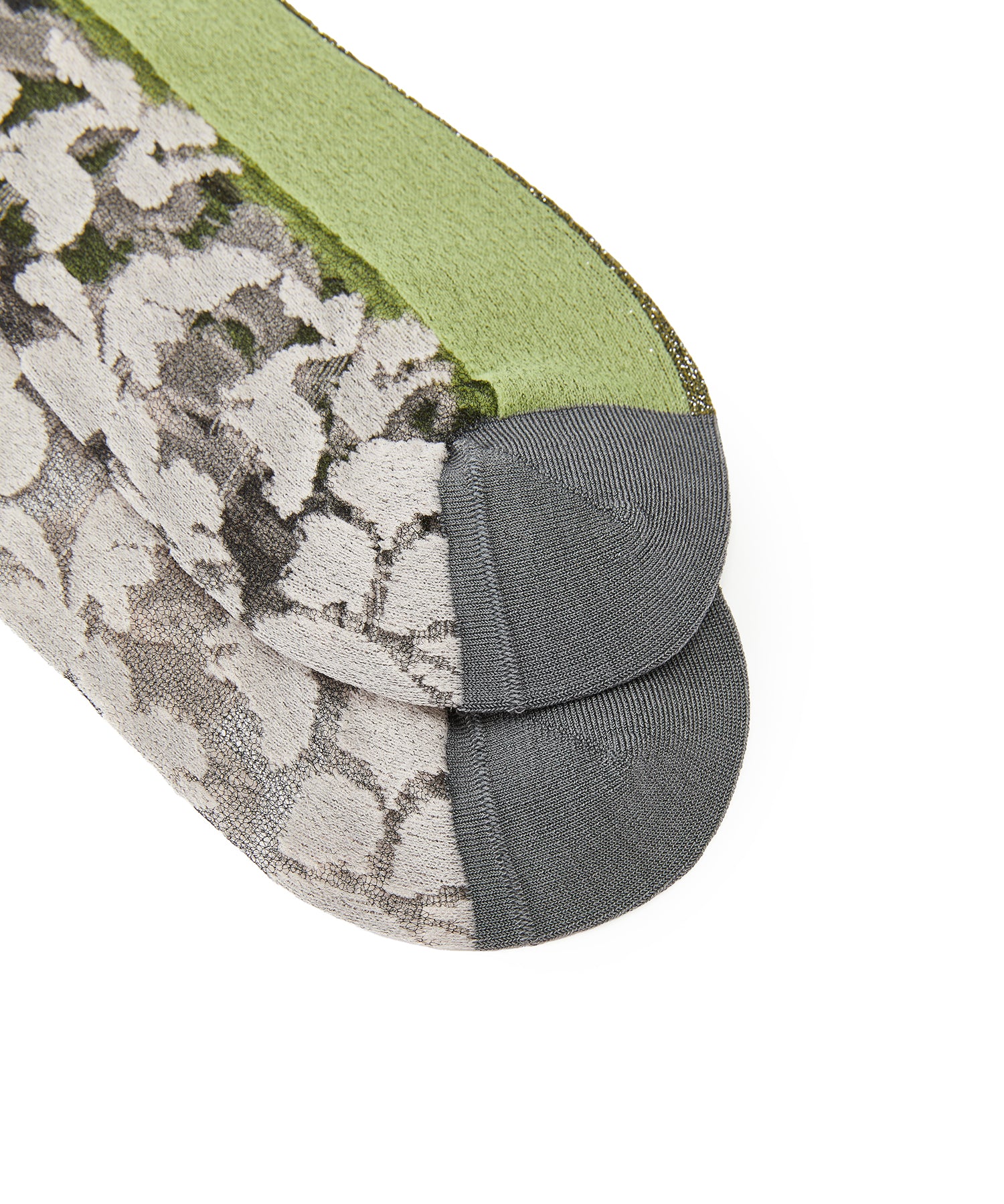 繊細なフラワー柄が印象的なシースルーソックス。部分的にあしらったラメ糸が、足元にさりげない華やぎをプラスします。コーディネートのアクセントとして、パンプスやスニーカー、ショートブーツなど幅広く合わせて楽しめる一足です。