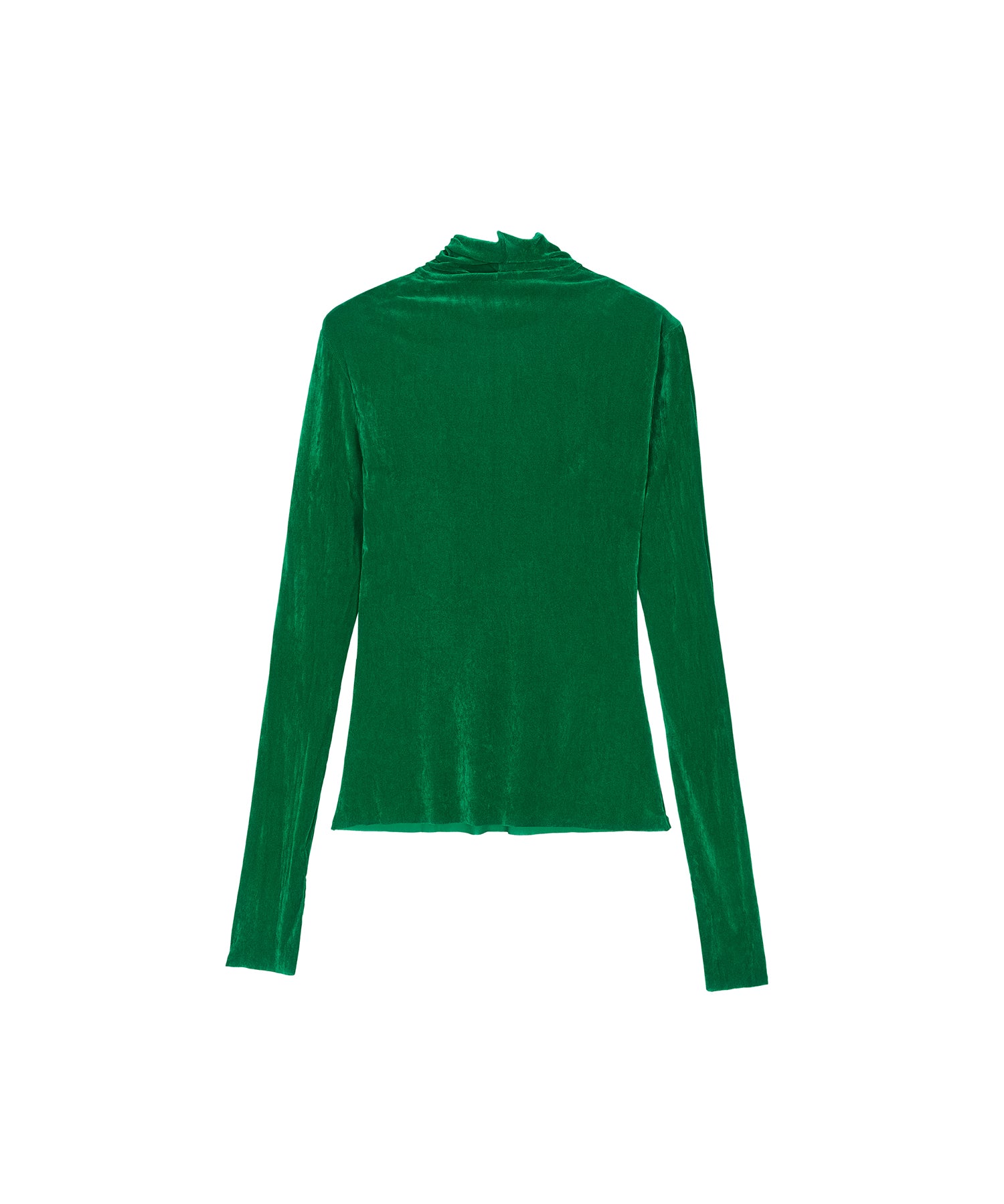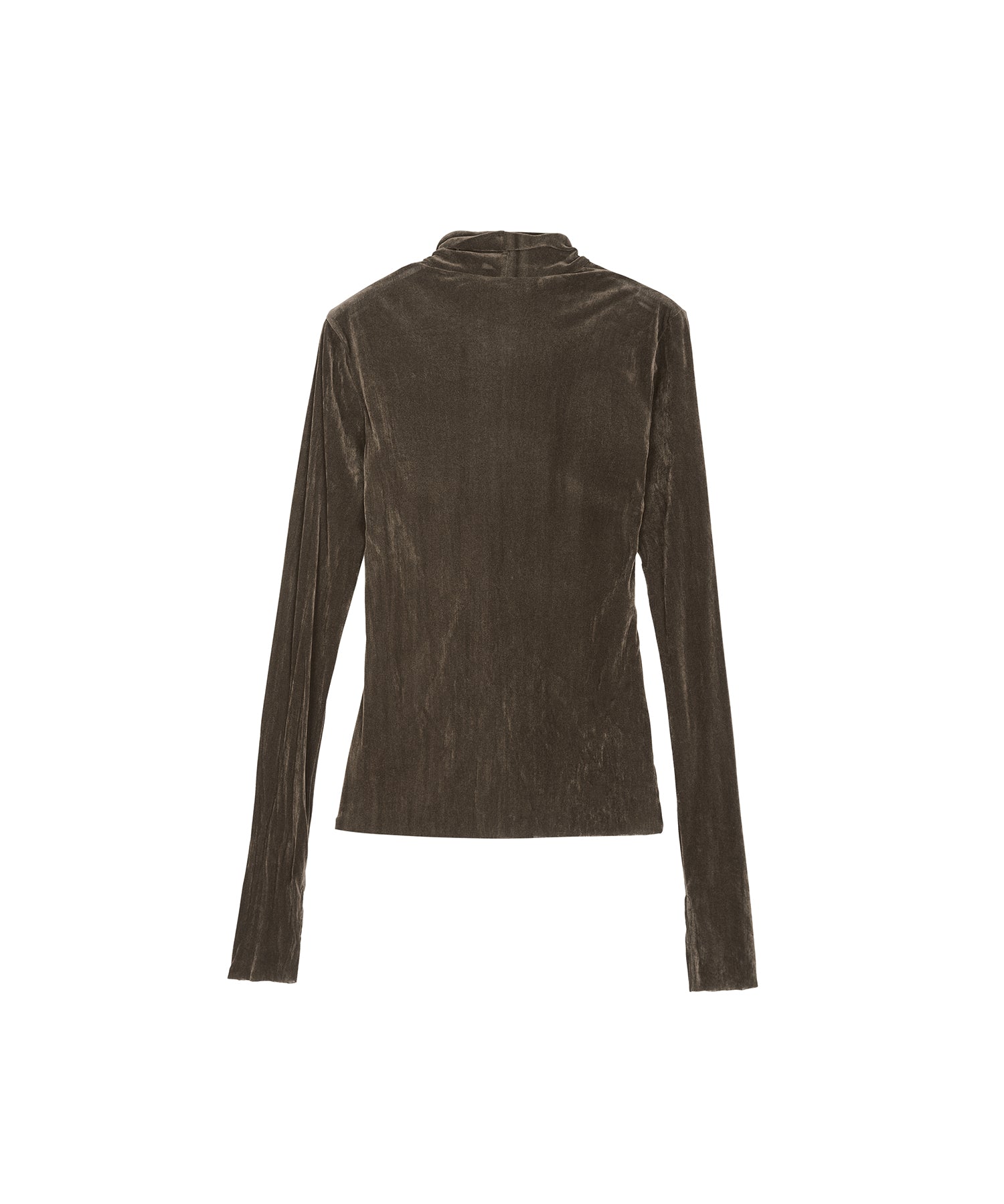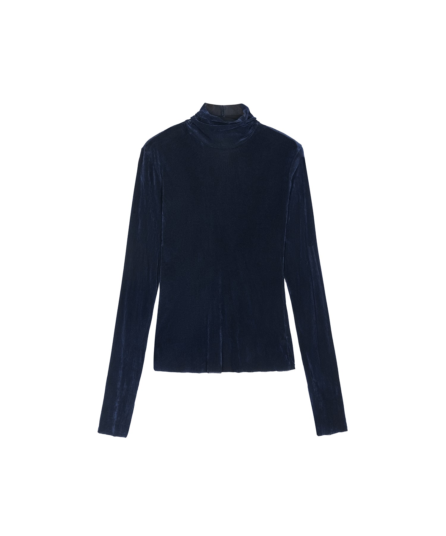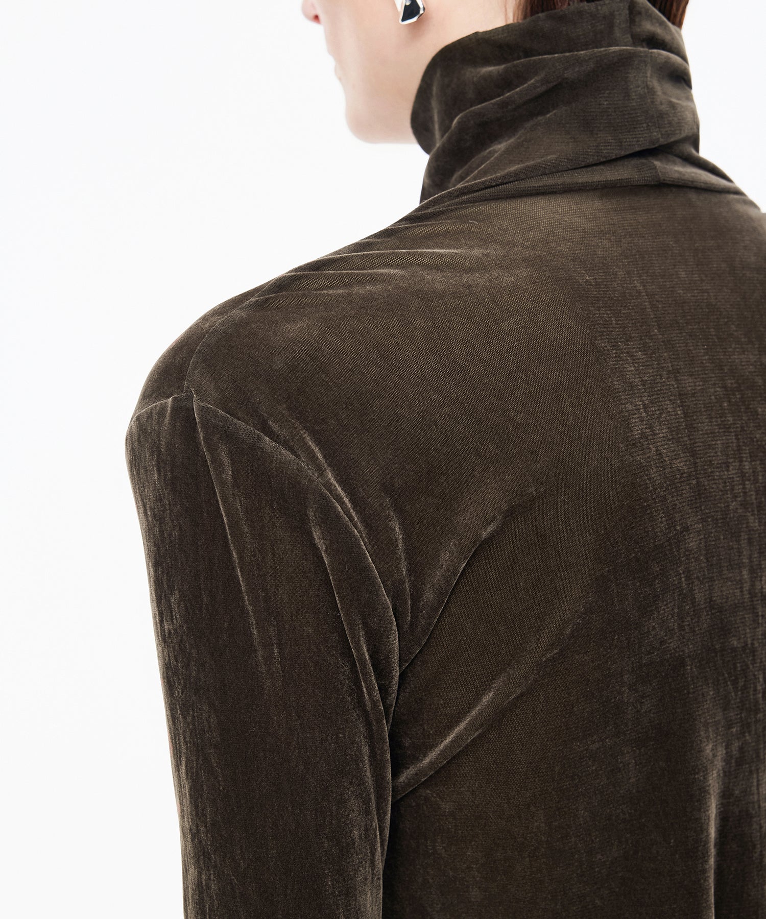光沢のあるベロア素材が上品な印象を与えるタートルネックトップス。身体にほどよく沿うミニマルなシルエットが、素材の質感を一層引き立てます。シーズンムードを高める全5色展開で、一枚ではもちろん、ジャケットやニットのインナーとしても活躍します。