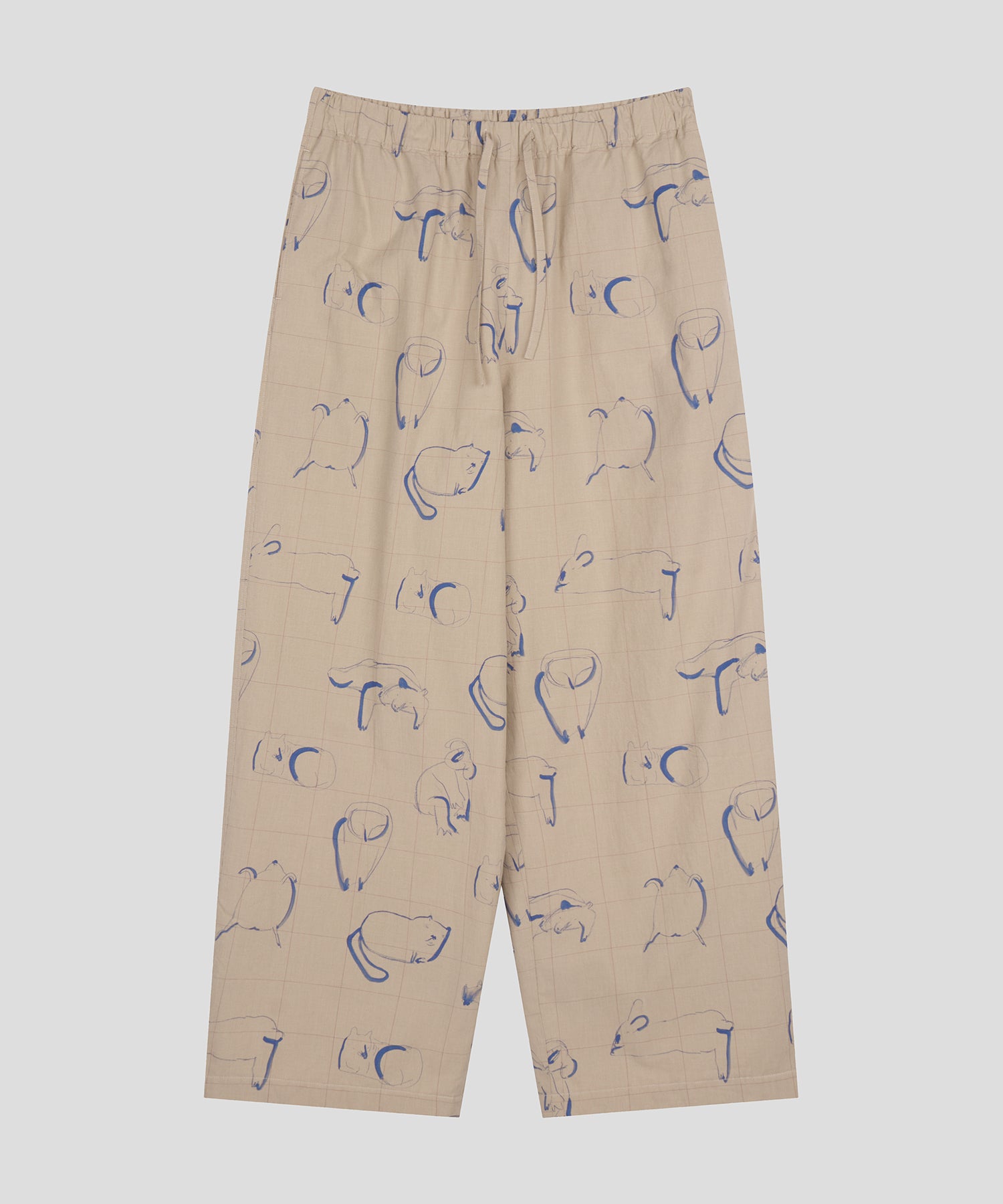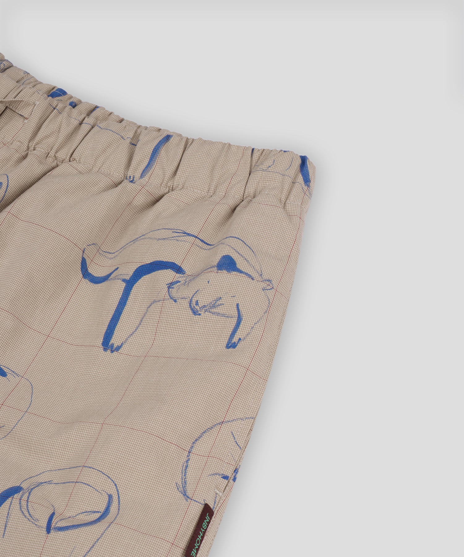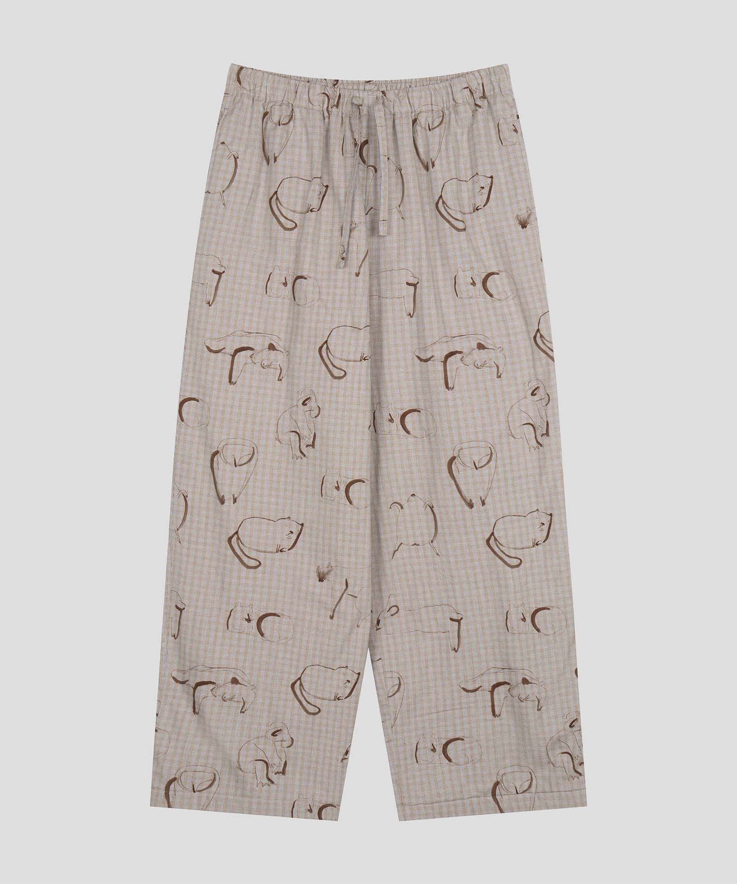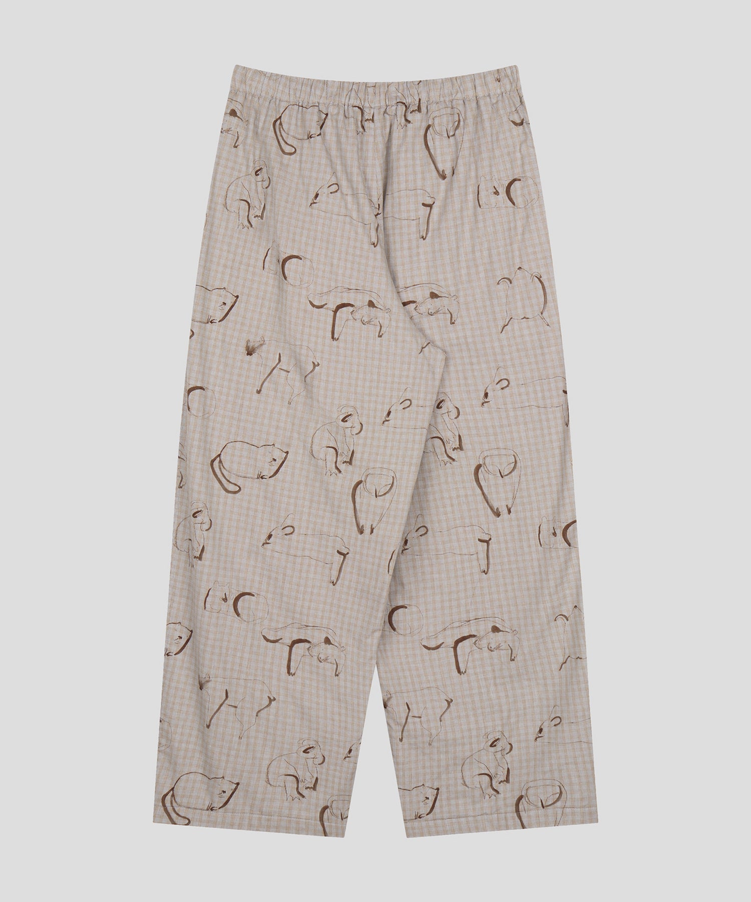 チェック柄のベースにアニマルモチーフを描いたルームウェアパンツ。裏地には暖かなフリース素材を使用し、寒い季節も快適に過ごせます。ユニセックスで着用できるデザインで、リラックス感と遊び心を兼ね備えた一着です。