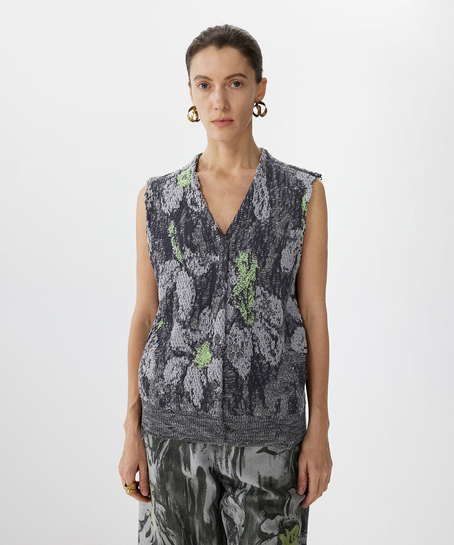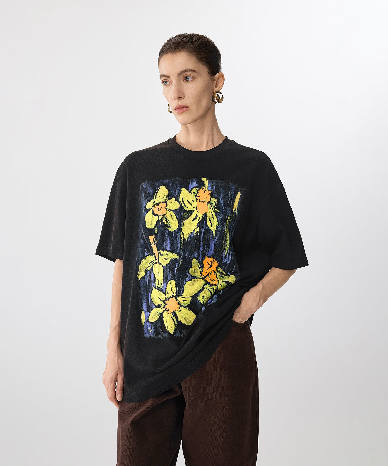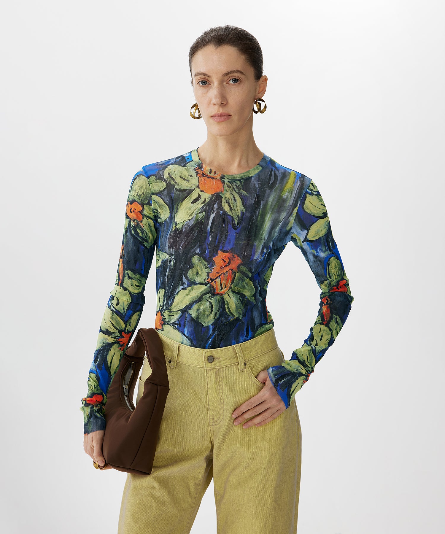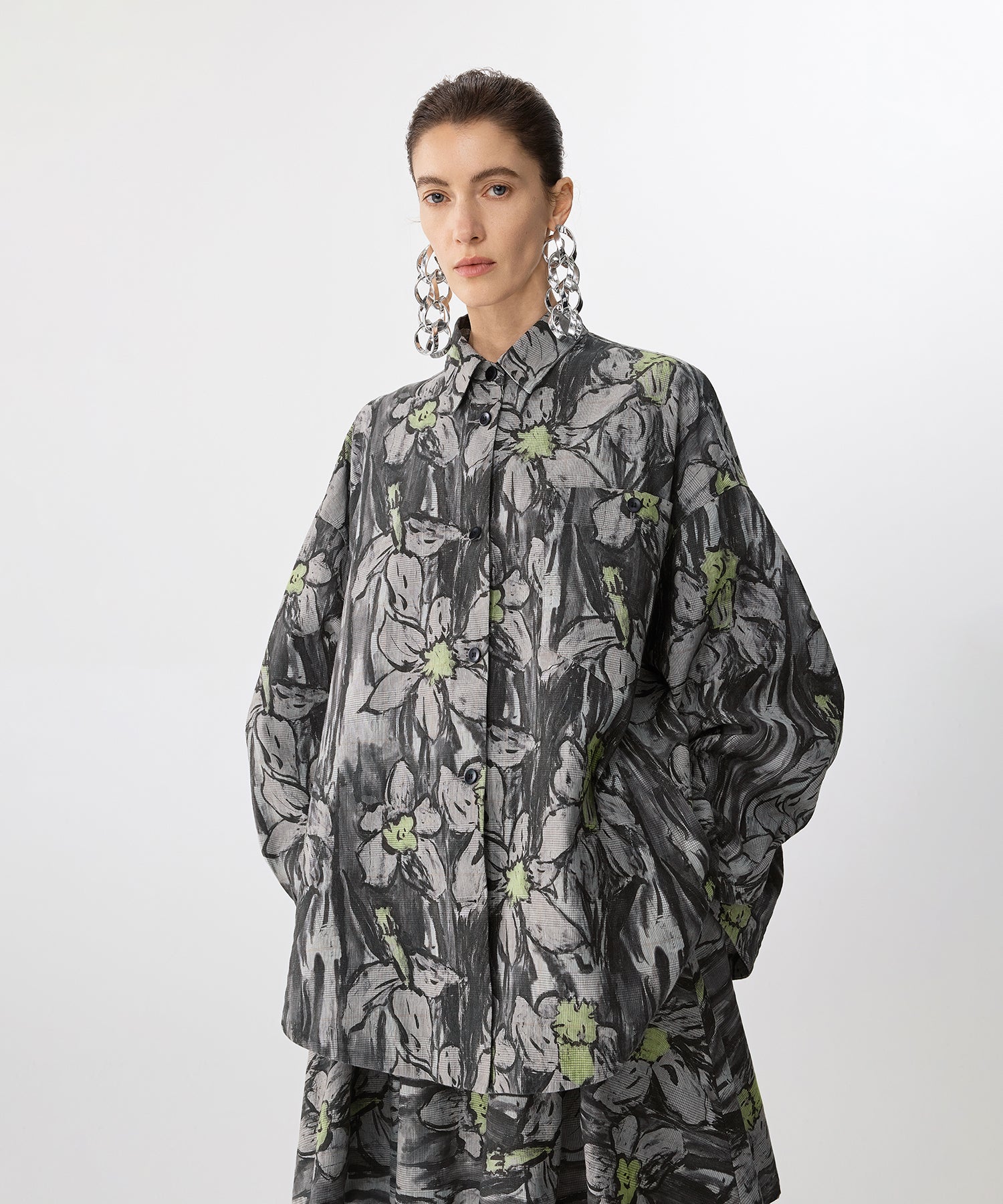 抽象的でアート感のある手描きフラワー柄が魅力のシルクブラウス。ロマンチックかつモダンな雰囲気を演出します。楊柳のシルク生地を使用し、上品な透け感がスタイリングに洗練された表情をプラスします。