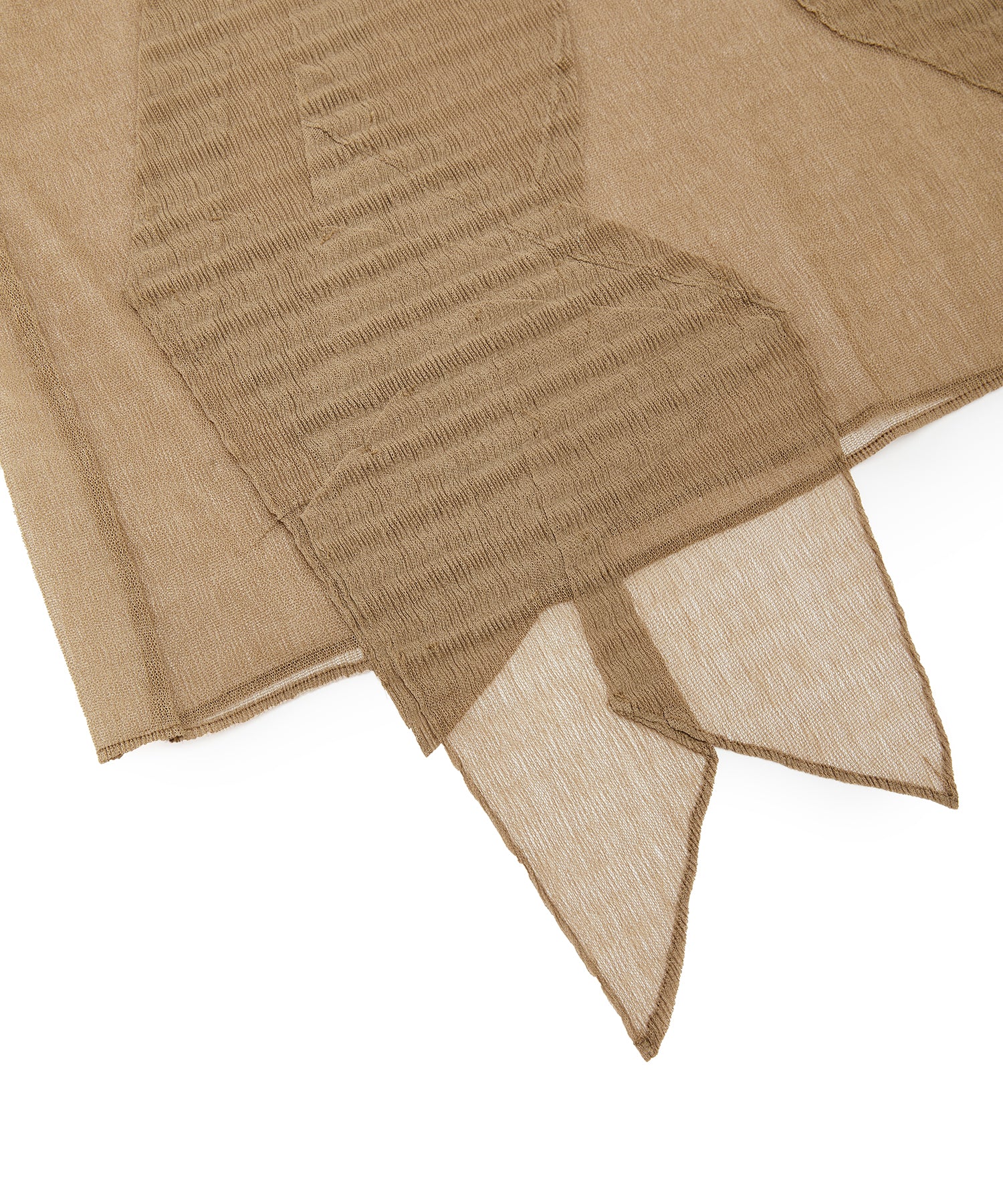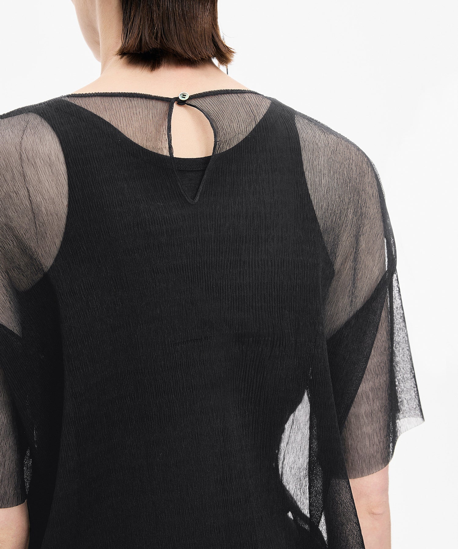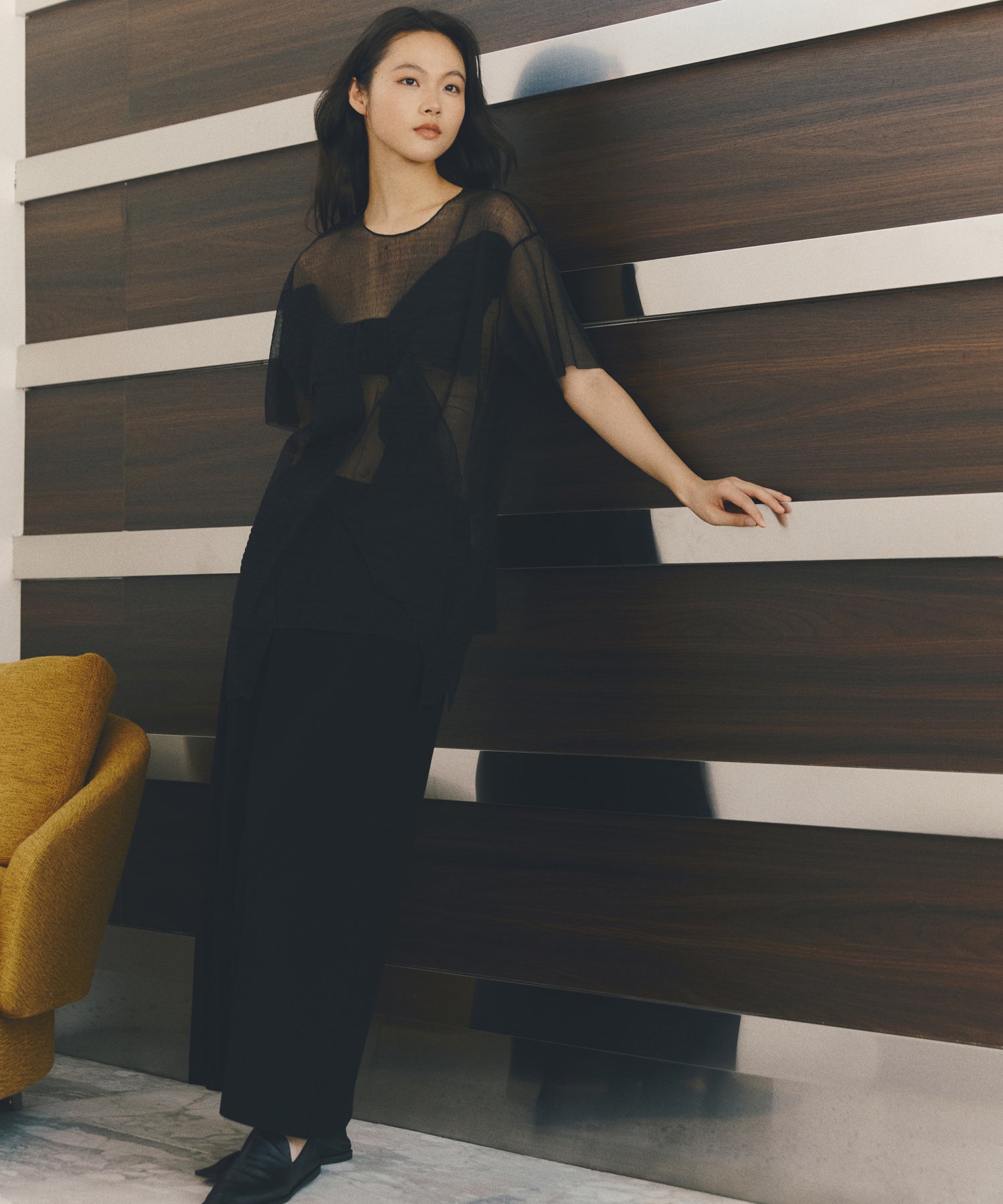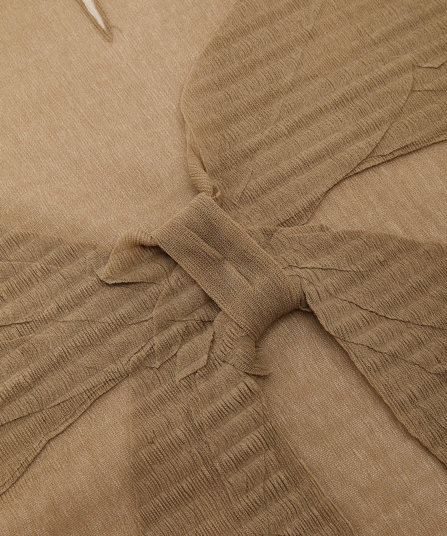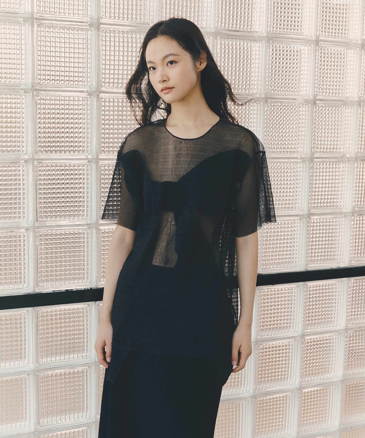 フロントのリボンディテールが目を引く、軽やかなオーガンジートップス。繊細な楊柳オーガンジーにリボンモチーフをあしらい、シンプルな中にも華やぎを添えました。インナー次第でロングシーズン着回せ、重ねるだけでこなれたレイヤードスタイルが完成。装いに奥行きと存在感をプラスする、主役級の一枚です。