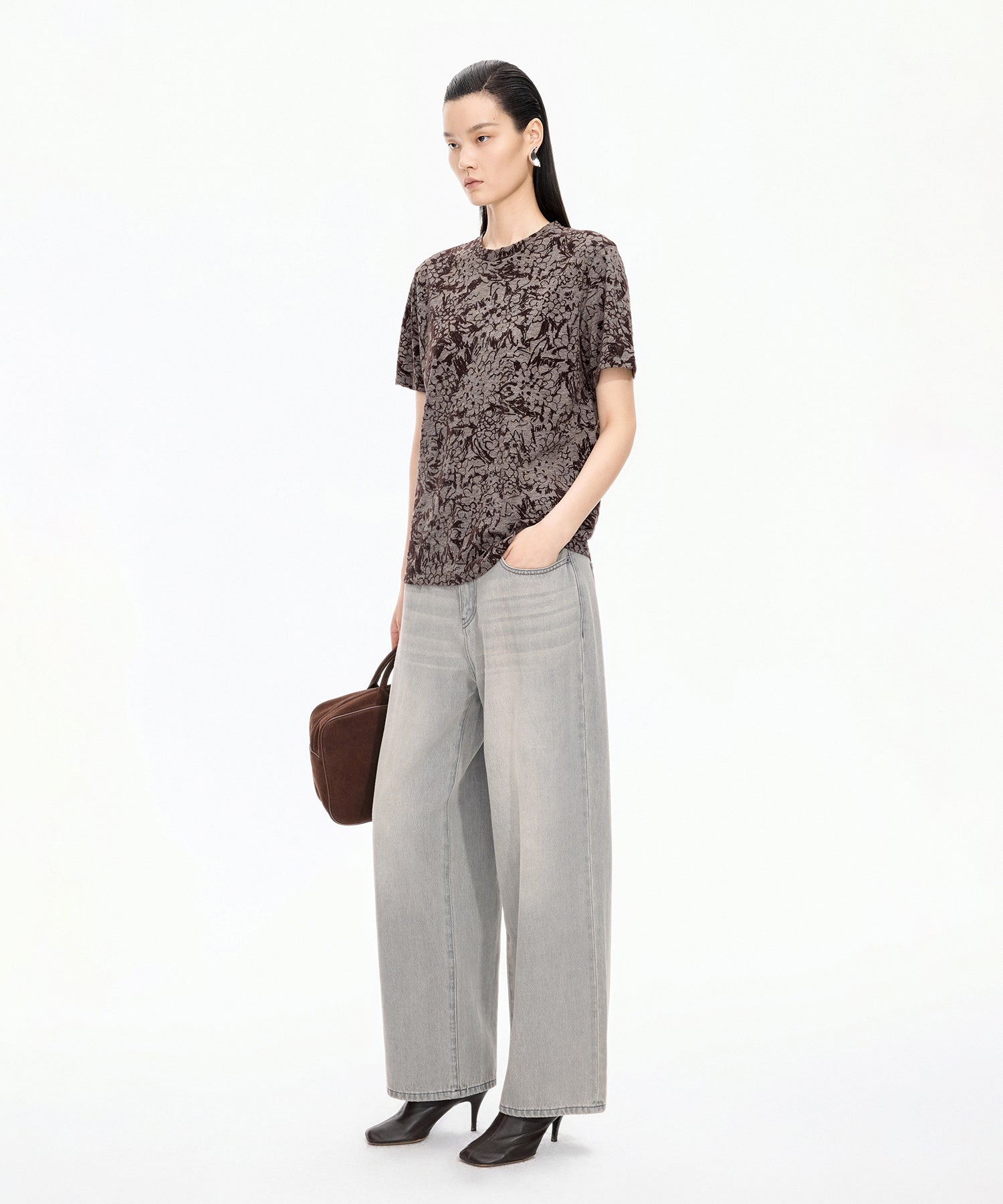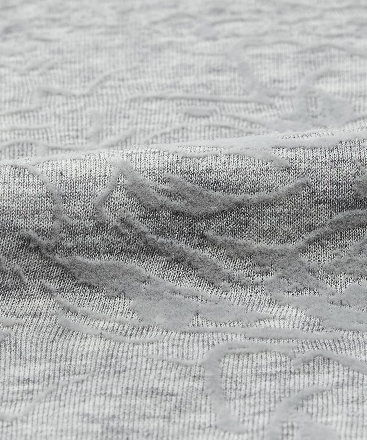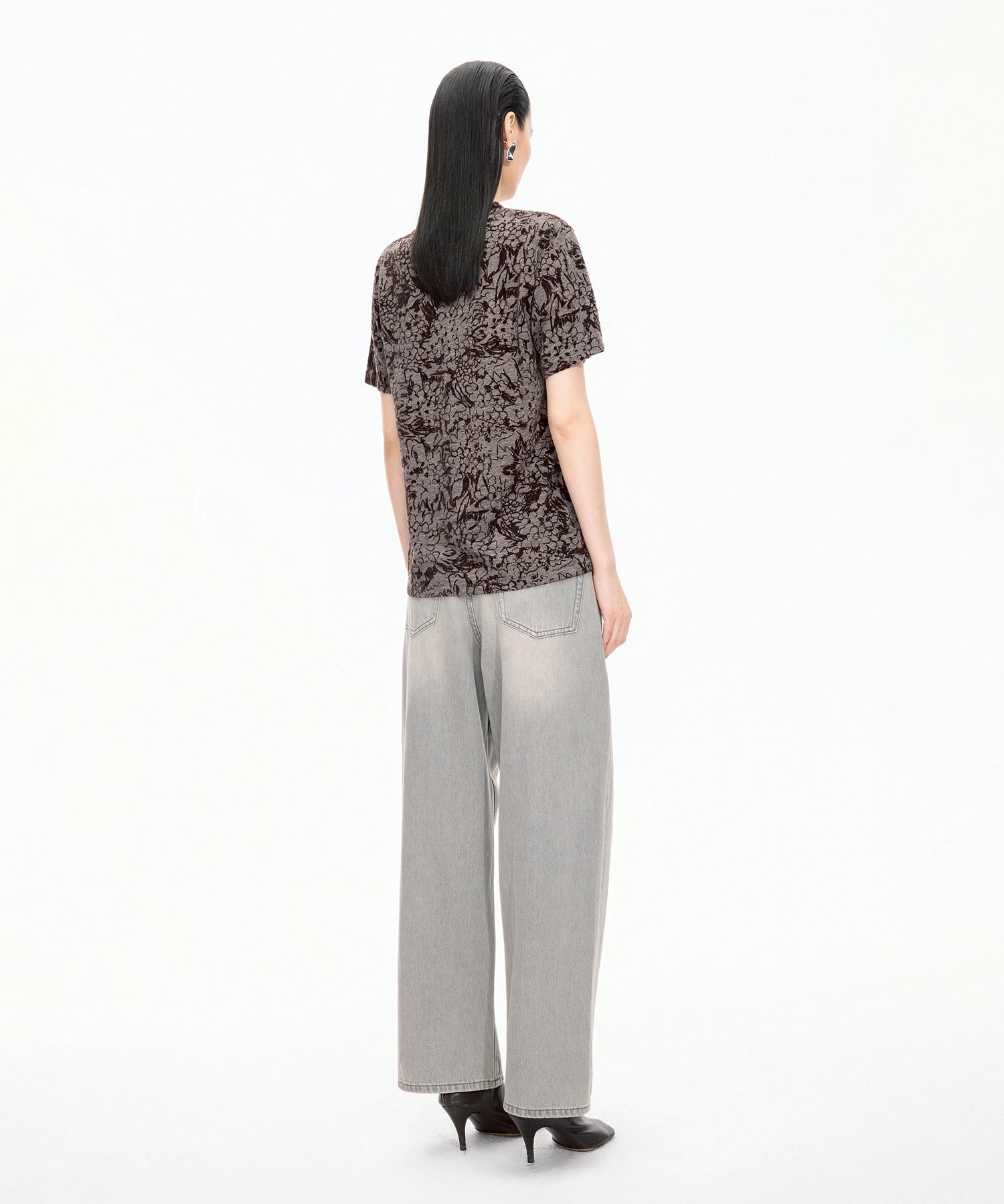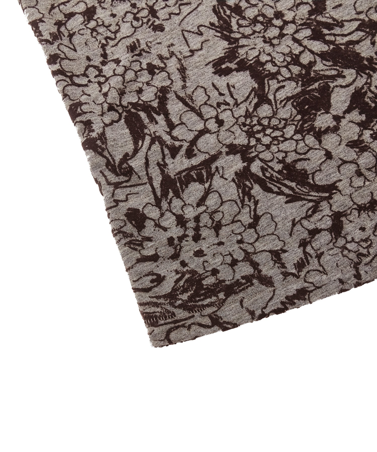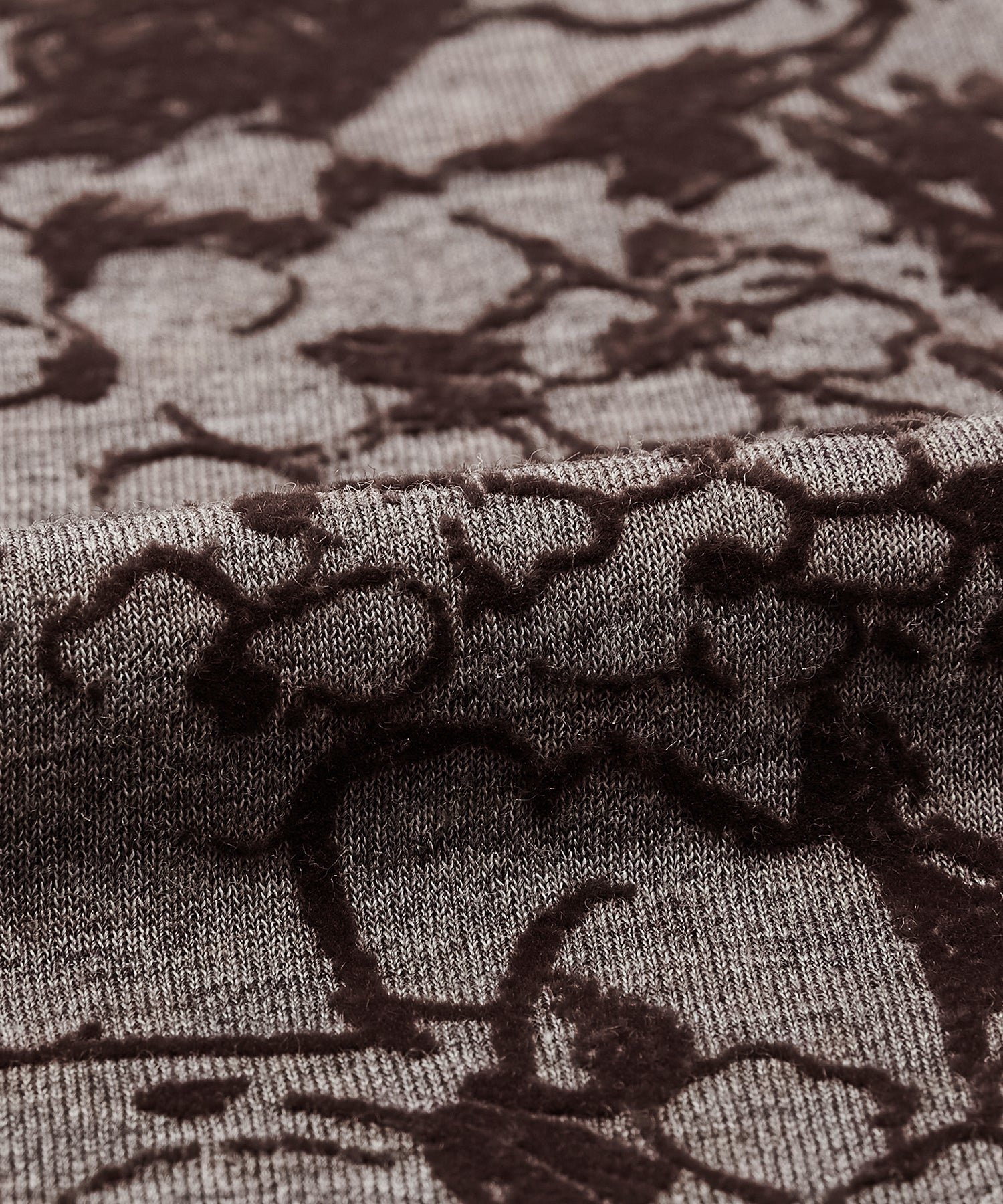 紫陽花を優雅に描いたフロッキープリントのカットソー。柔らかく通気性に優れた素材で、快適な着心地を提供します。一枚でもインナーとしても活躍する万能アイテム。スタイリッシュでモダンな印象を演出します。