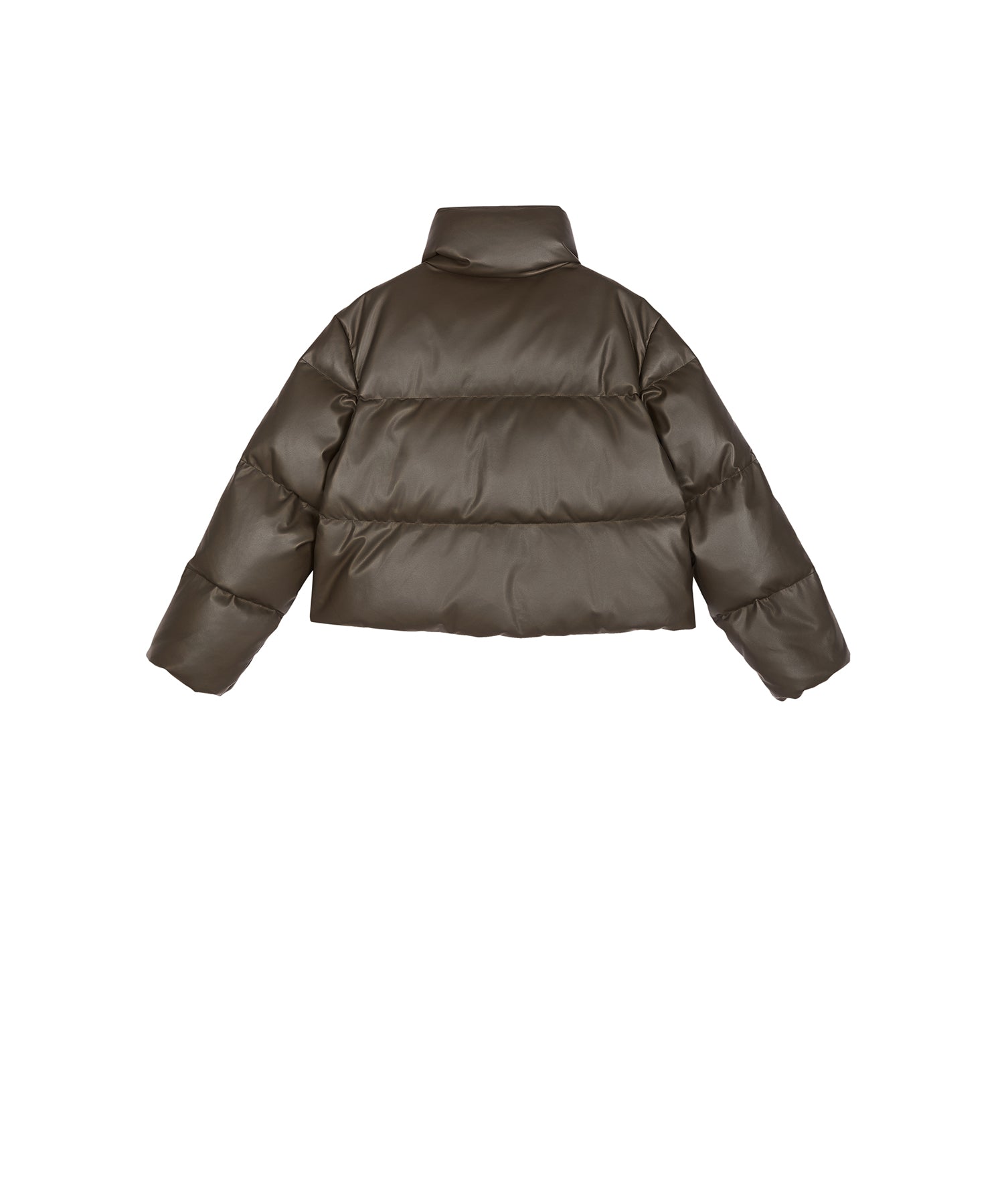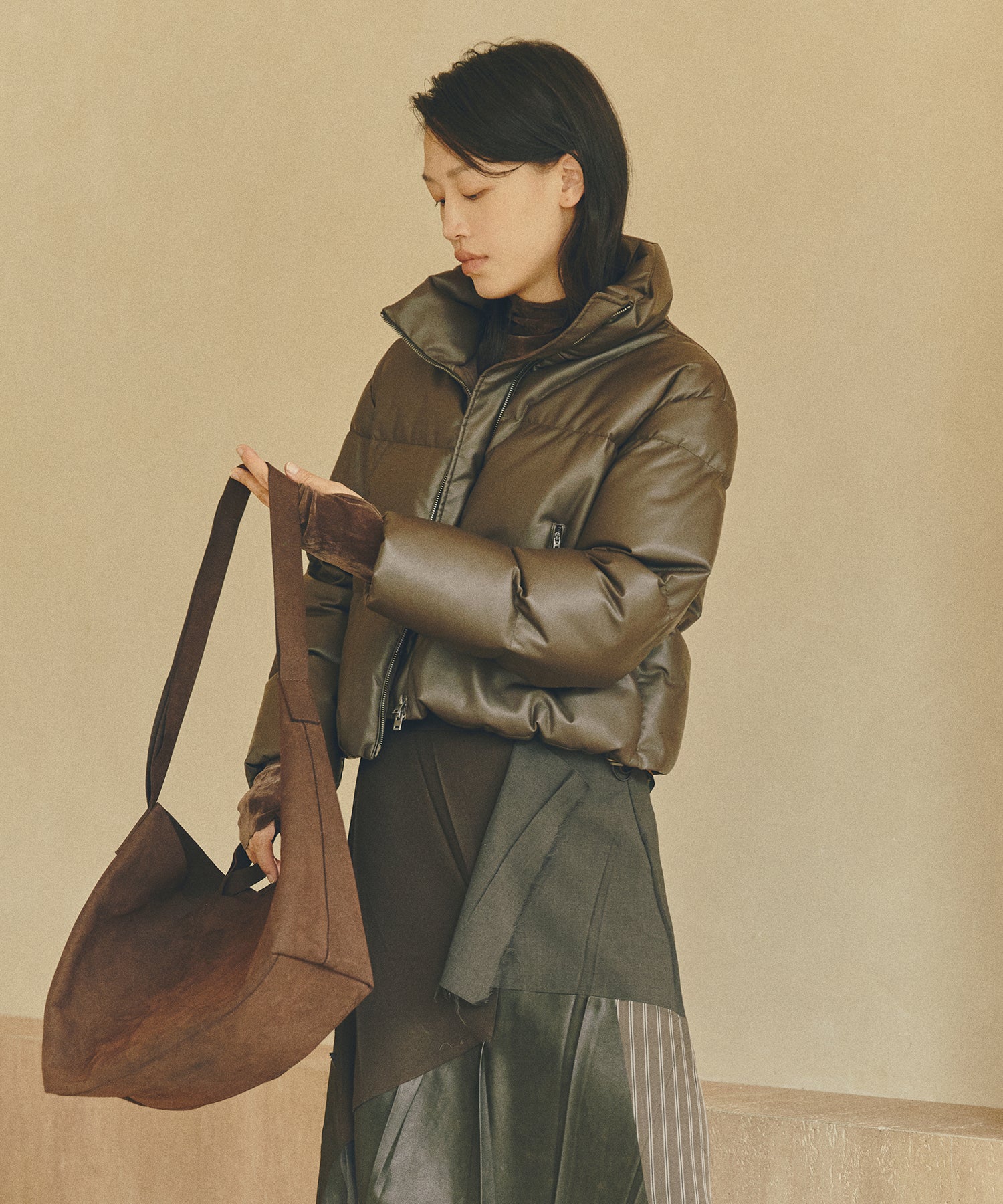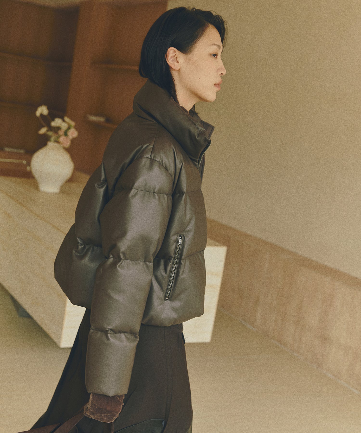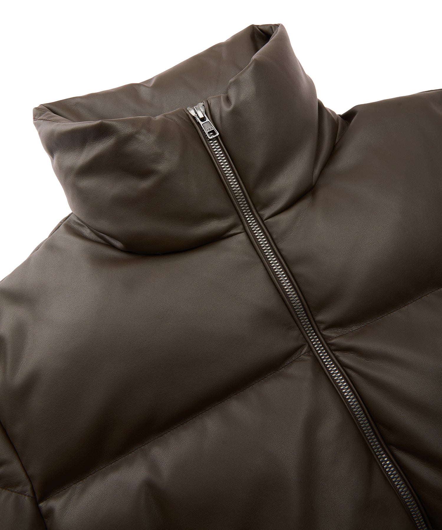 柔らかな風合いのフェイクレザーを使用したショートダウン。ダウン特有のふっくらとしたボリュームと、程よい丸みを帯びたシルエットが魅力です。ハイネック仕様で防寒性にも優れショート丈のバランスがワンピースやボリュームボトムとも好相性。シーズンスタイルをモードに仕上げる一着です。