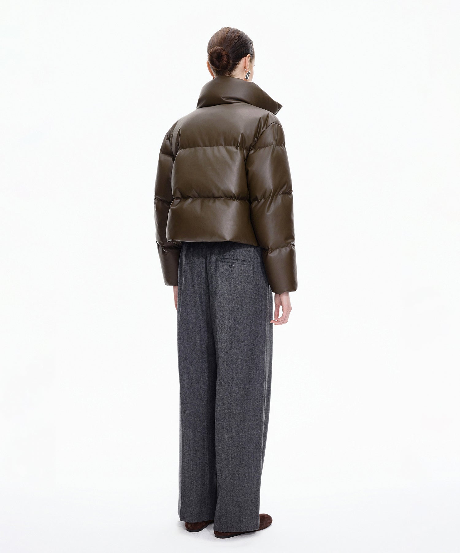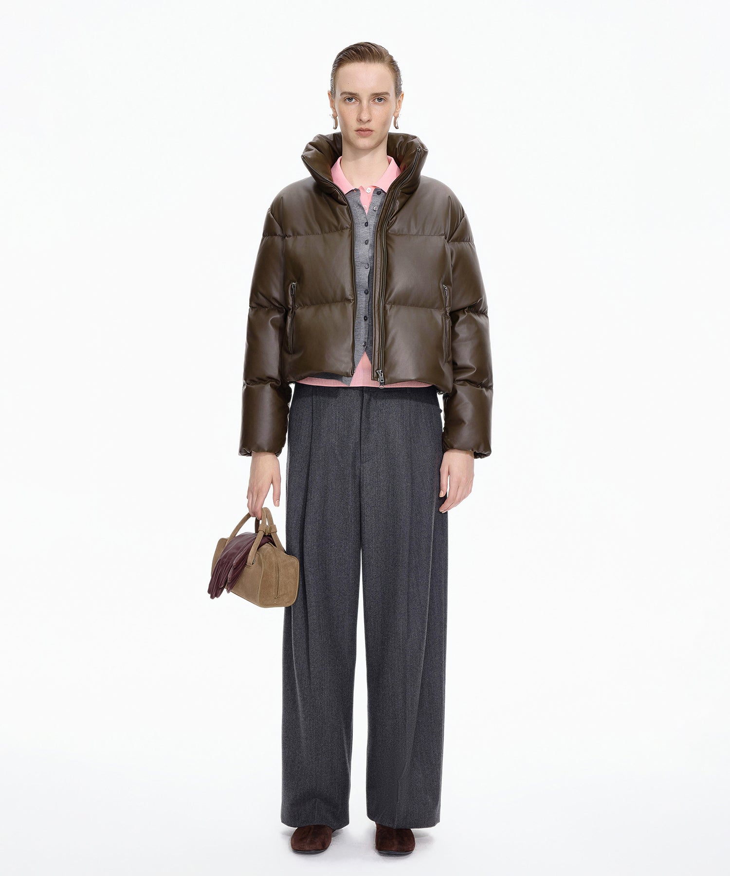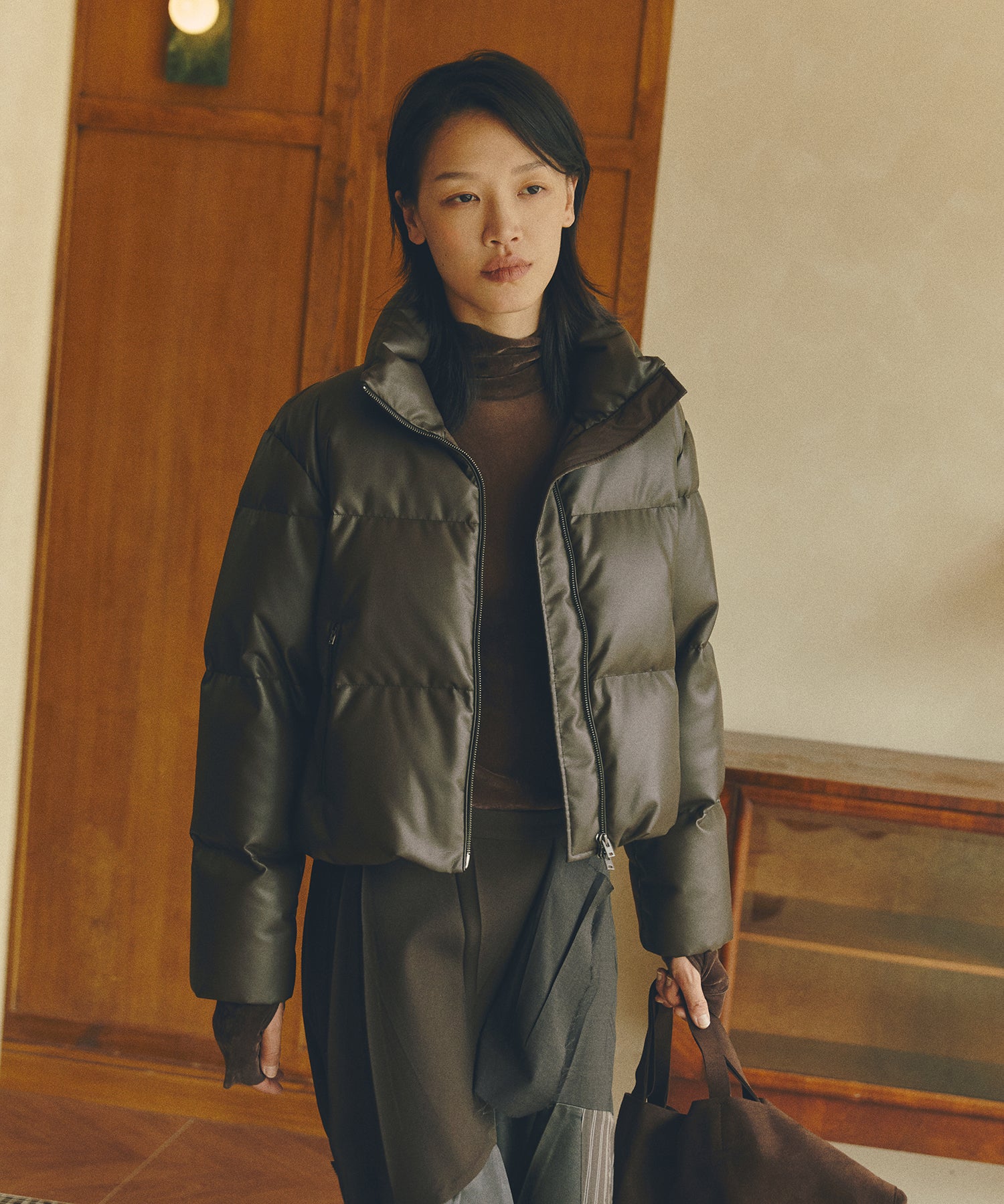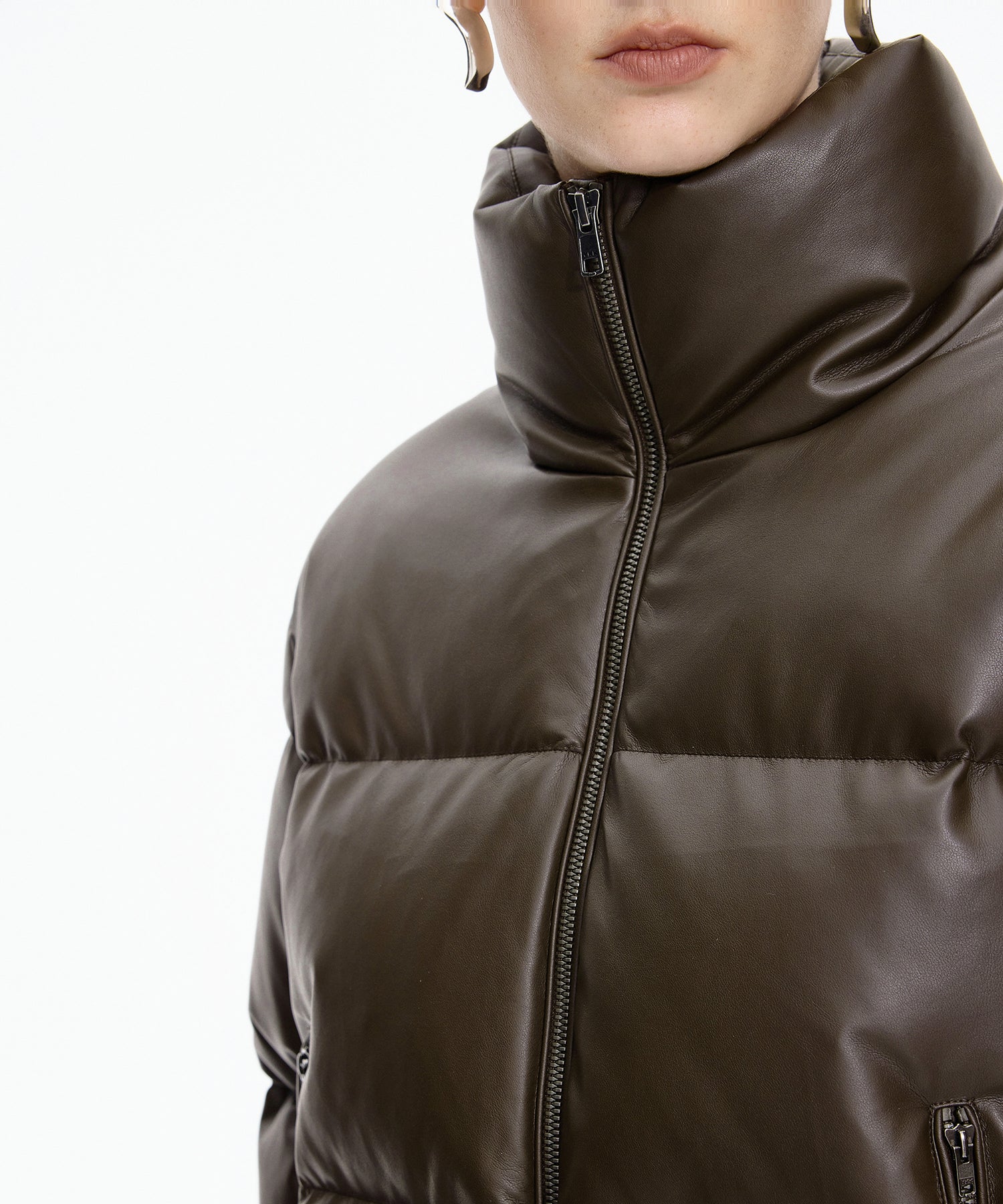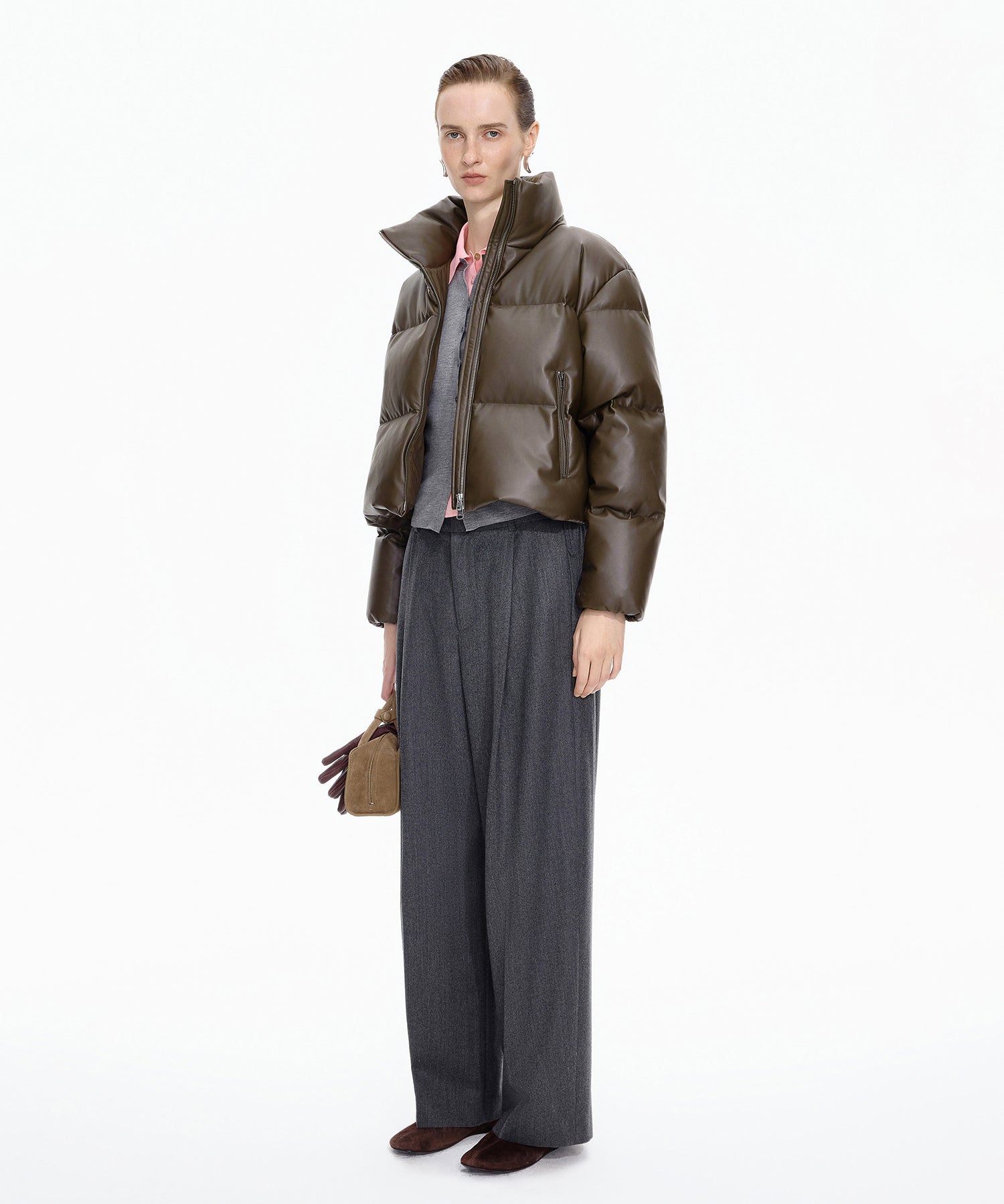 柔らかな風合いのフェイクレザーを使用したショートダウン。ダウン特有のふっくらとしたボリュームと、程よい丸みを帯びたシルエットが魅力です。ハイネック仕様で防寒性にも優れショート丈のバランスがワンピースやボリュームボトムとも好相性。シーズンスタイルをモードに仕上げる一着です。