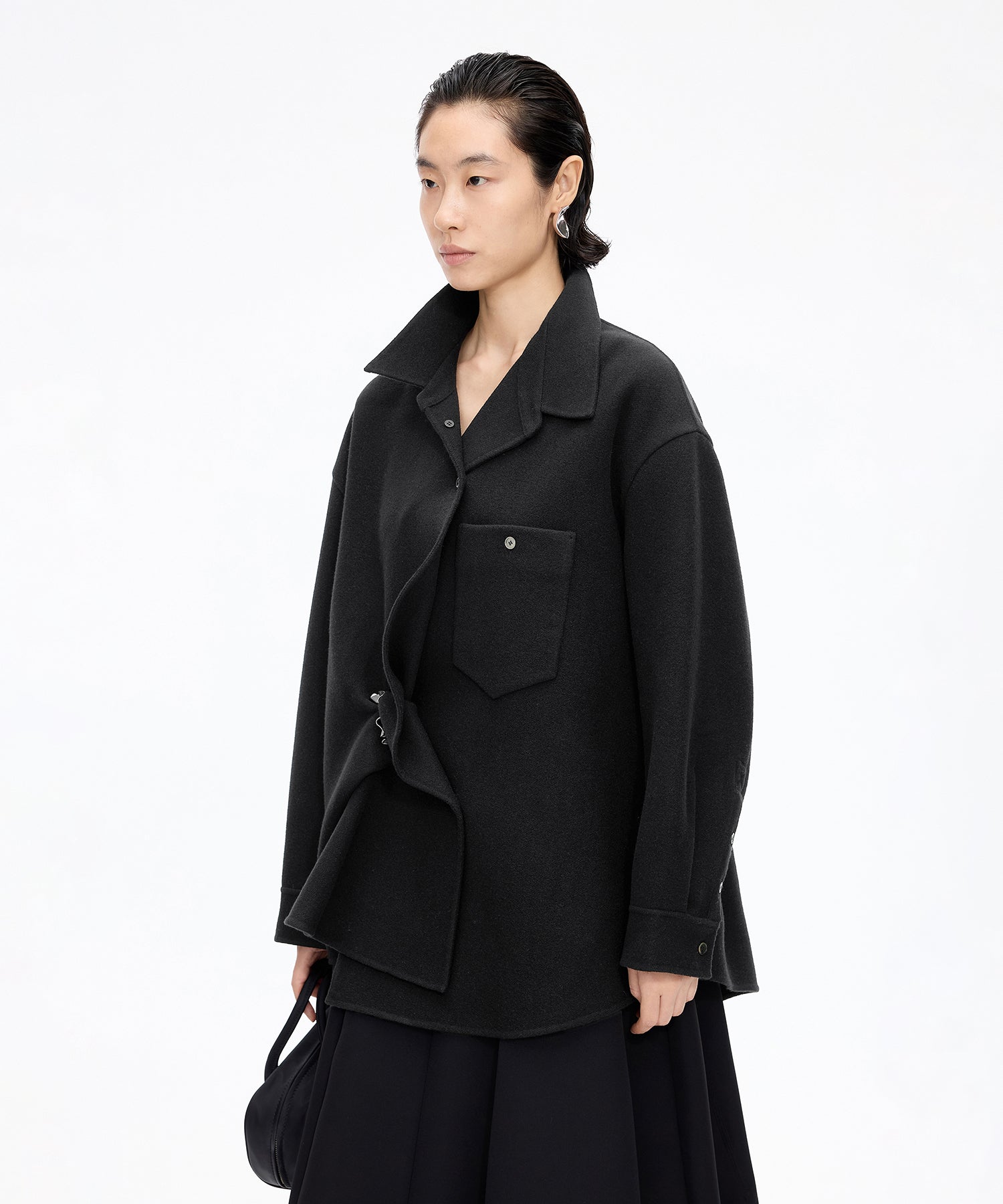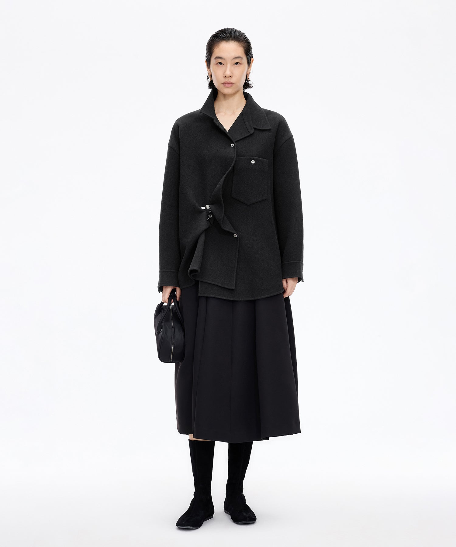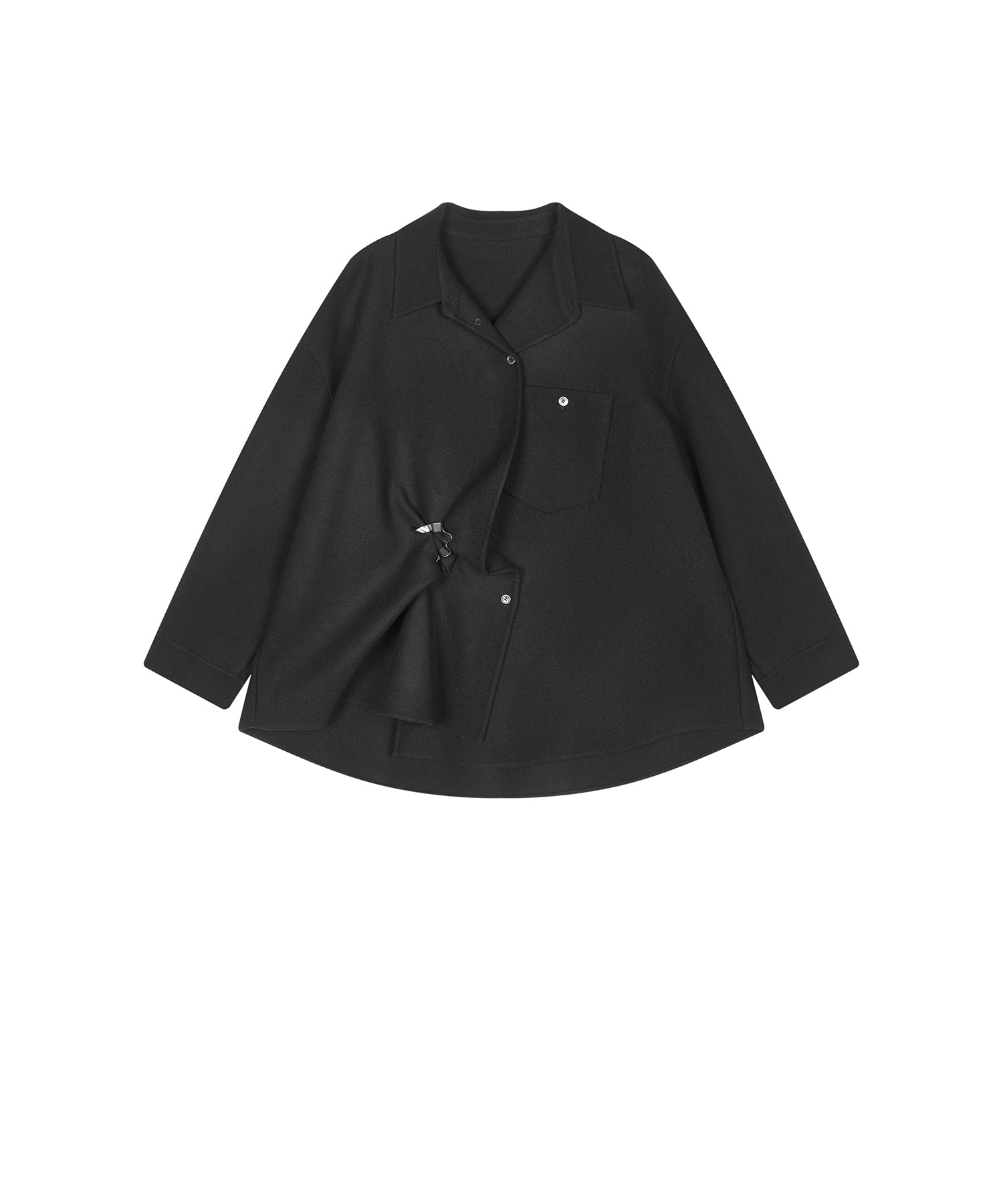 タックとドレープが織りなす立体的なシルエットが魅力の、エレガントなシャツジャケット。洗練されたデザインがスタイリングを格上げし、モードな雰囲気を漂わせます。デイリーにはもちろん、ドレスシーンにも映える一着。シルバーの金具は取り外し可能で、シーンに合わせた着こなしを楽しめます。