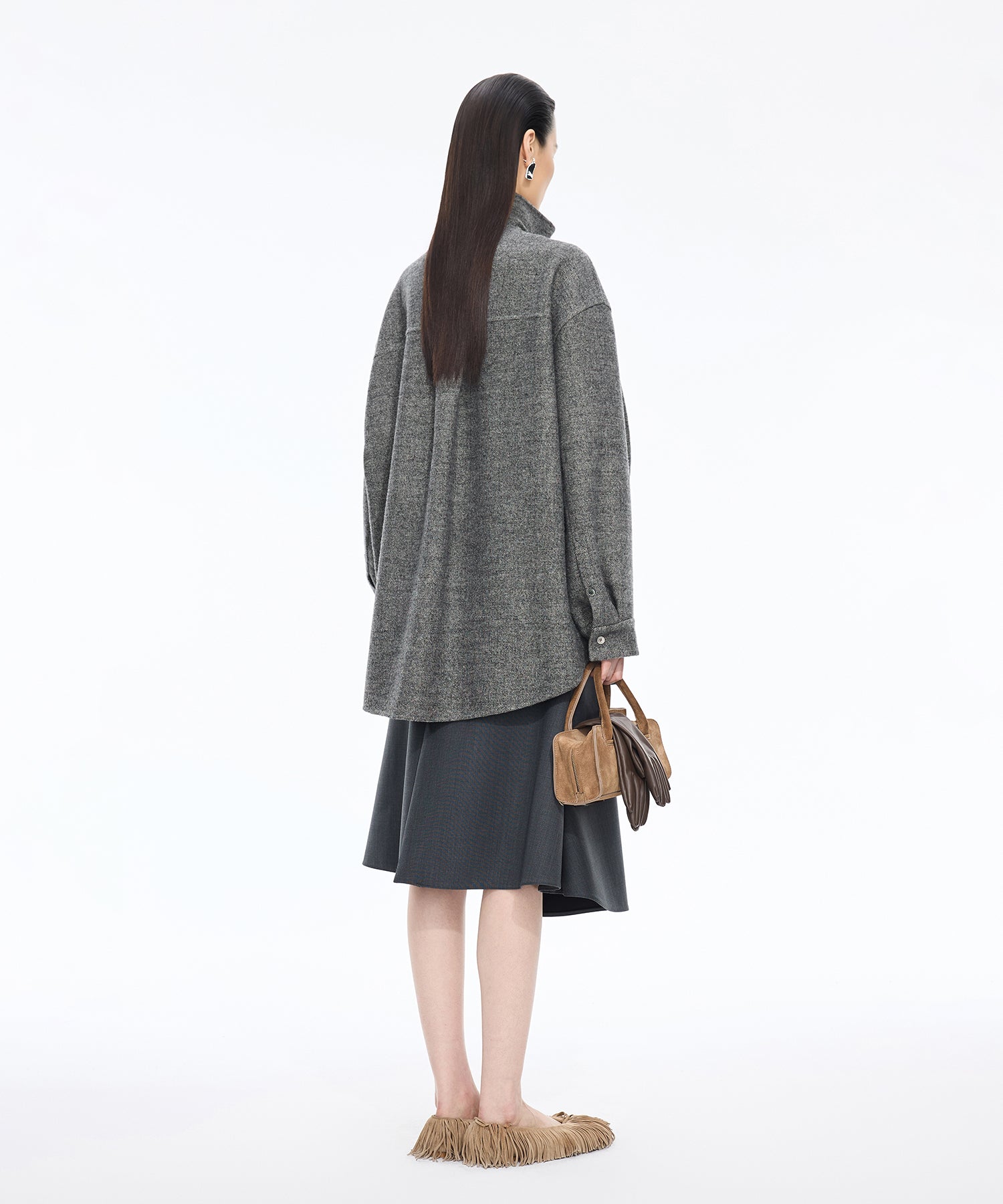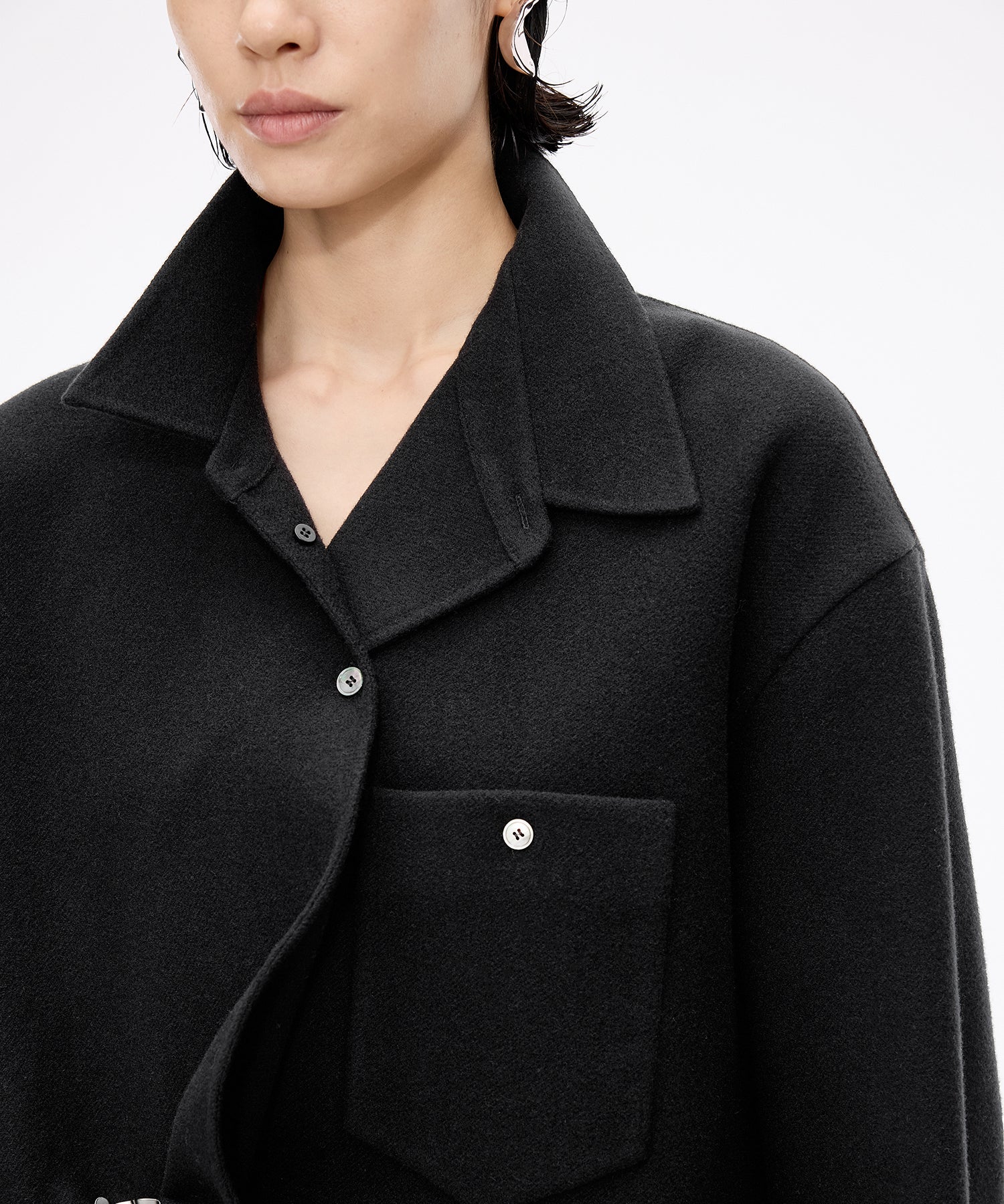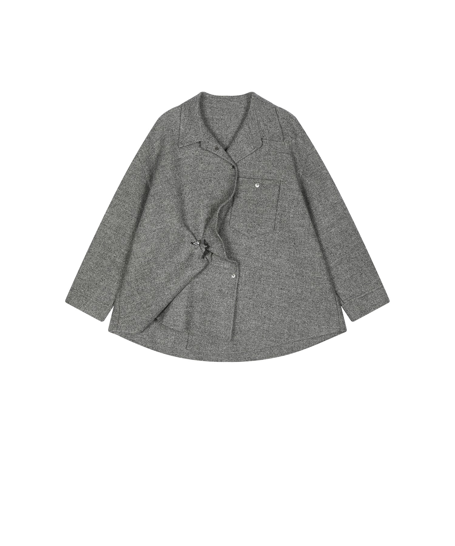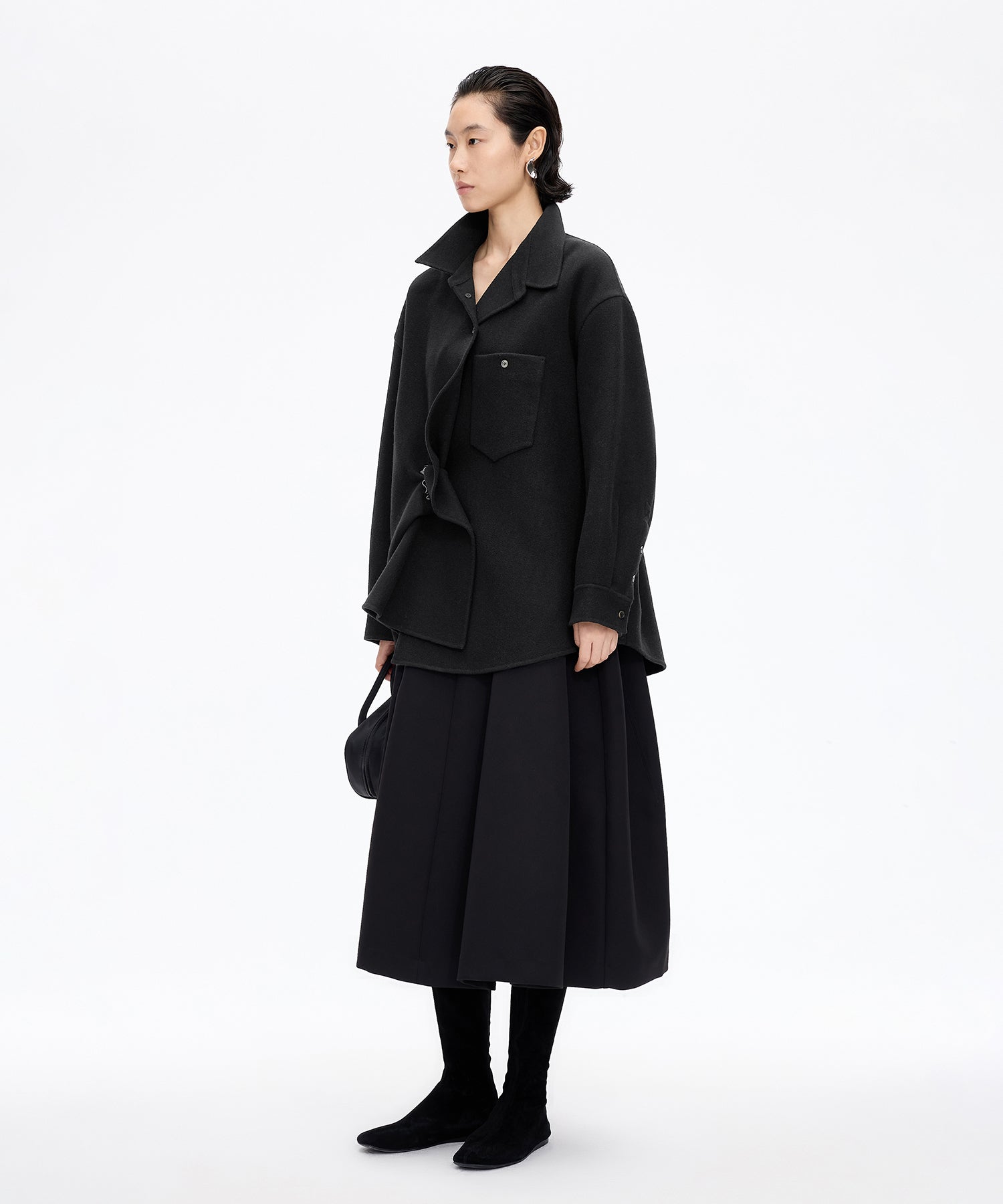 タックとドレープが織りなす立体的なシルエットが魅力の、エレガントなシャツジャケット。洗練されたデザインがスタイリングを格上げし、モードな雰囲気を漂わせます。デイリーにはもちろん、ドレスシーンにも映える一着。シルバーの金具は取り外し可能で、シーンに合わせた着こなしを楽しめます。