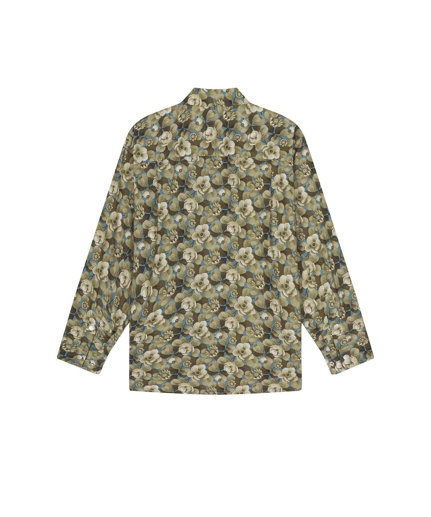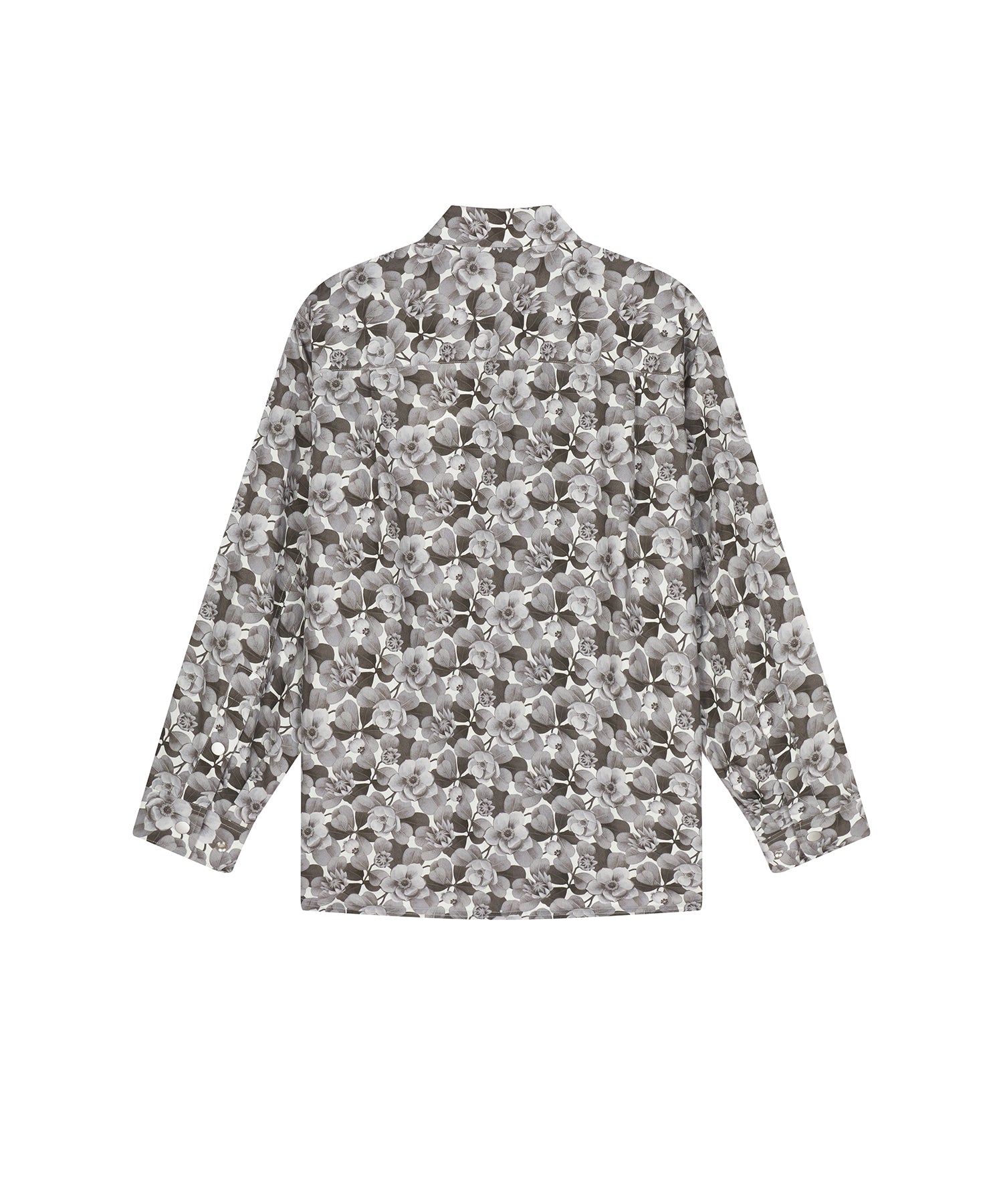 リバティプリントが映えるプラケットシャツ。スナップボタン仕様で着脱もスムーズ。程よいハリとコシのある生地感で、シャツとしてはもちろん、ジャケット感覚で羽織れる一枚です。