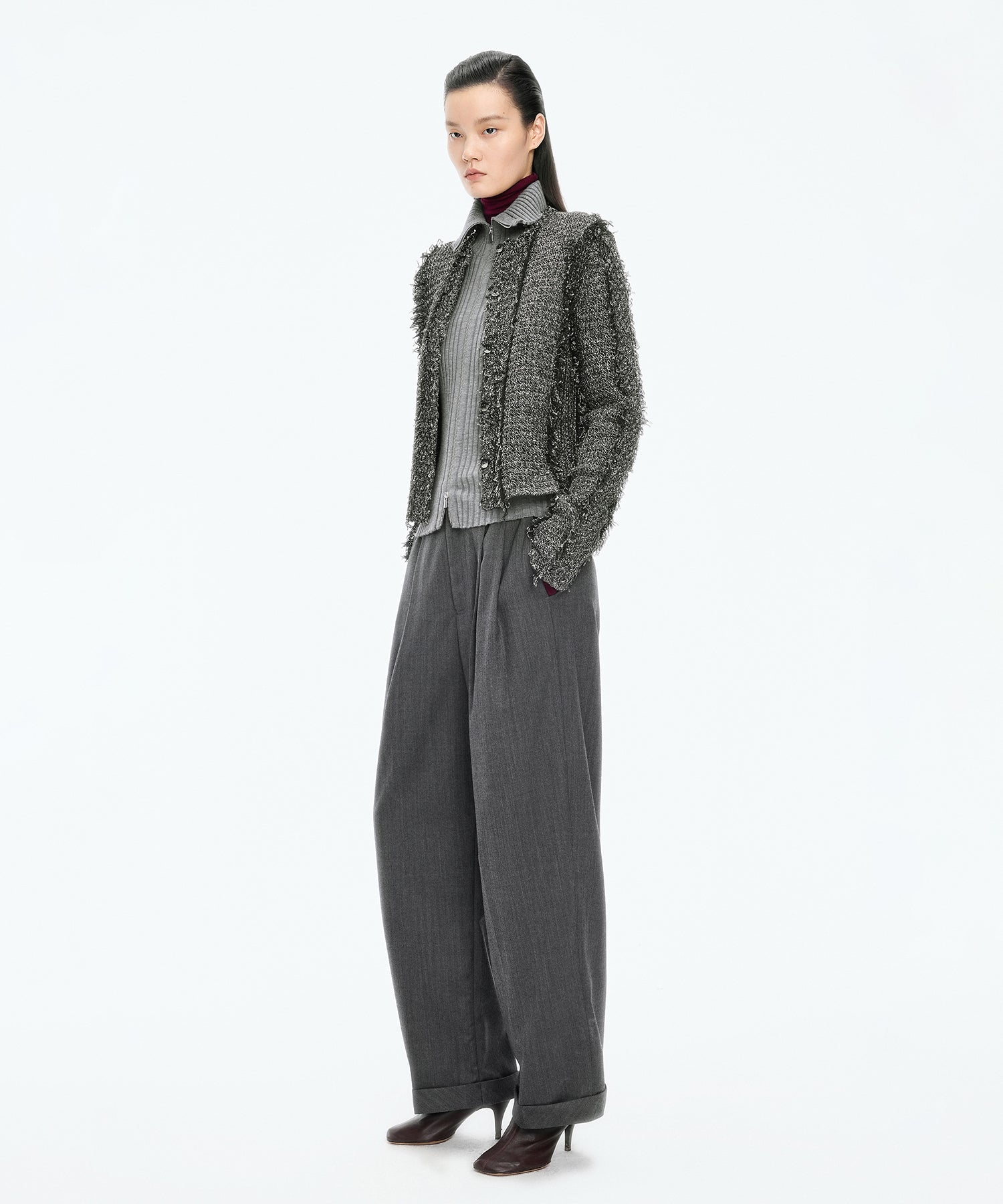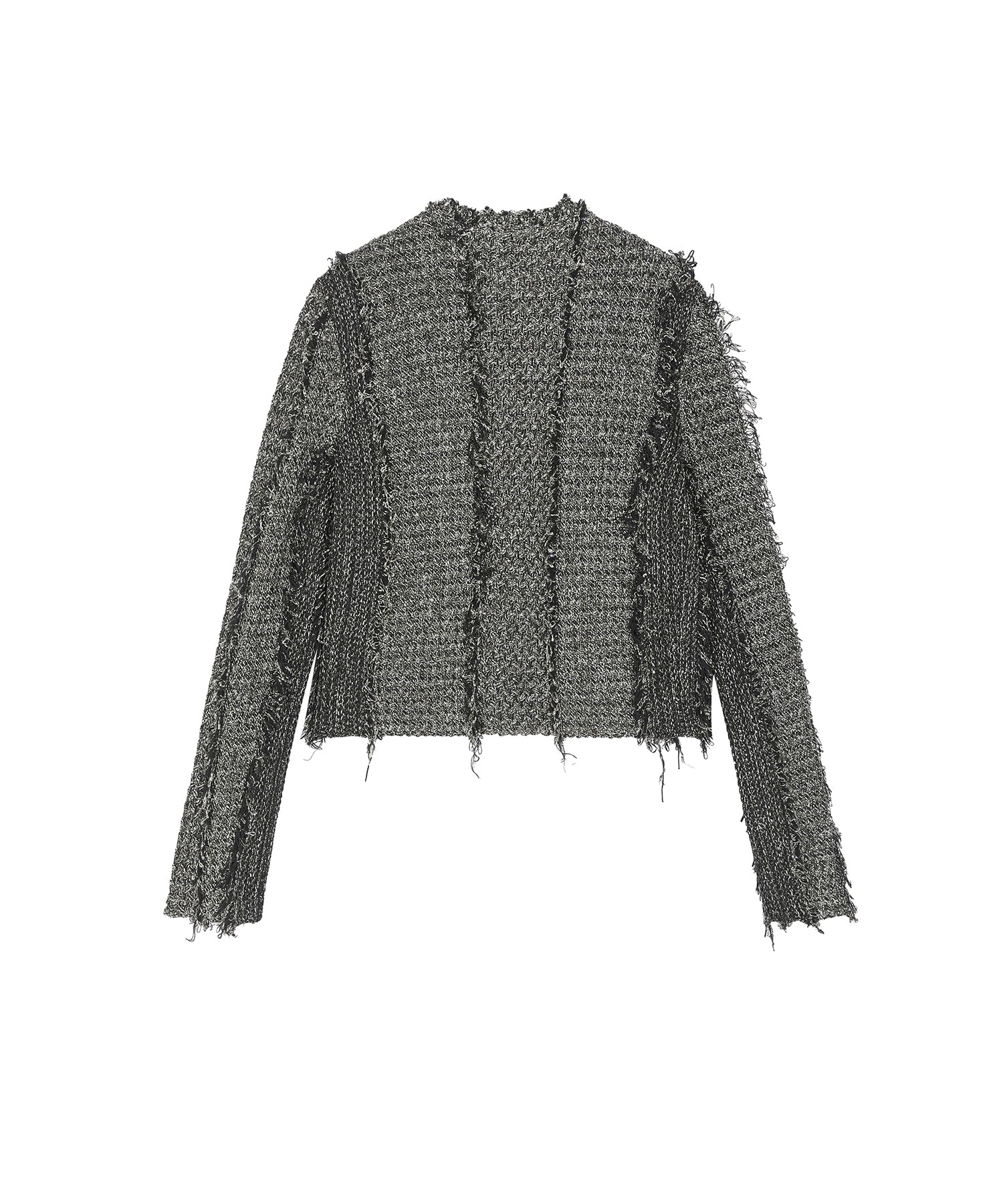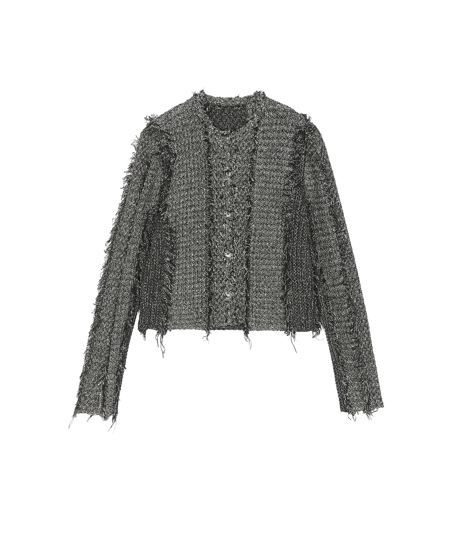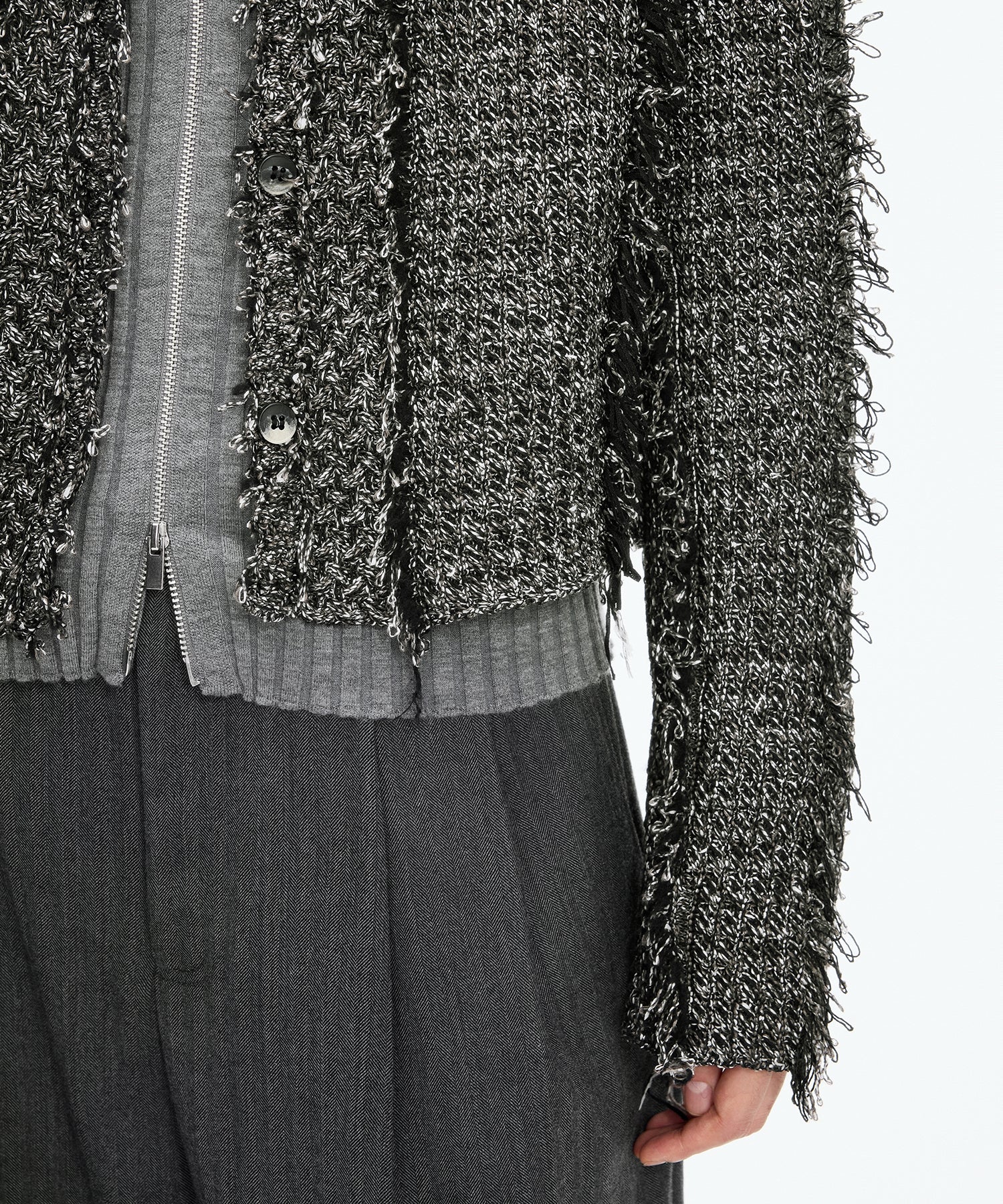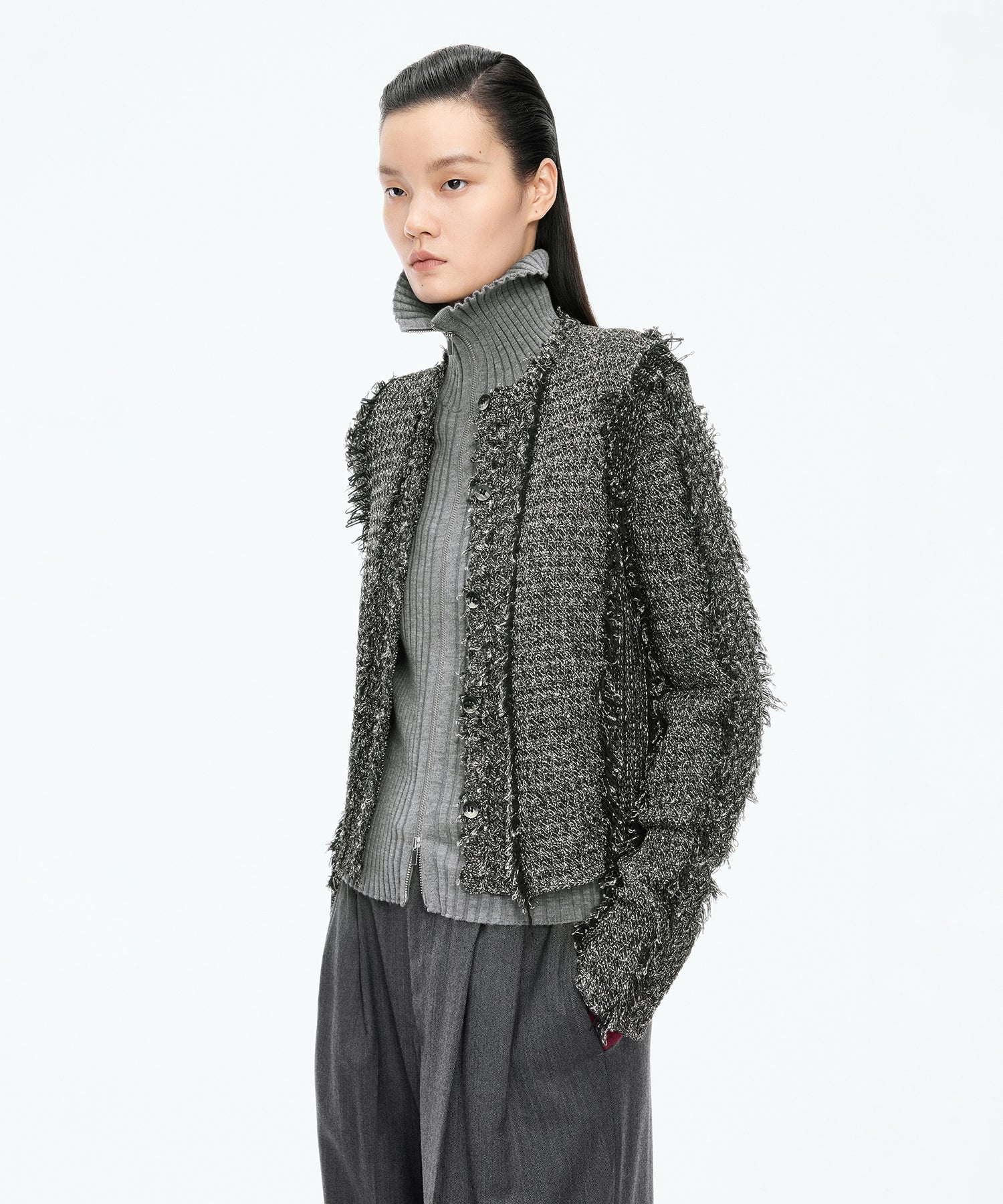 ヴィンテージライクなツイード風フリンジジャケット。数種類の糸を織り交ぜた独特の風合いが、豊かな表情と上品な華やぎを演出します。ハイウエストパンツやスカートと合わせれば、スタイルアップと共にワンランク上の着こなしが完成。羽織るだけで洗練を添える、大人のための一着です。