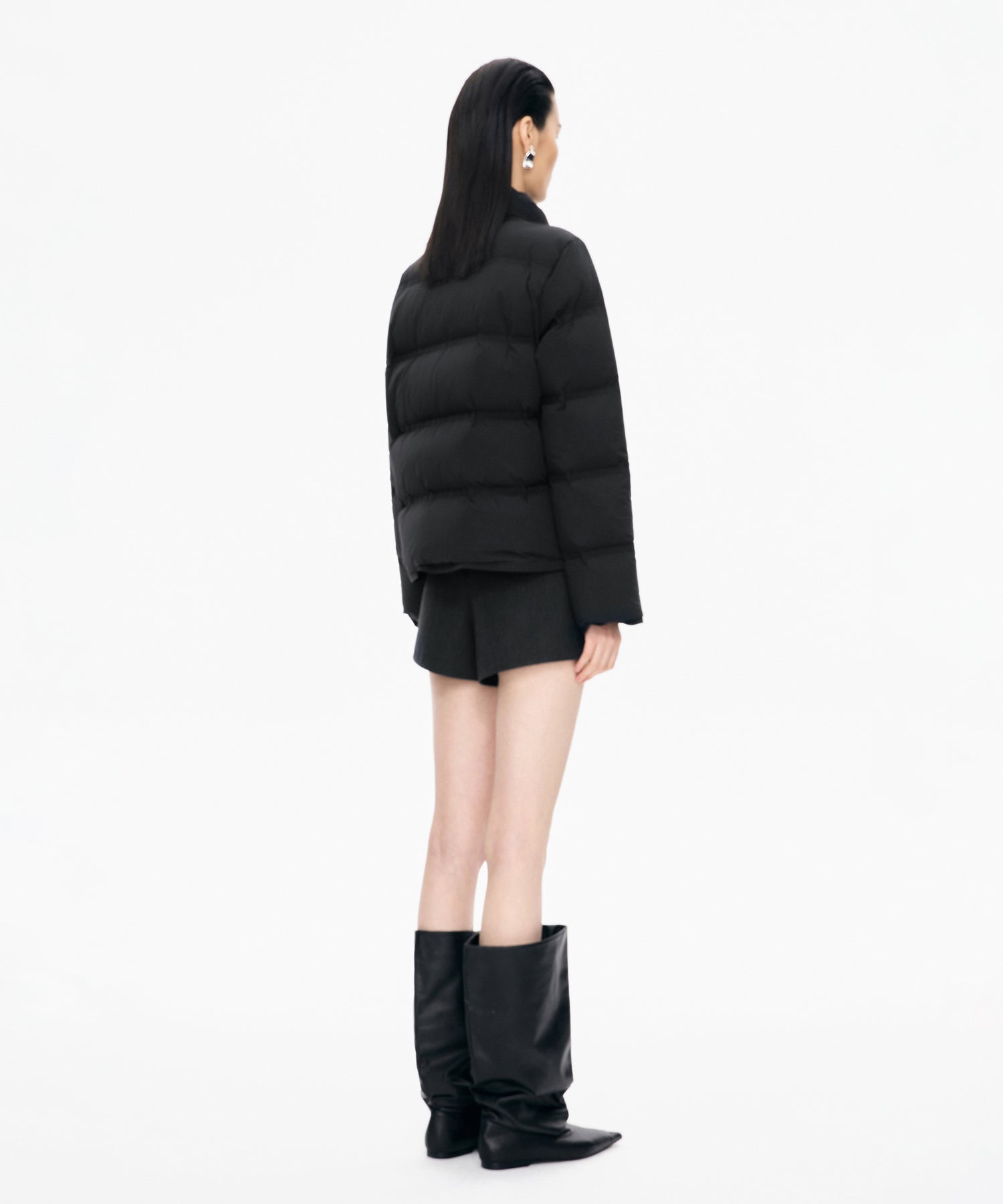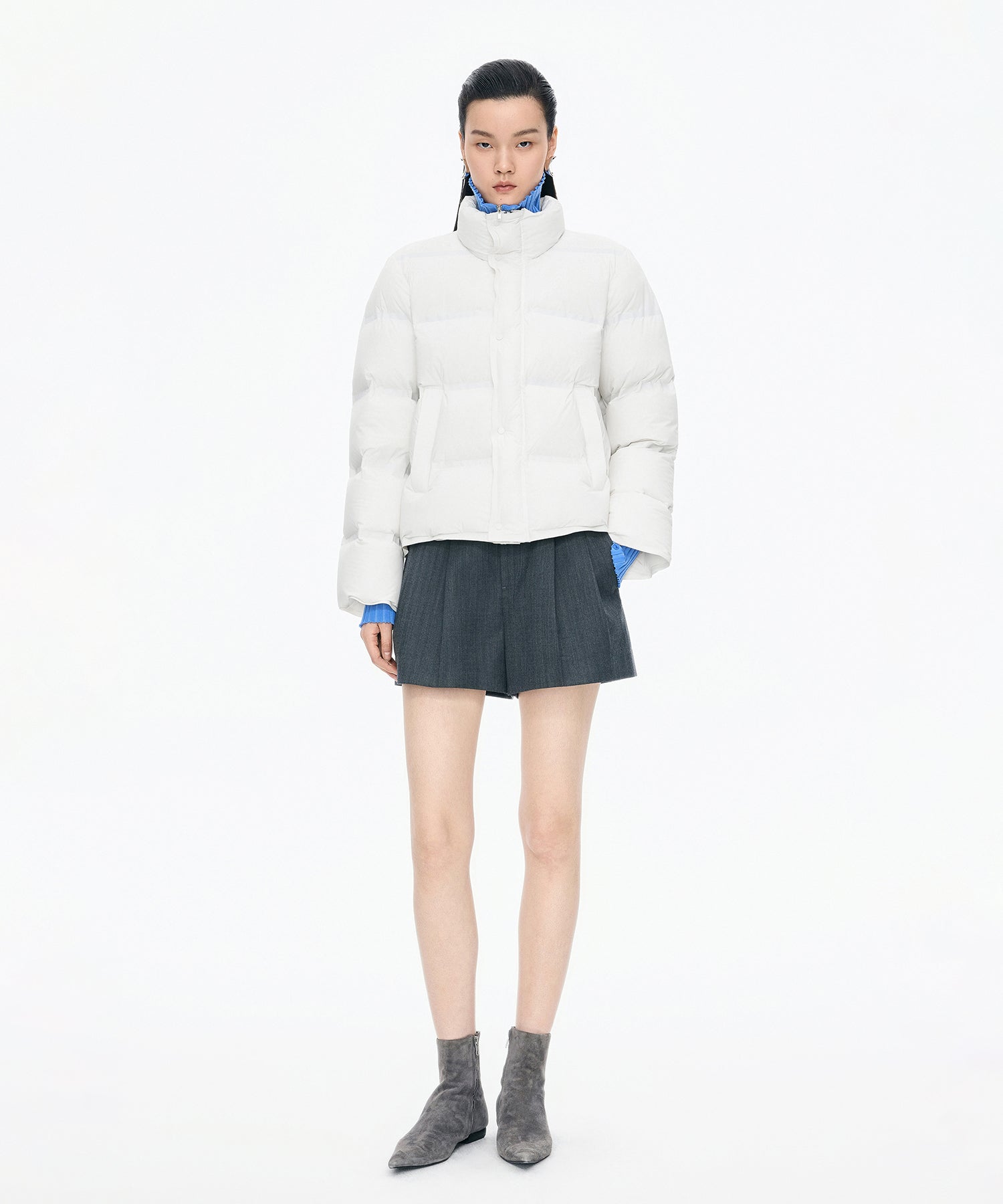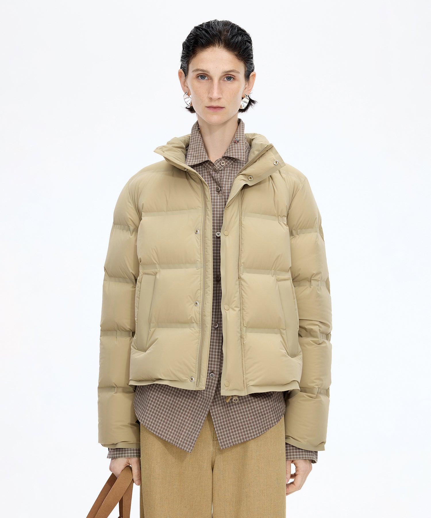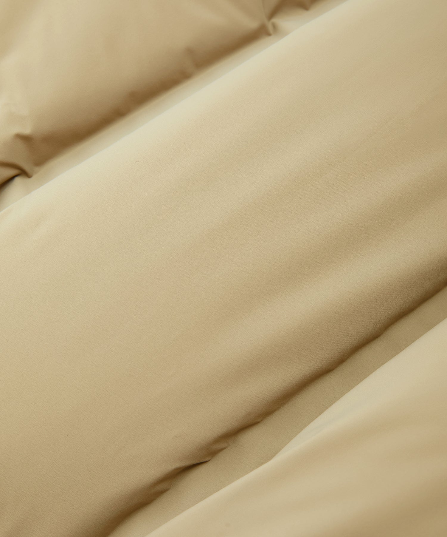 マットな質感が上品なダウンジャケット。軽やかな着心地と優れた保温性を兼ね備え、シンプルで洗練されたデザインが魅力です。どんなスタイリングにも自然に馴染む、万能な一着です。