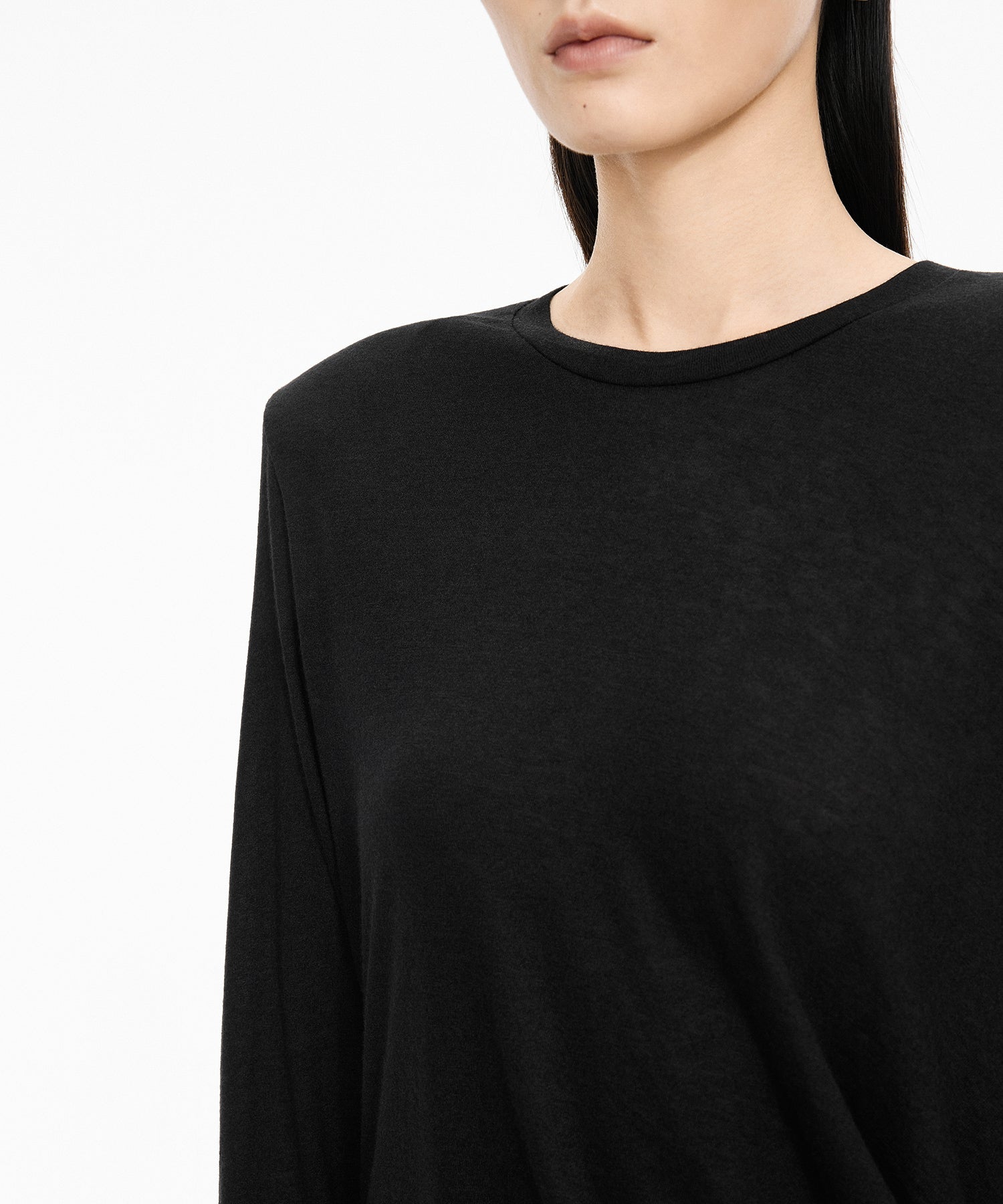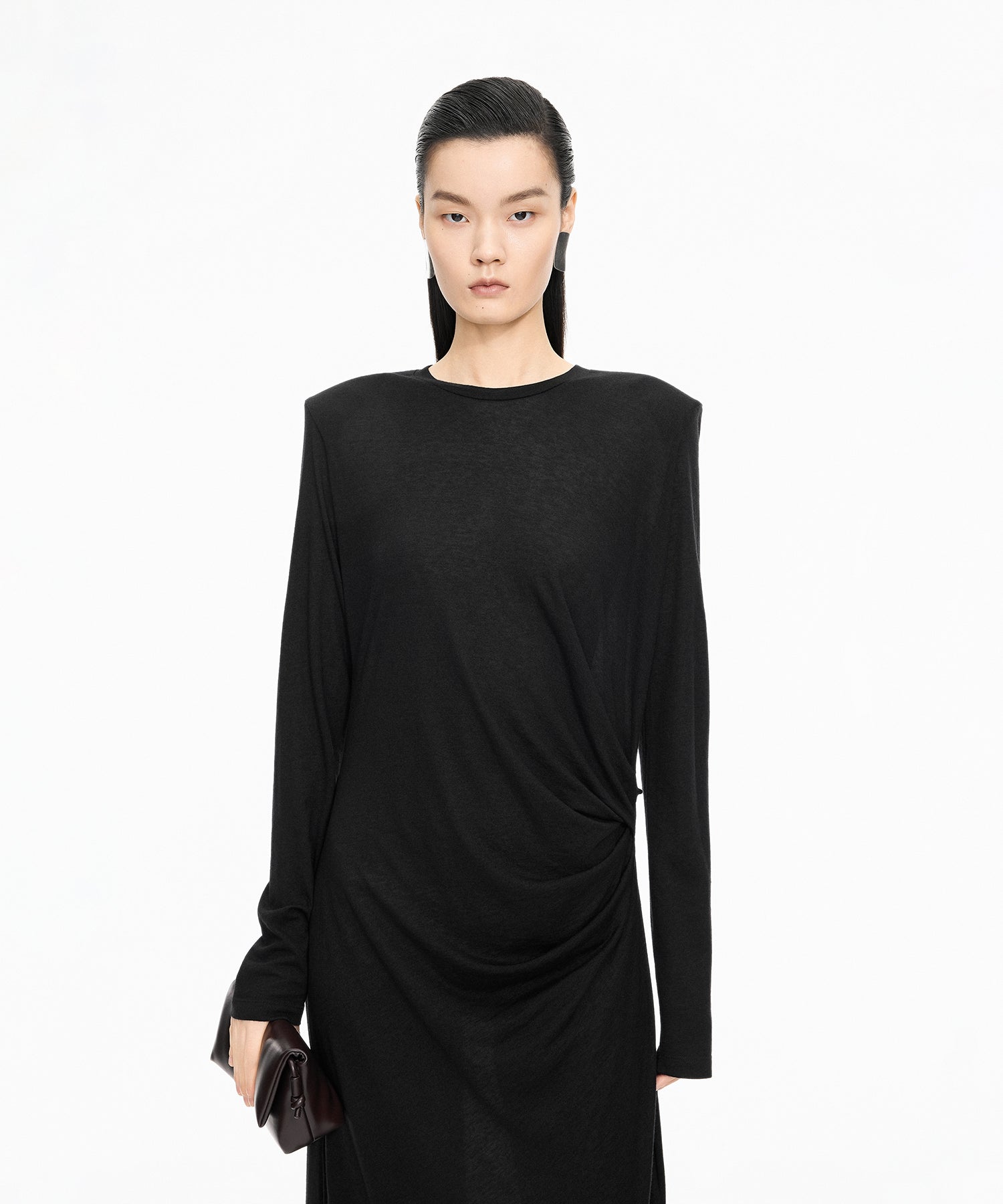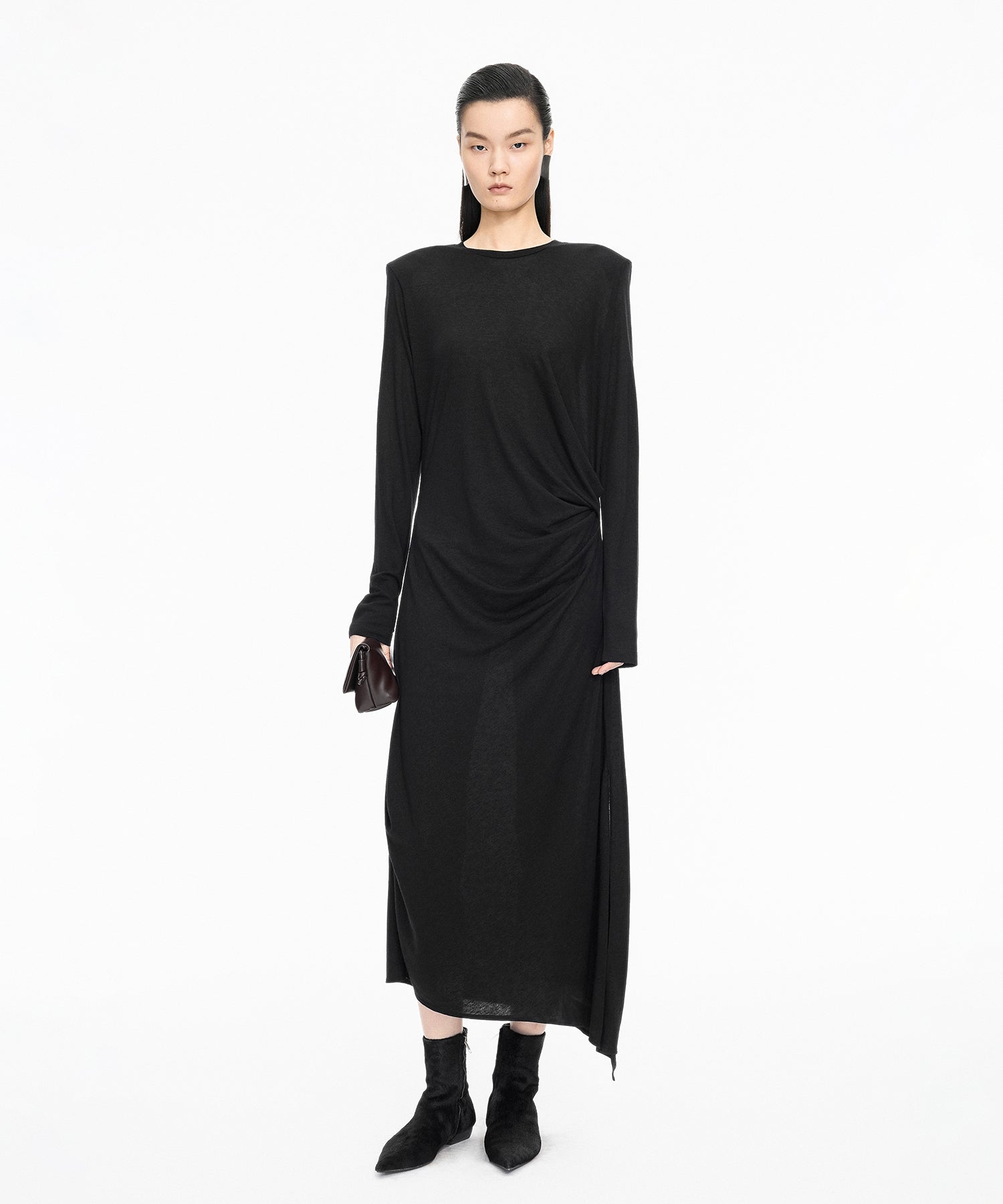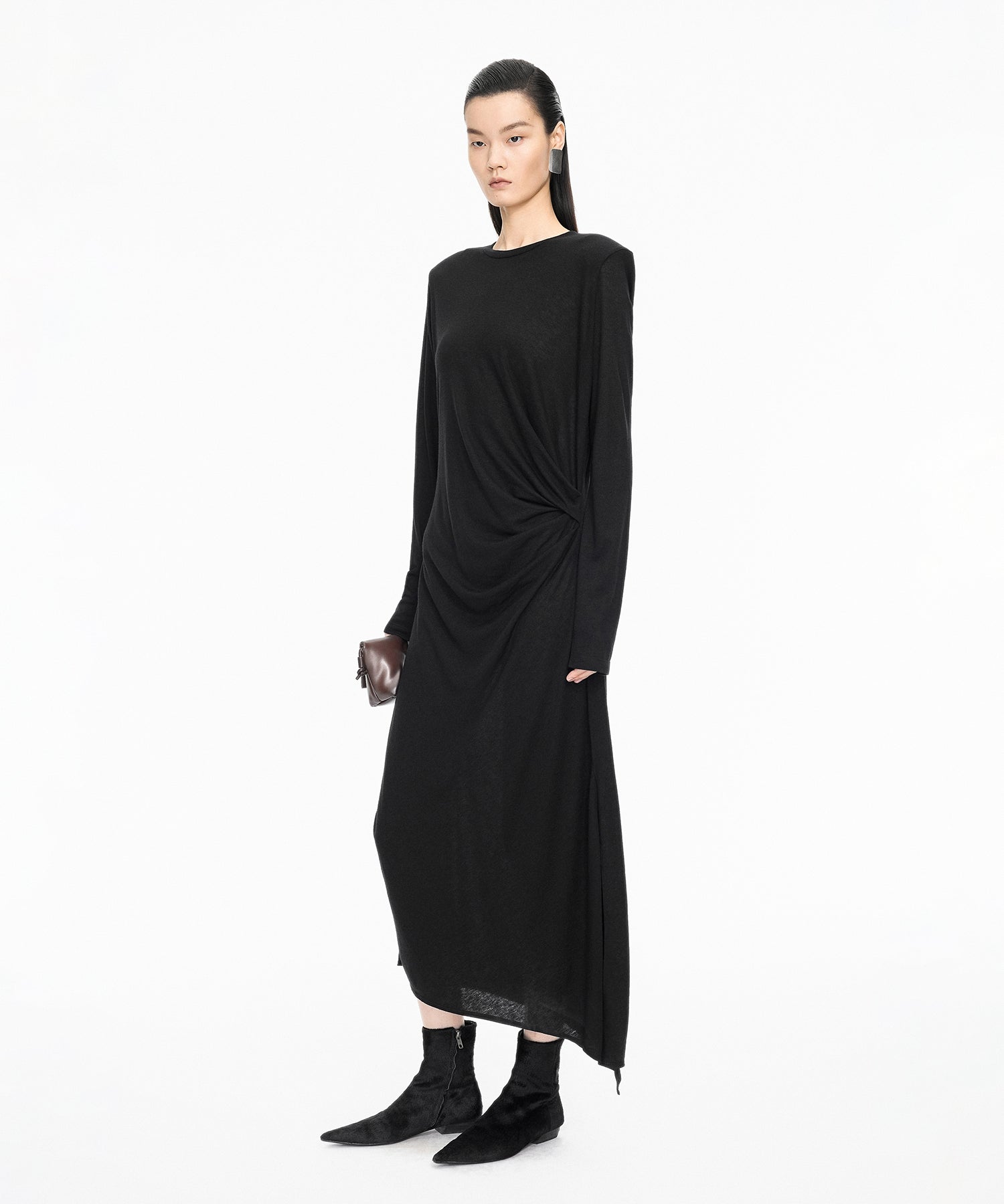 マキシ丈のエレガントなニットドレス。流れるようなドレープが美しいシルエットを描き、左裾のスリットがアシンメトリーな表情をプラスします。一枚でスタイルが完成する、モードで洗練された一着です。