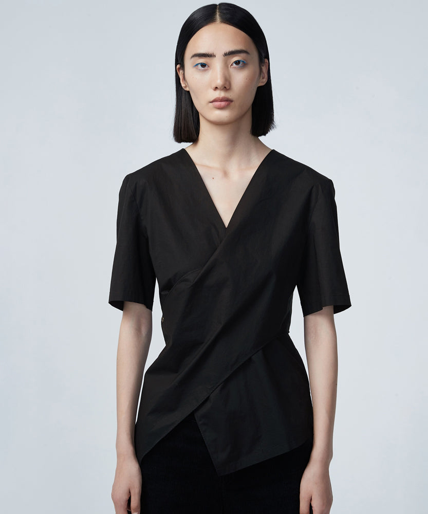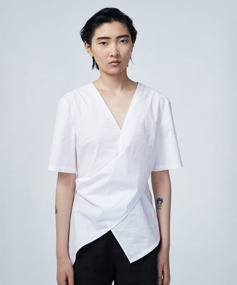絶妙なデザインのショートシャツで、Vネックデザインとウエストクロスデザインが女性らしさを高めている。伸縮性のある高密度ポプリンを使用し、手触りが良く、見た目も美しい。 洗練されたアイテムとマッチし、スタイリッシュな雰囲気を表現できる。