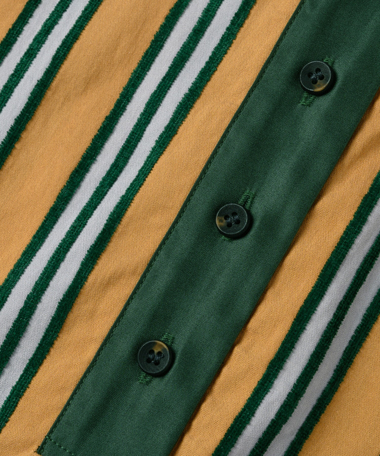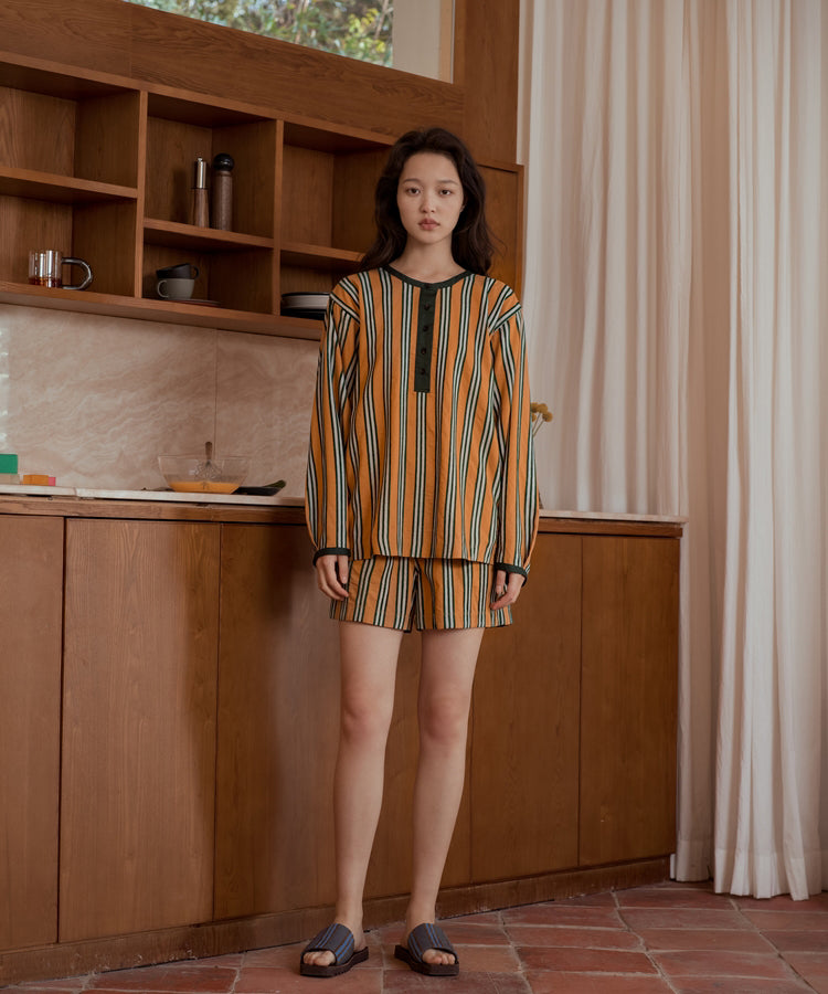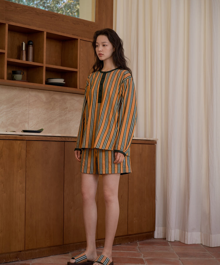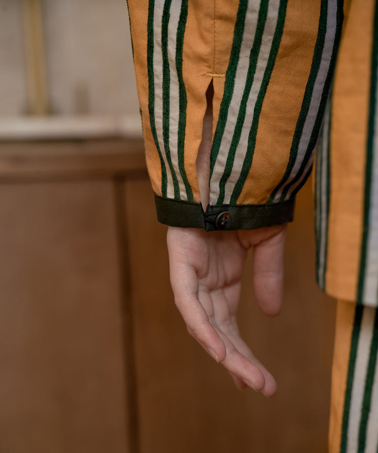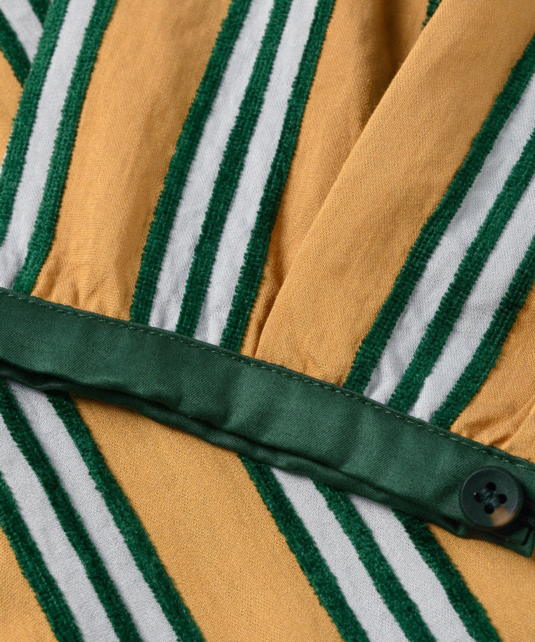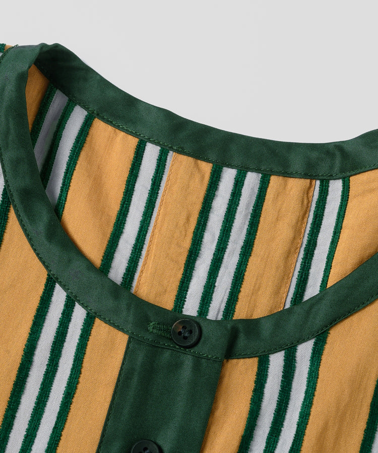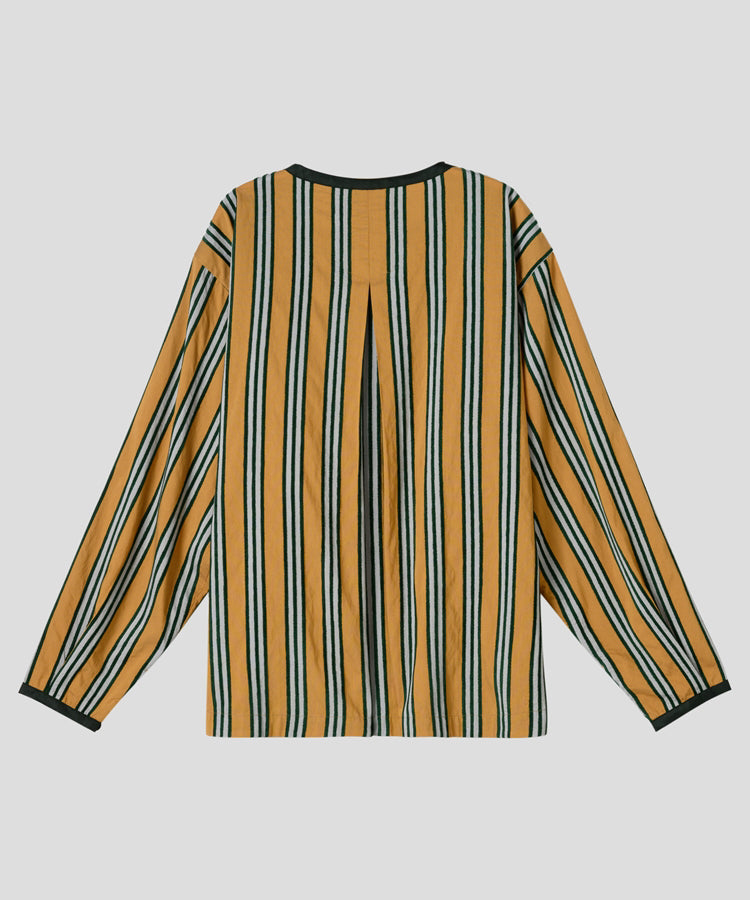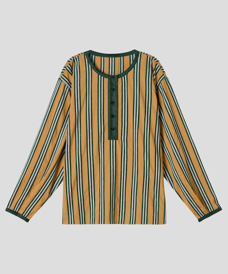 ゆったりとした着心地のプルオーバーシャツ。レトロな色合いのカラフルなシェニール織のストライプ生地。襟のストライプと前立てには、繊細なフルーツボタンを使用しています。