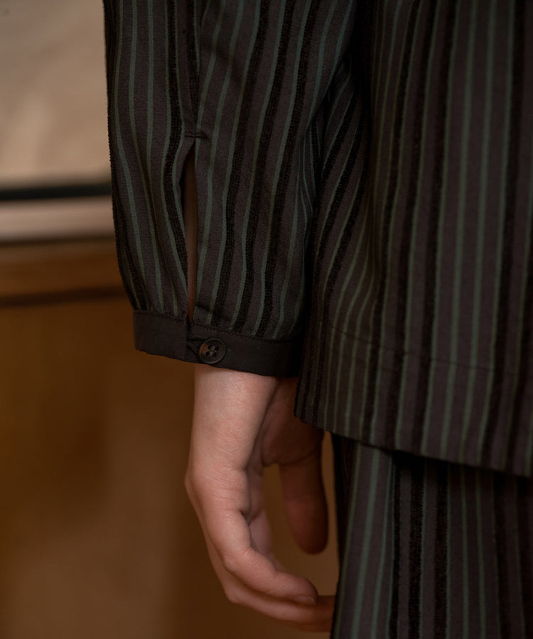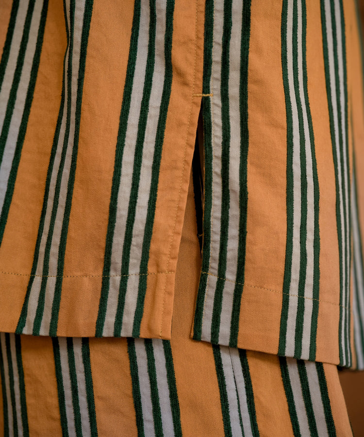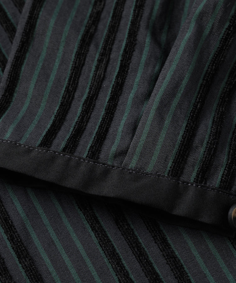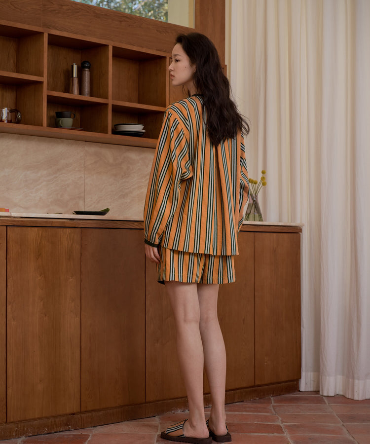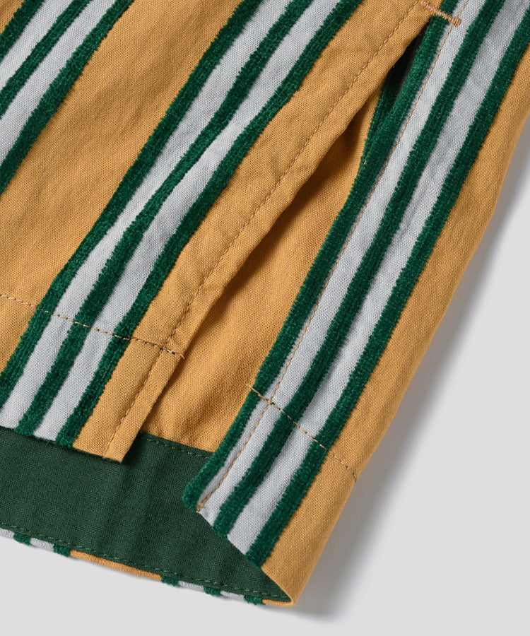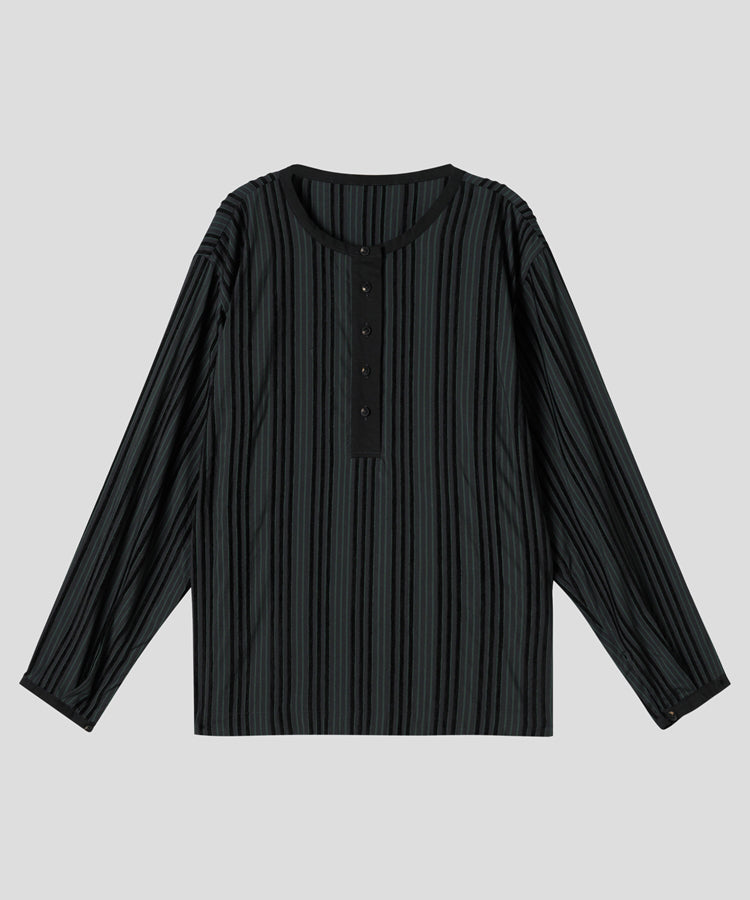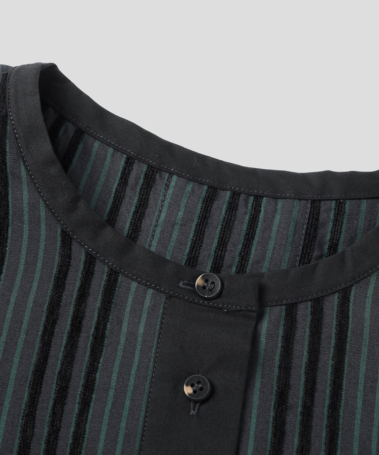 ゆったりとした着心地のプルオーバーシャツ。レトロな色合いのカラフルなシェニール織のストライプ生地。襟のストライプと前立てには、繊細なフルーツボタンを使用しています。