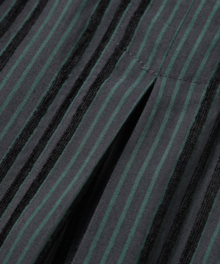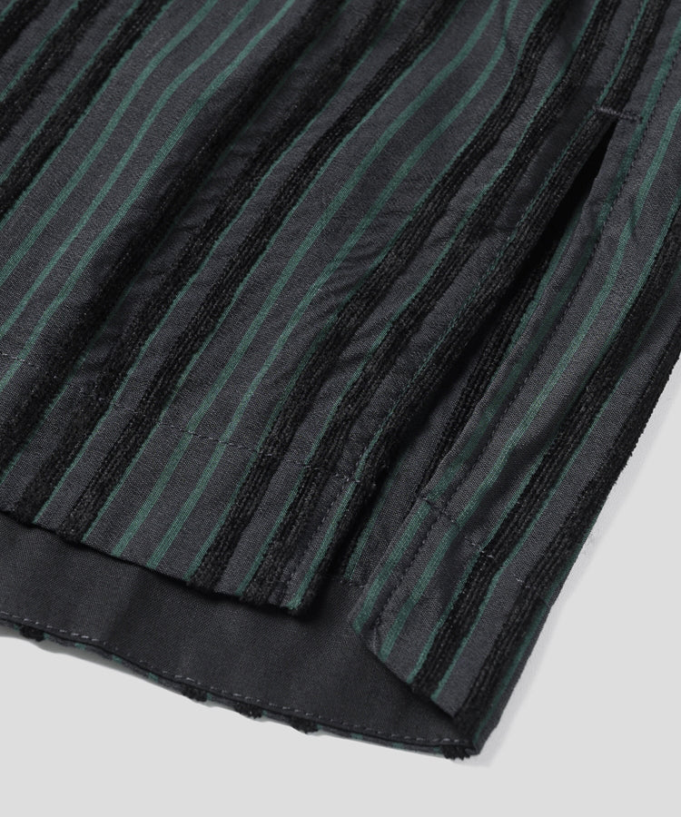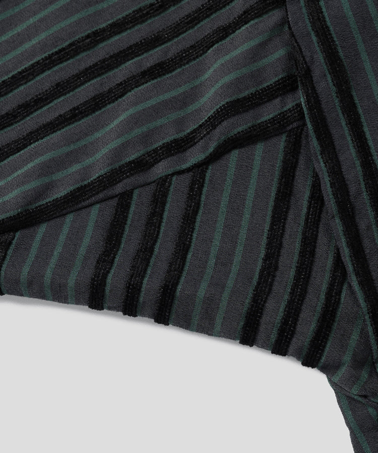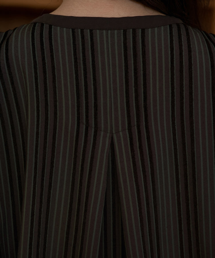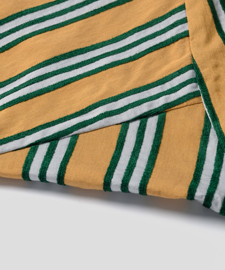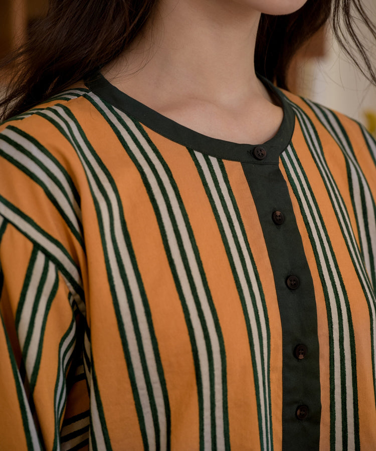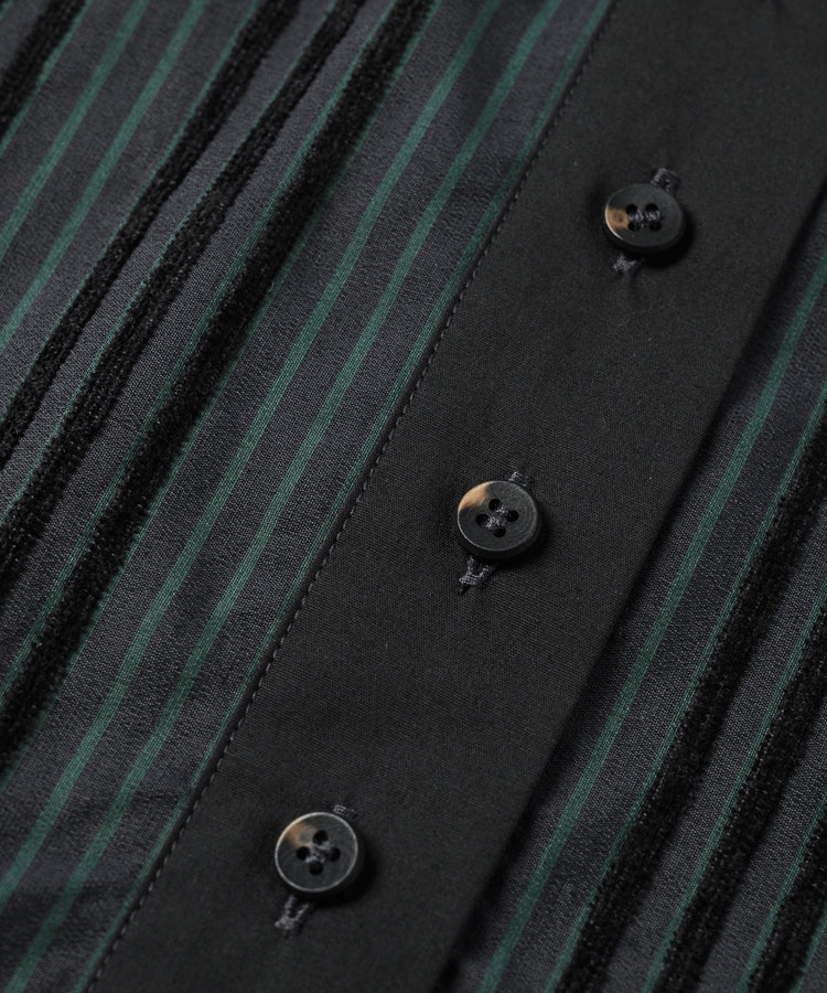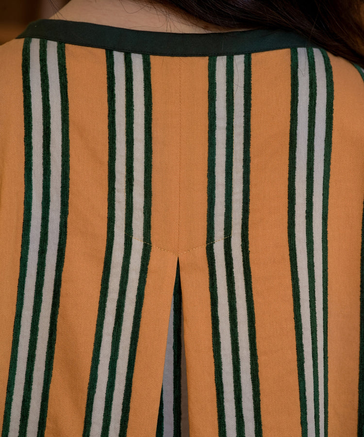 ゆったりとした着心地のプルオーバーシャツ。レトロな色合いのカラフルなシェニール織のストライプ生地。襟のストライプと前立てには、繊細なフルーツボタンを使用しています。