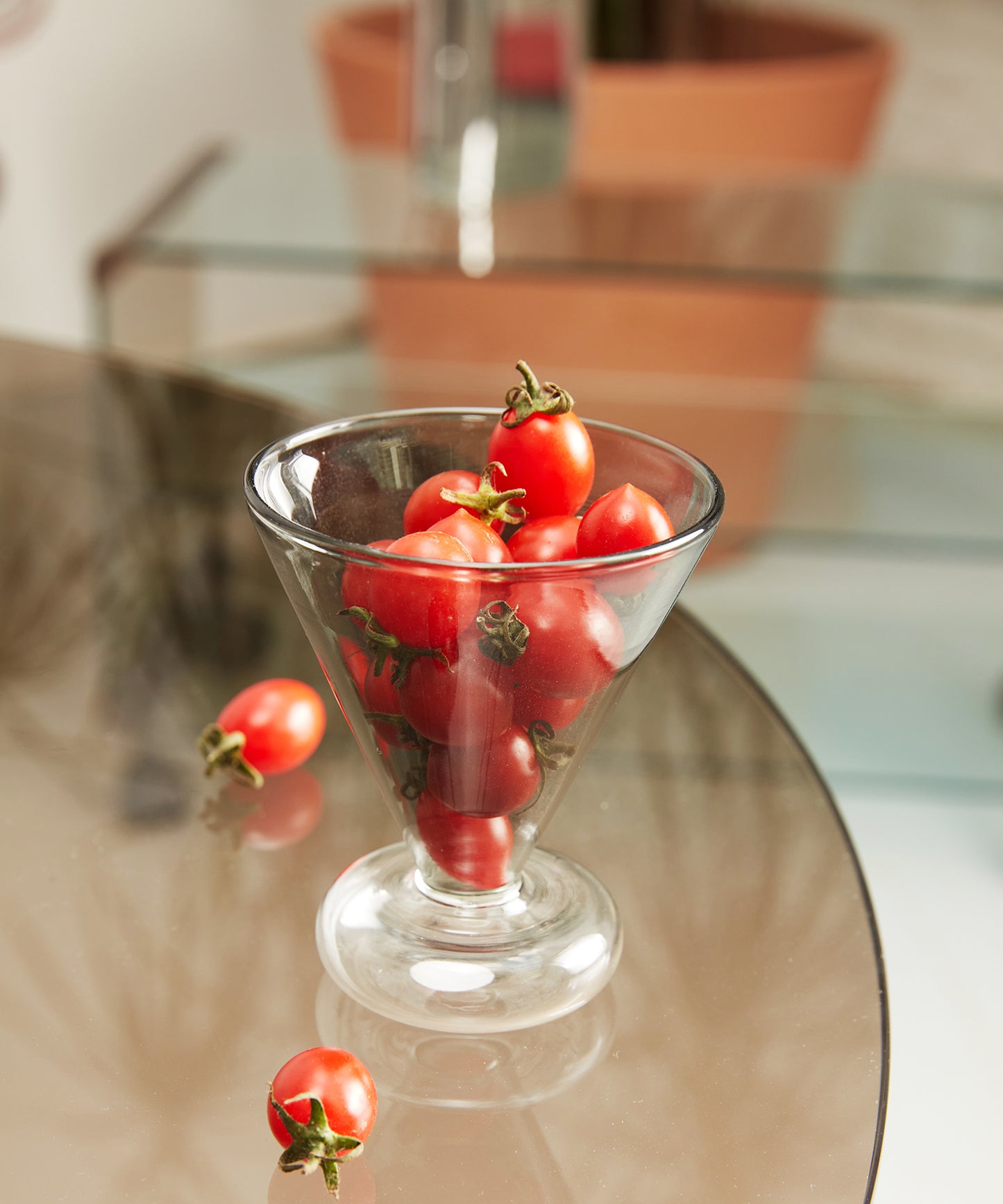 潔くシンプルなフォルムを持つ、円錐を頂点で合わせたようなガラス製ステムカップ。その脚付きデザインは、日常において特別な雰囲気を添えます。