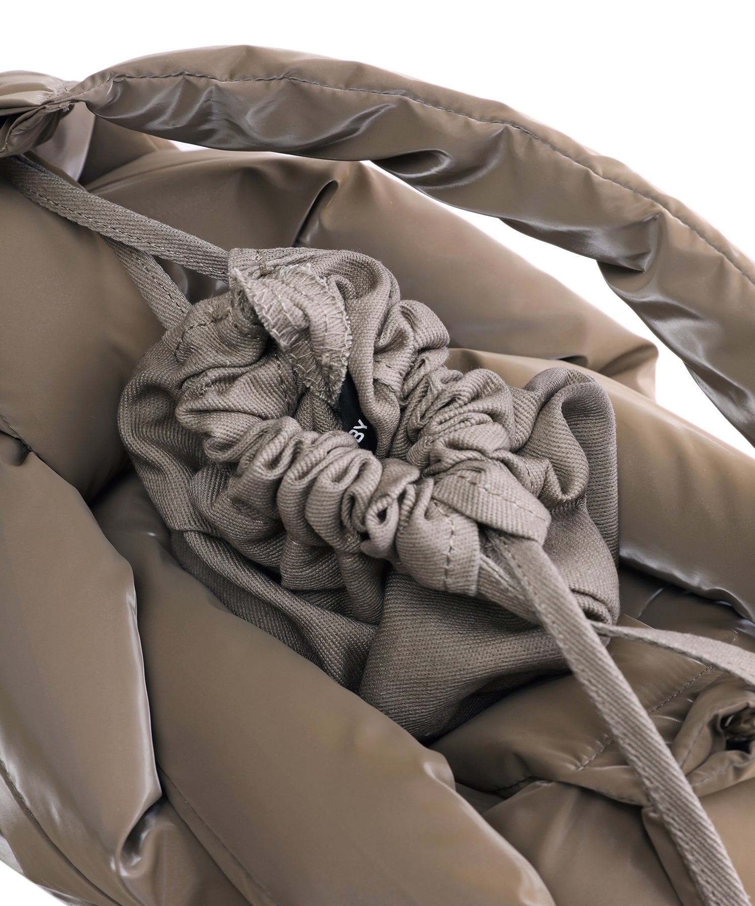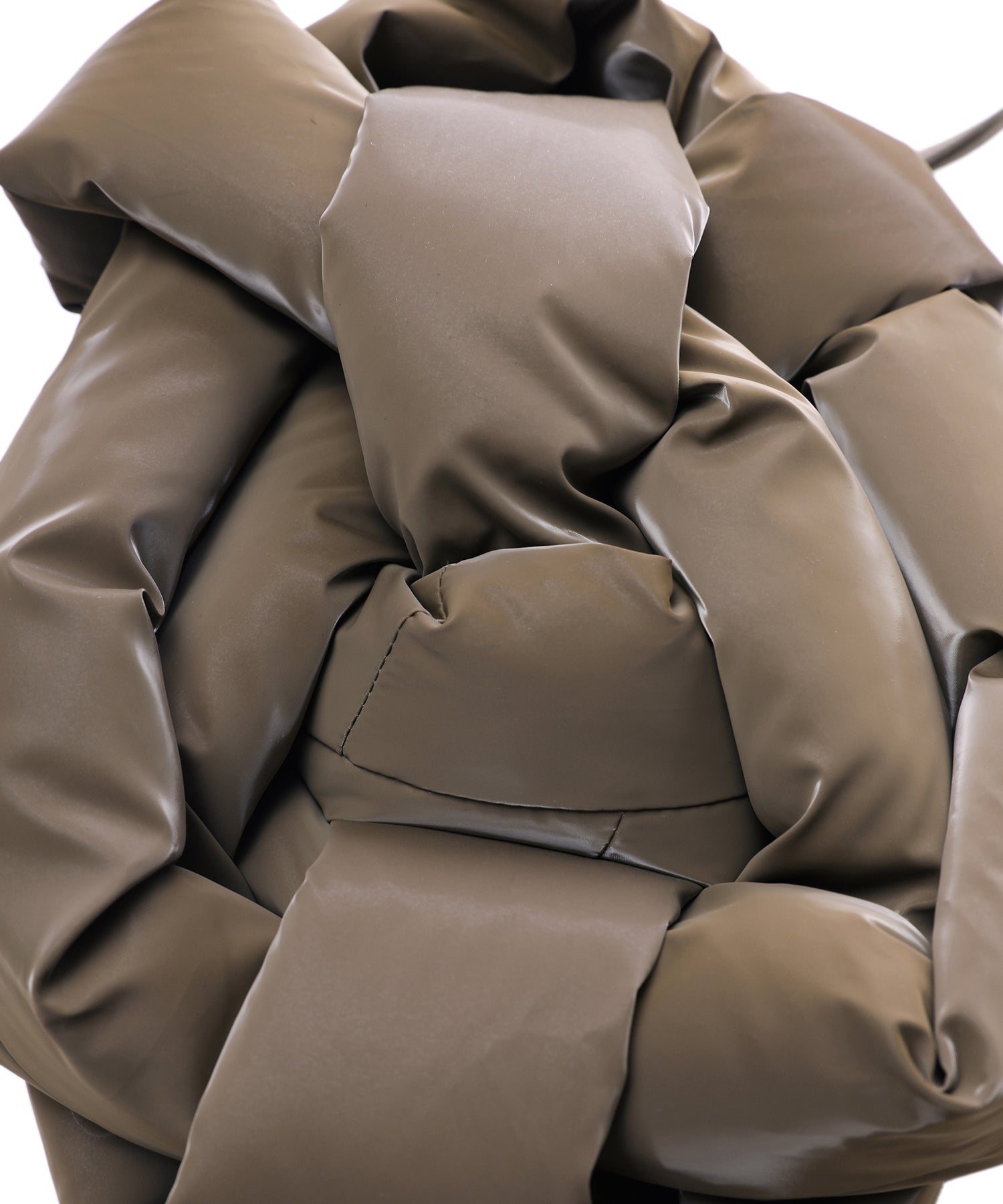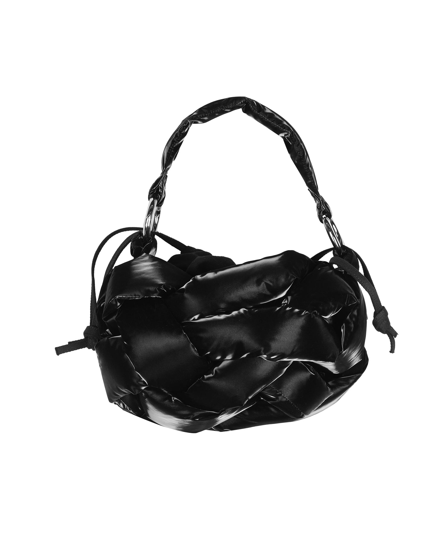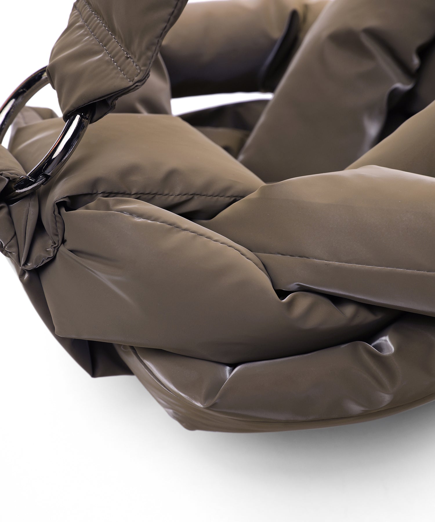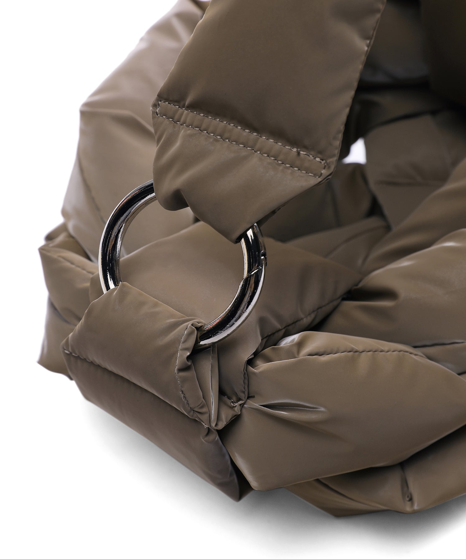 マットな質感のダウン入り生地をクロスさせたデザインのショルダーバッグ。 その丸みを帯びたフォルムが魅力的で、目を引くアイテムです。