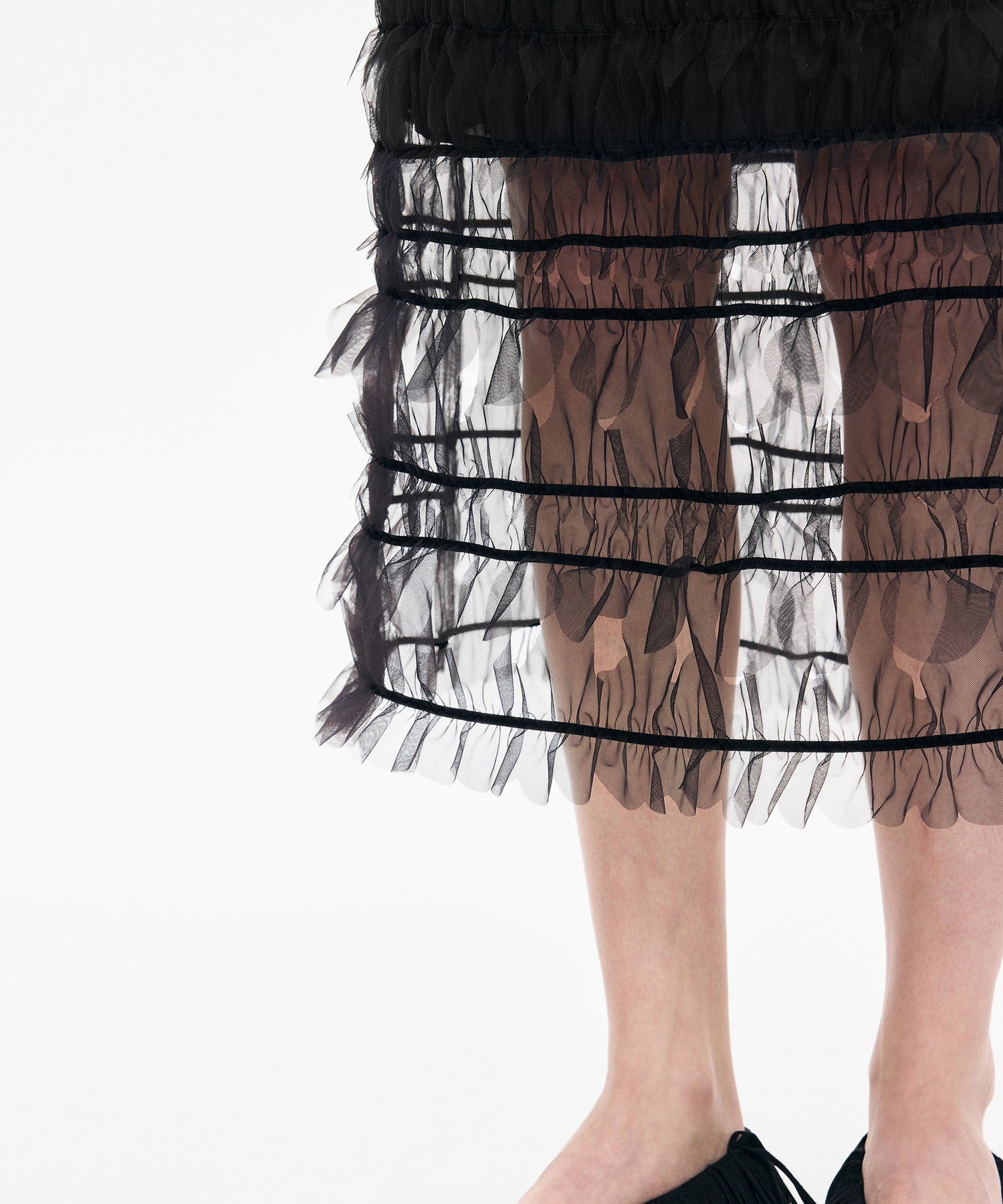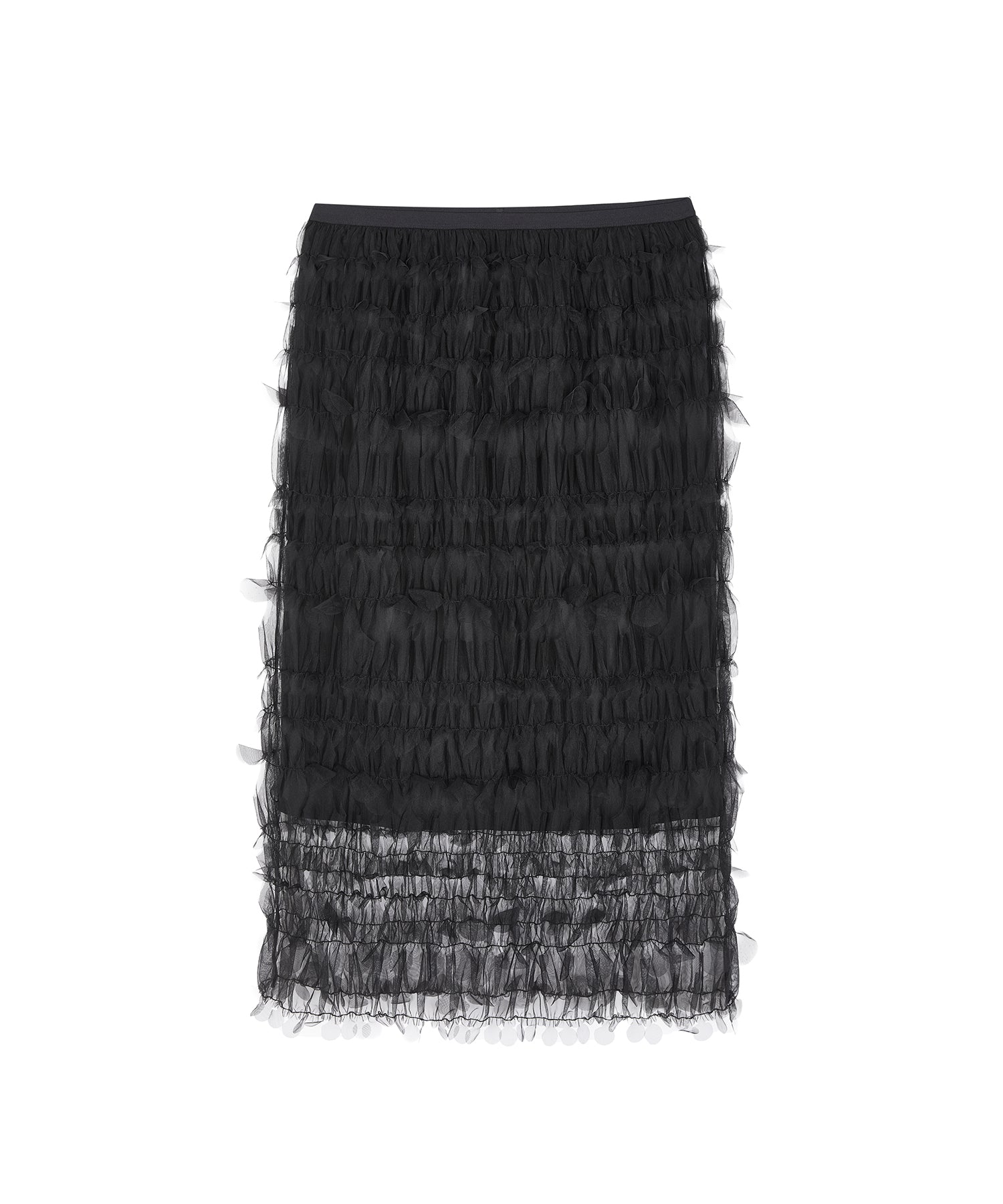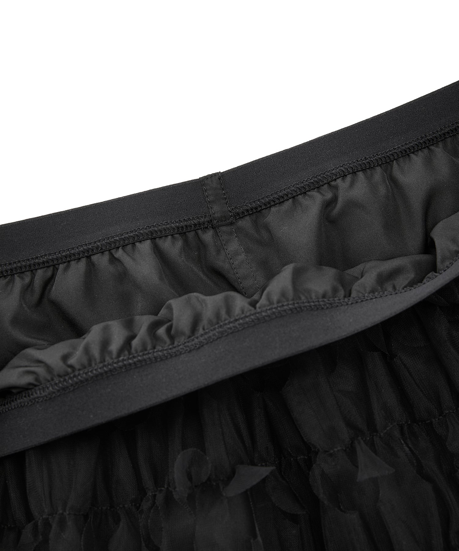 軽やかなチュールにシャーリングを施した、華やかな佇まいのスカート。花びらを思わせるカットアウトが、羽のようにふんわりと立ち上がり、立体感と動きを生み出します。上品で女性らしい印象を放ち、デイリーからパーティまで多彩なシーンで活躍。装いに一枚で華やぎを添える、洗練されたアイテムです。