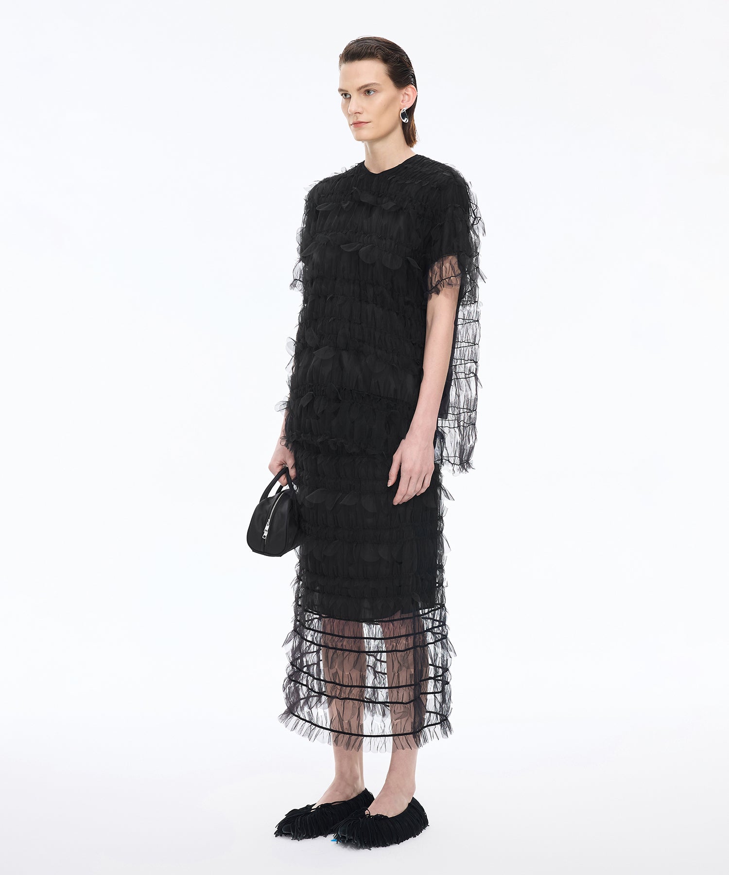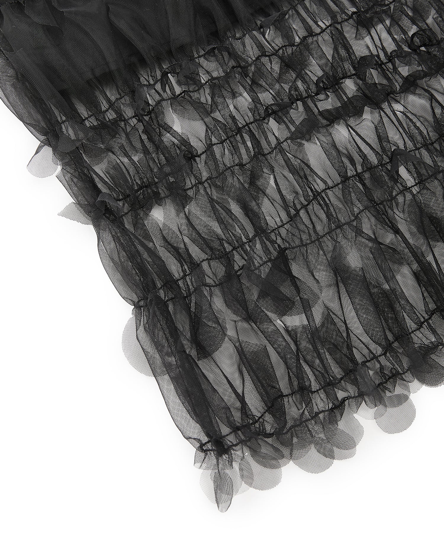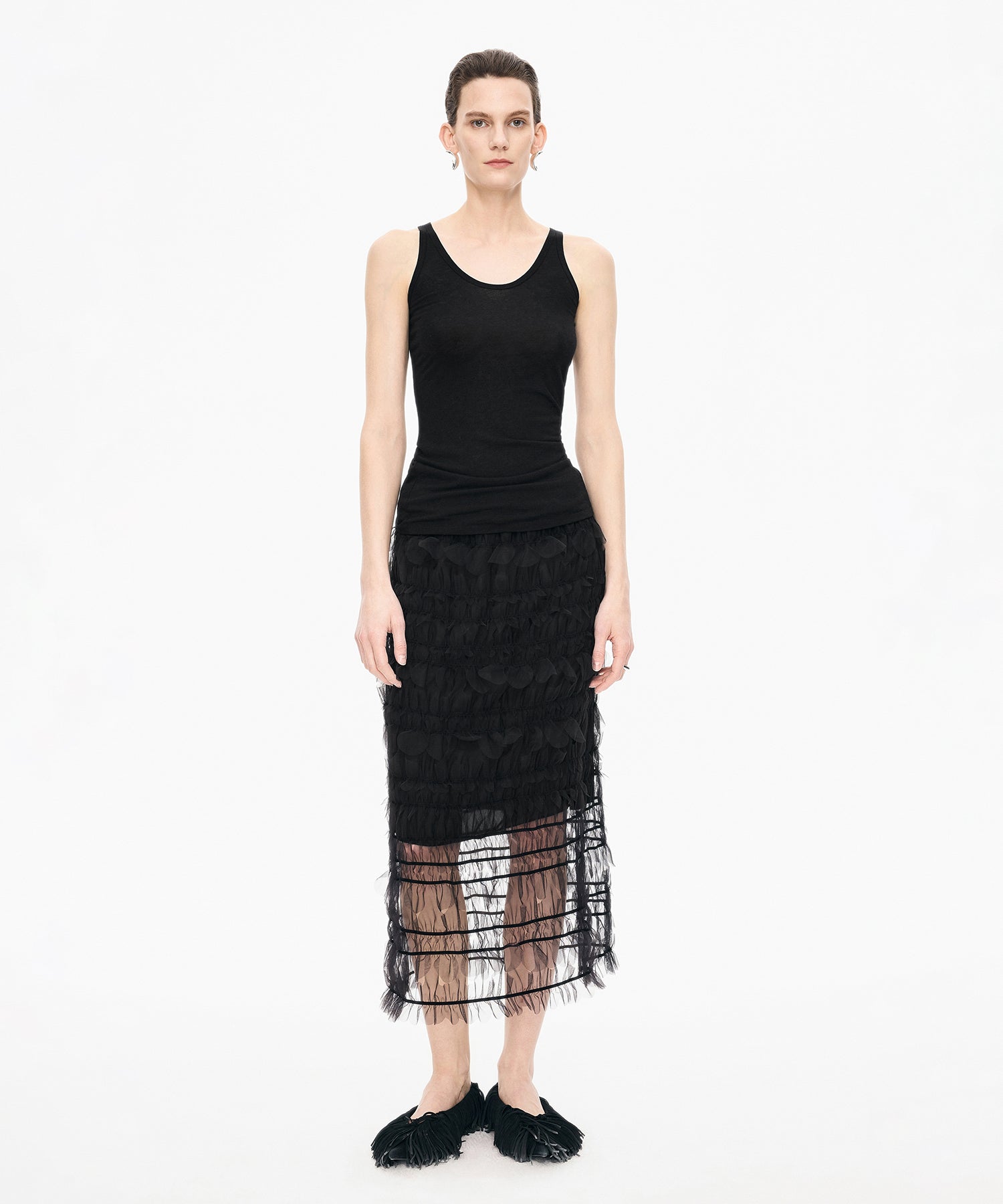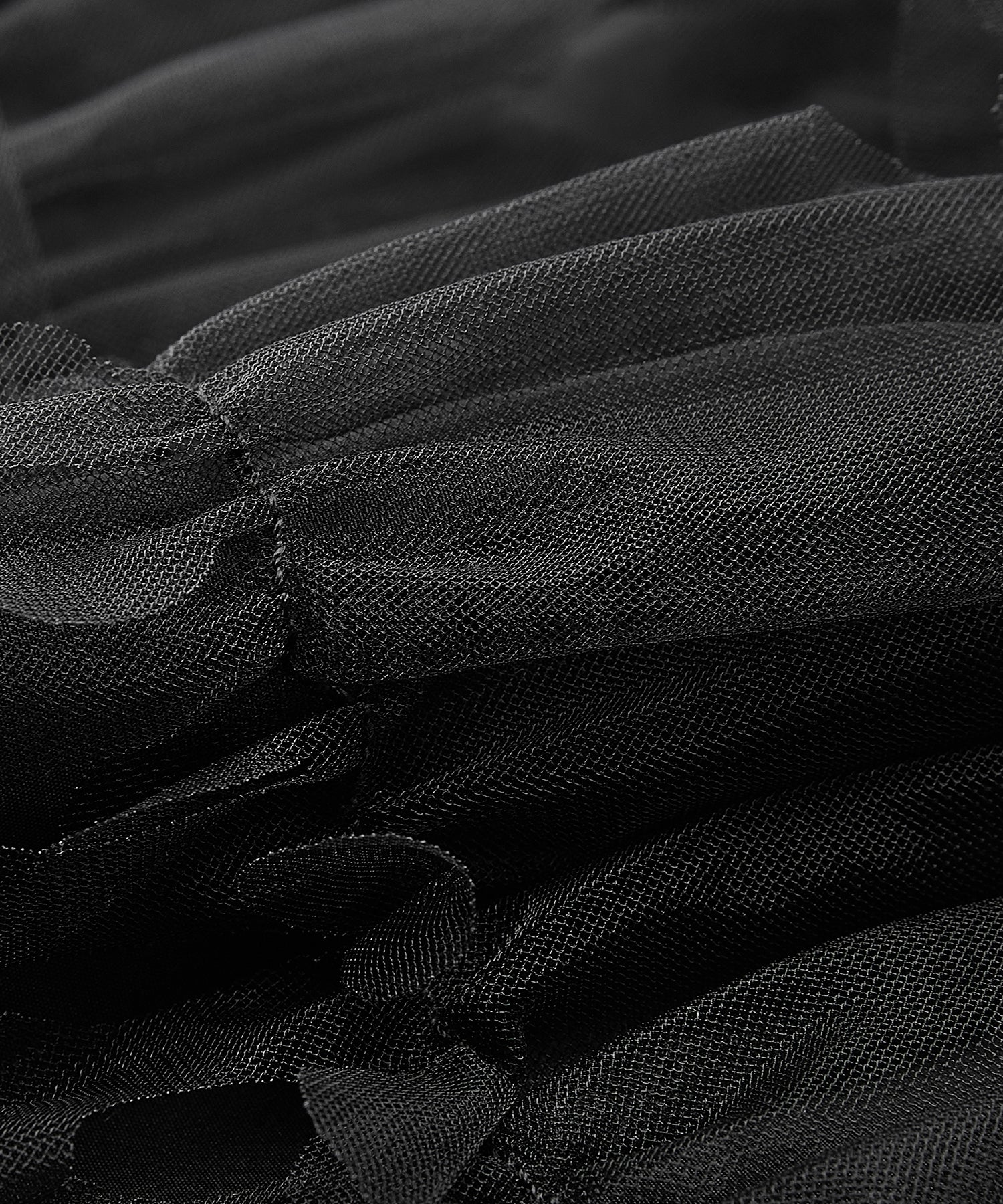 軽やかなチュールにシャーリングを施した、華やかな佇まいのスカート。花びらを思わせるカットアウトが、羽のようにふんわりと立ち上がり、立体感と動きを生み出します。上品で女性らしい印象を放ち、デイリーからパーティまで多彩なシーンで活躍。装いに一枚で華やぎを添える、洗練されたアイテムです。