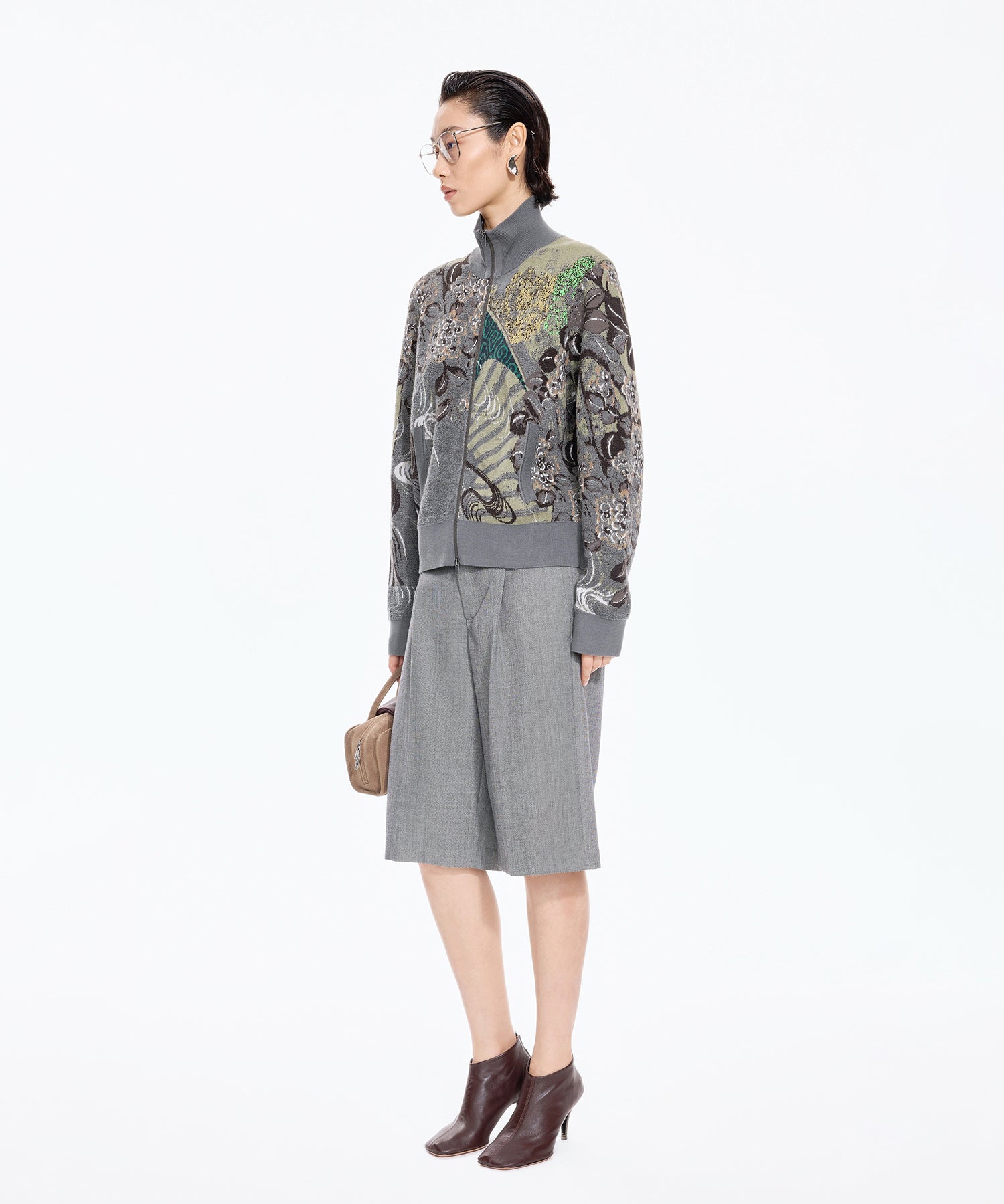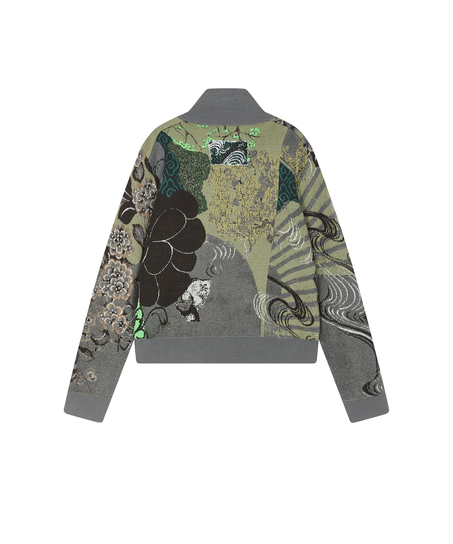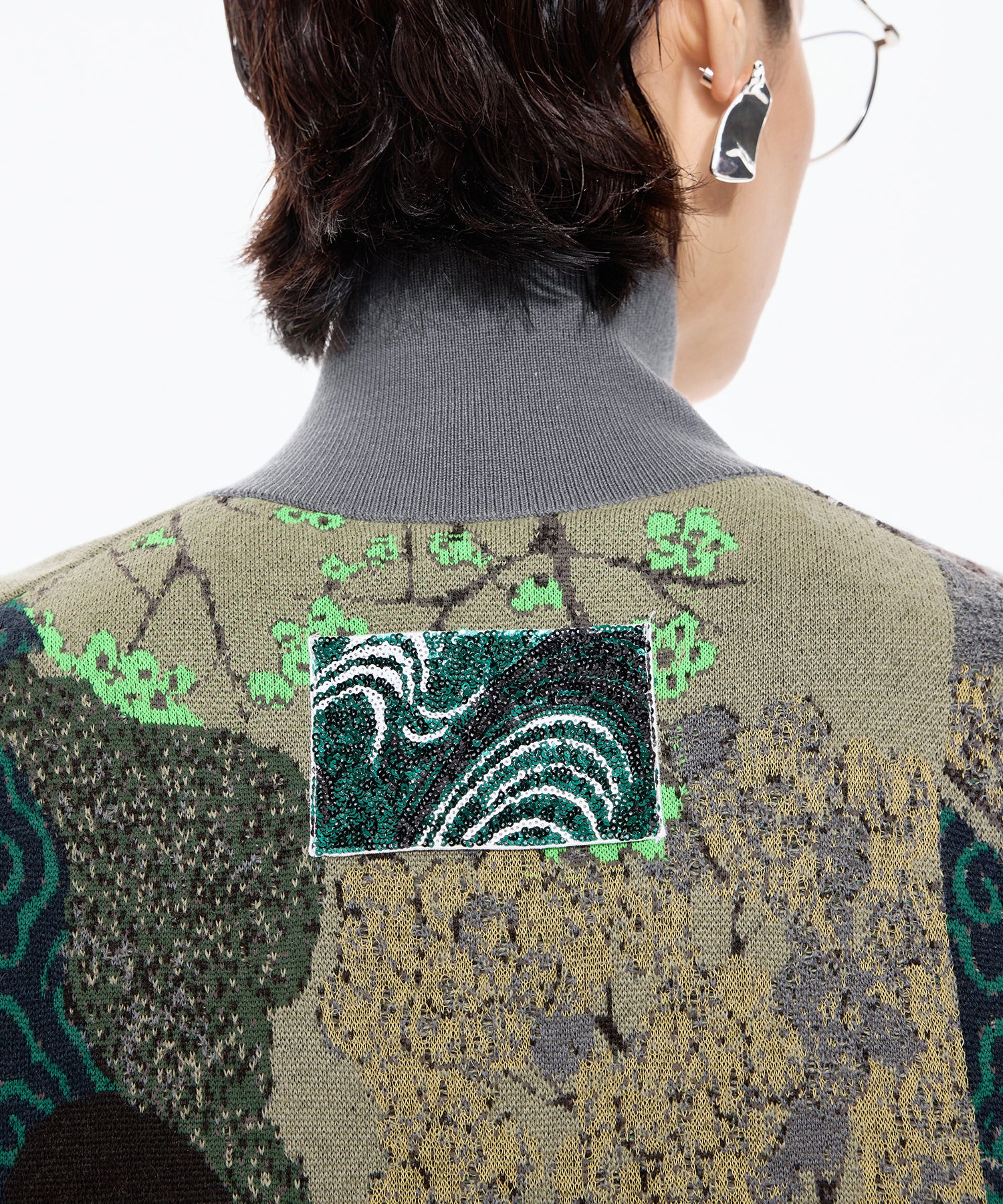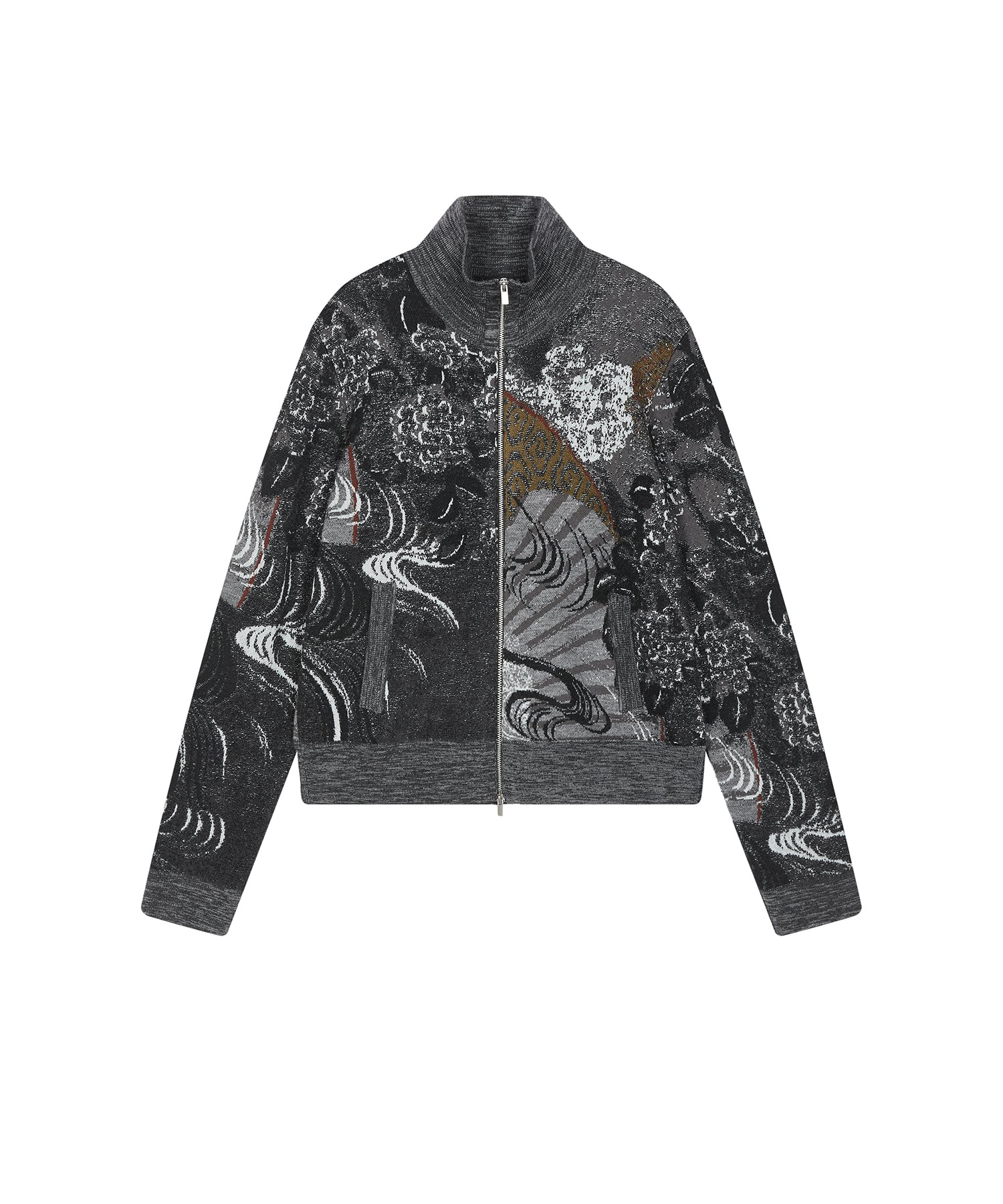 オリエンタル柄が目を引く、ジップアップのニットジャケット。厚みのあるしっかりとしたジャカード素材で、冬のスタイリングにぴったりです。弾力性があり型崩れしにくいのも嬉しいポイント。デニムやシンプルなボトムと合わせるだけで、存在感のある着こなしが完成します。