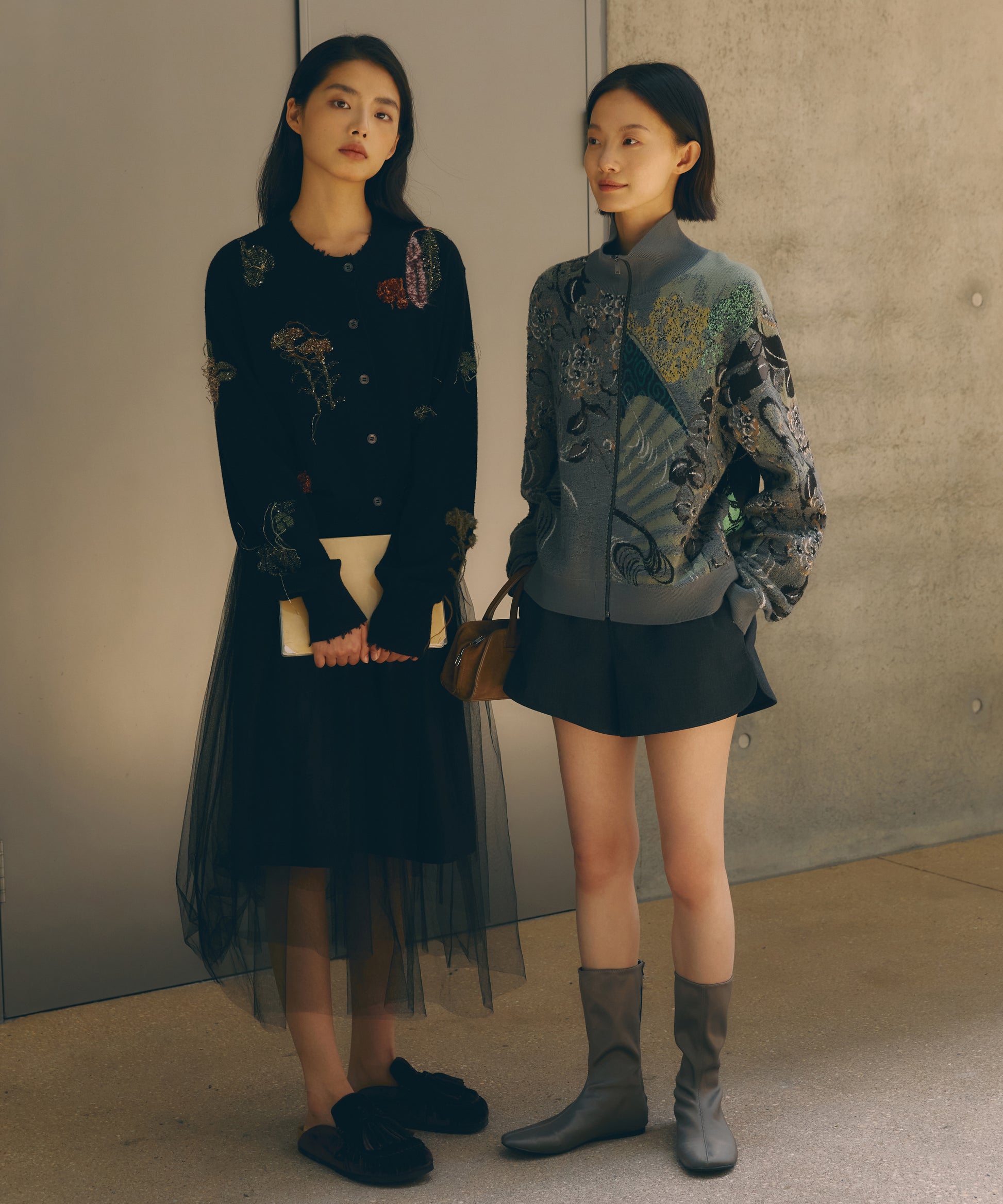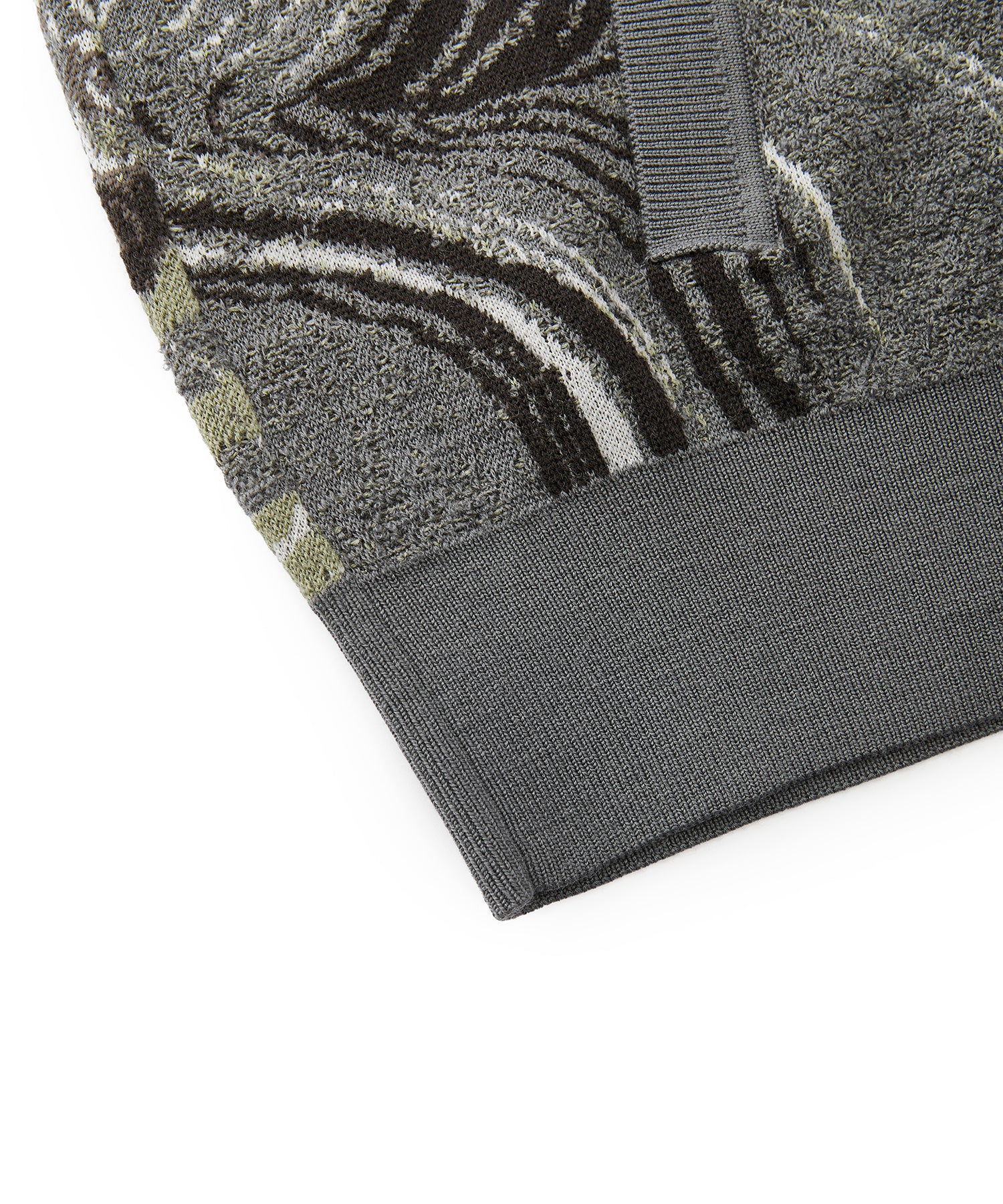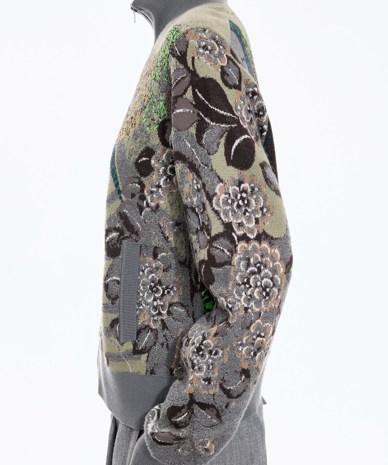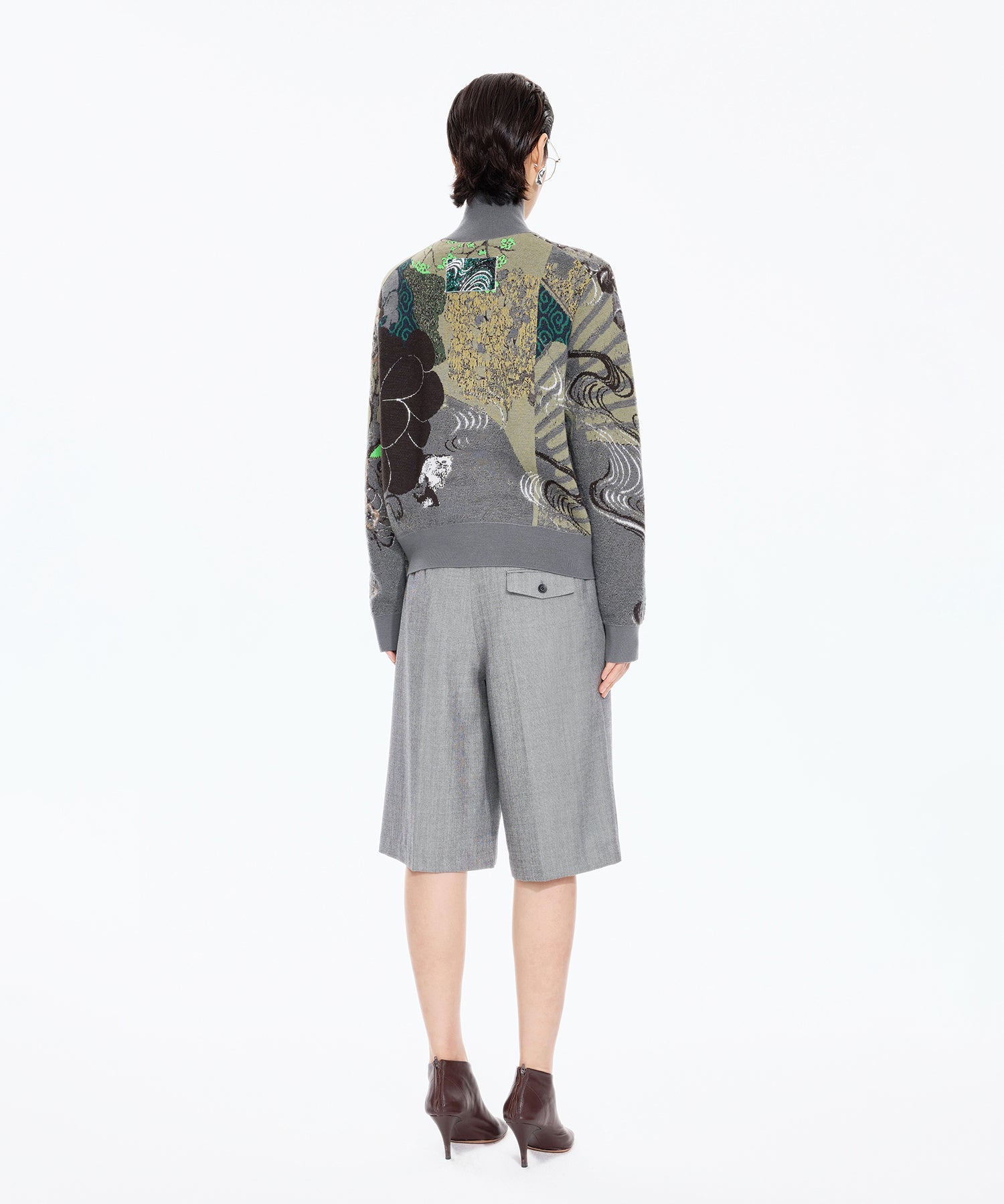 オリエンタル柄が目を引く、ジップアップのニットジャケット。厚みのあるしっかりとしたジャカード素材で、冬のスタイリングにぴったりです。弾力性があり型崩れしにくいのも嬉しいポイント。デニムやシンプルなボトムと合わせるだけで、存在感のある着こなしが完成します。