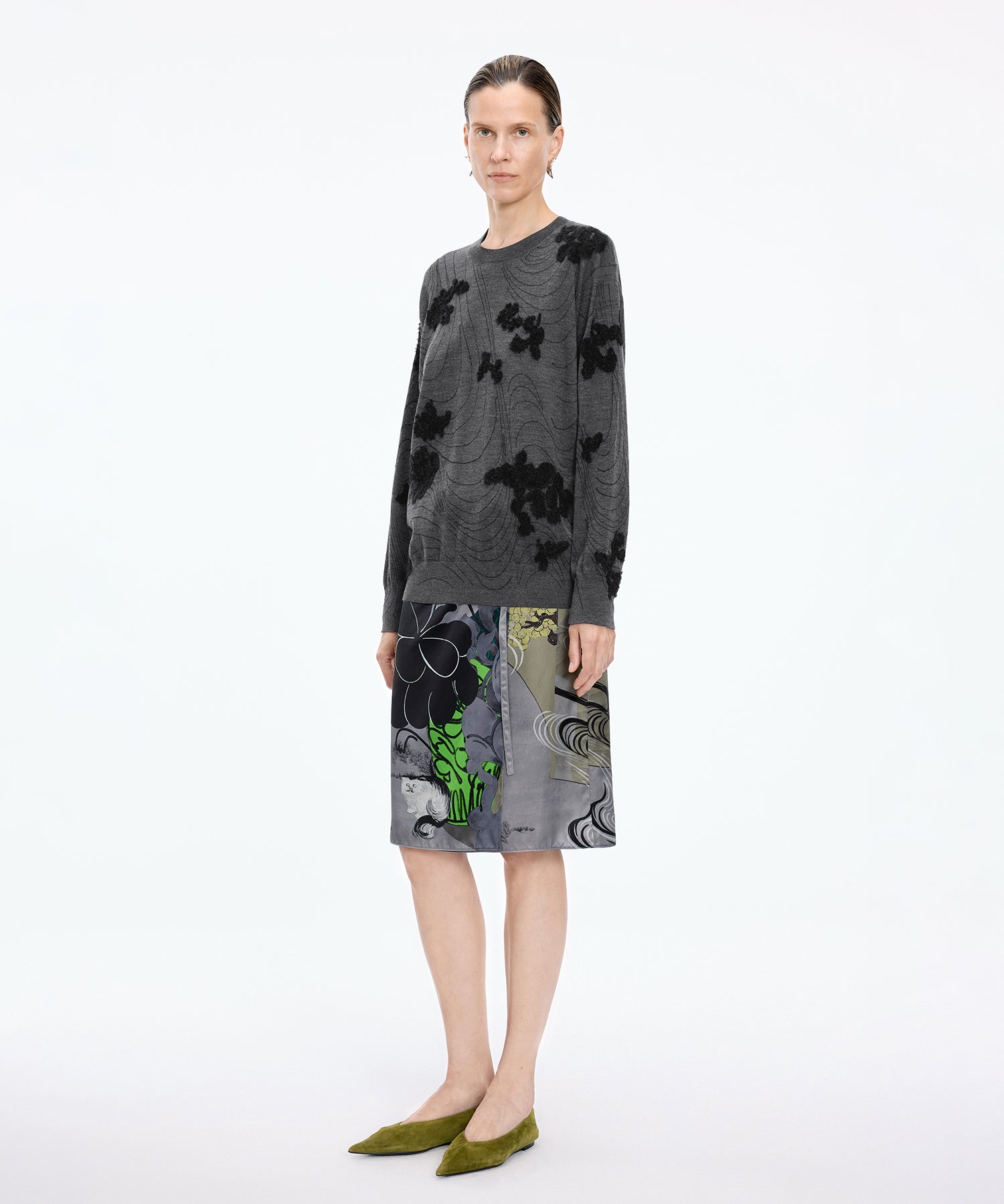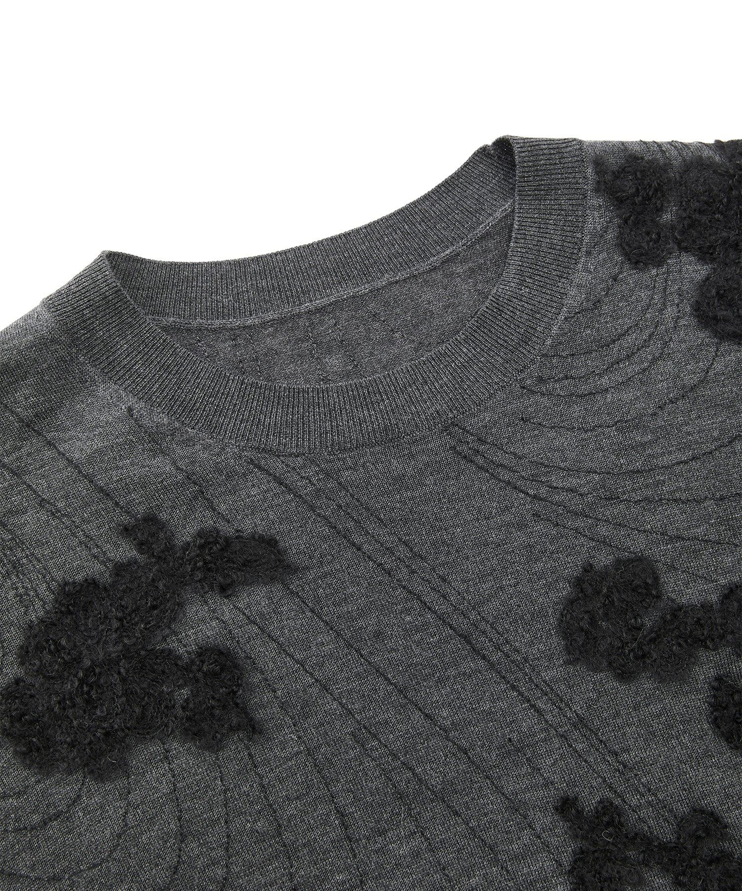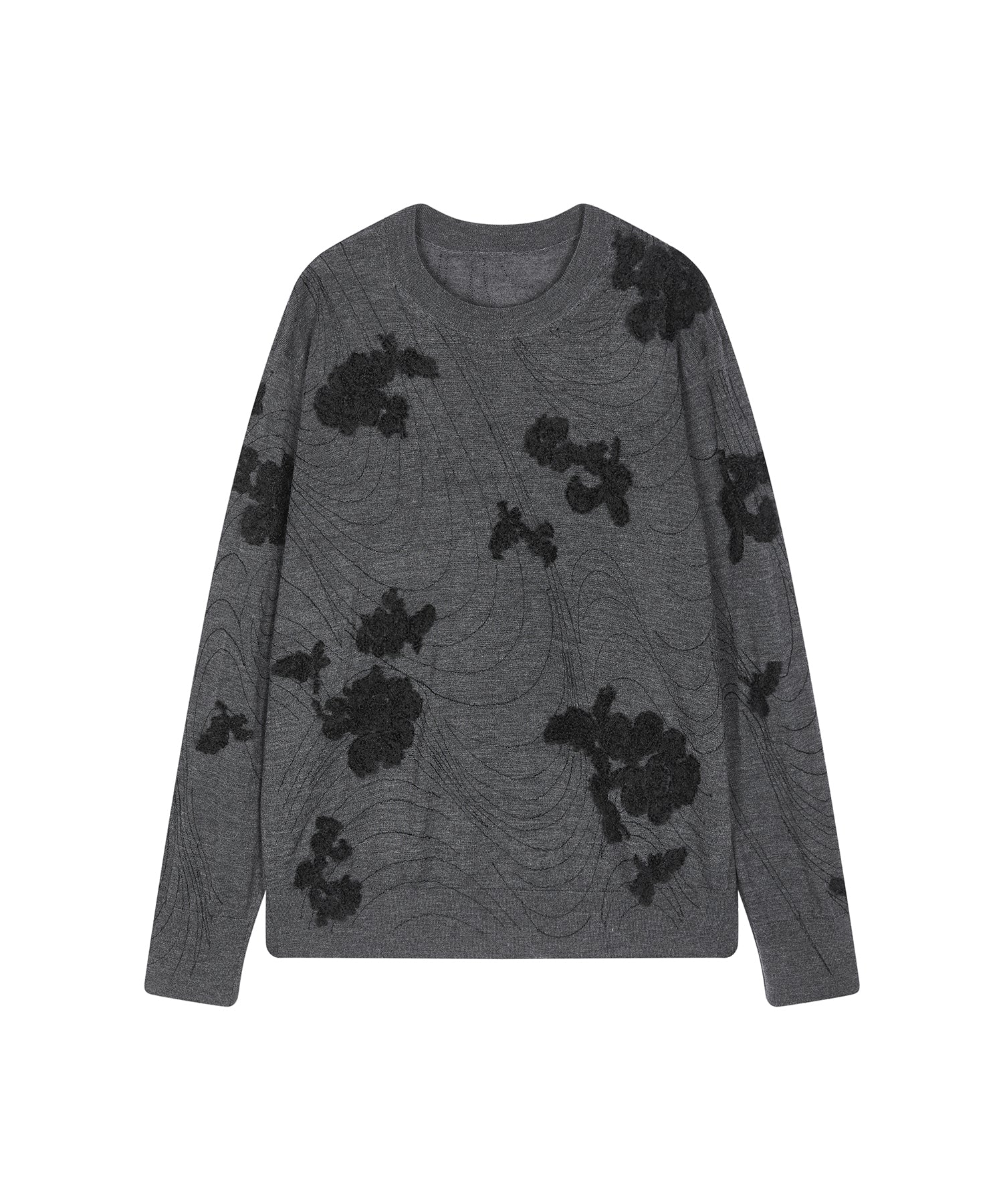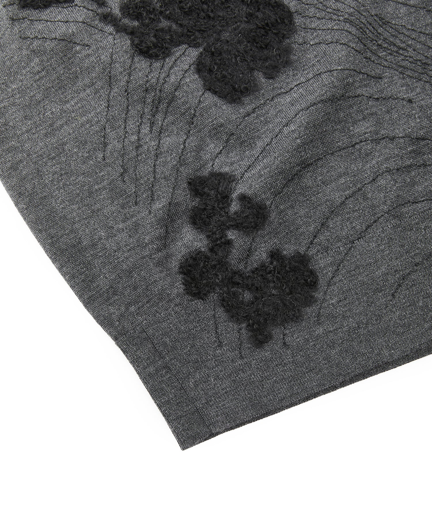 繊細な刺繍と立体的な花柄が目を惹くセーター。上質なメリノウールを使用し、柔らかく肌に心地よい上品な質感に仕上げました。ハイゲージの薄手素材なので、ロングシーズン活躍する一枚です。