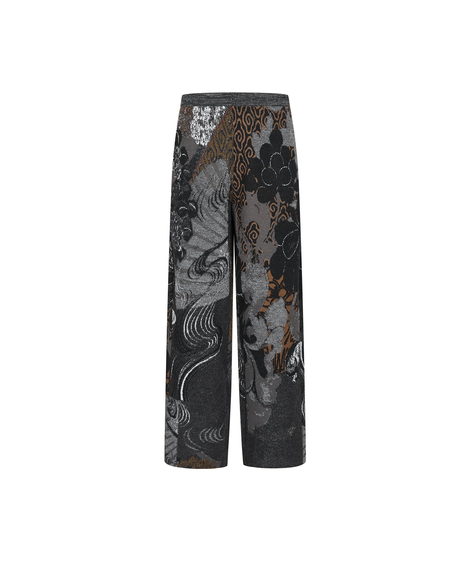 オリエンタル柄が目を引くジャカードニットパンツ。厚手でしっかりとしたニット地は冬に最適です。落ち感のあるストレートシルエットが脚のラインを拾わず、腰回りをすっきりと演出。華やかさと快適さを兼ね備えた一本です。