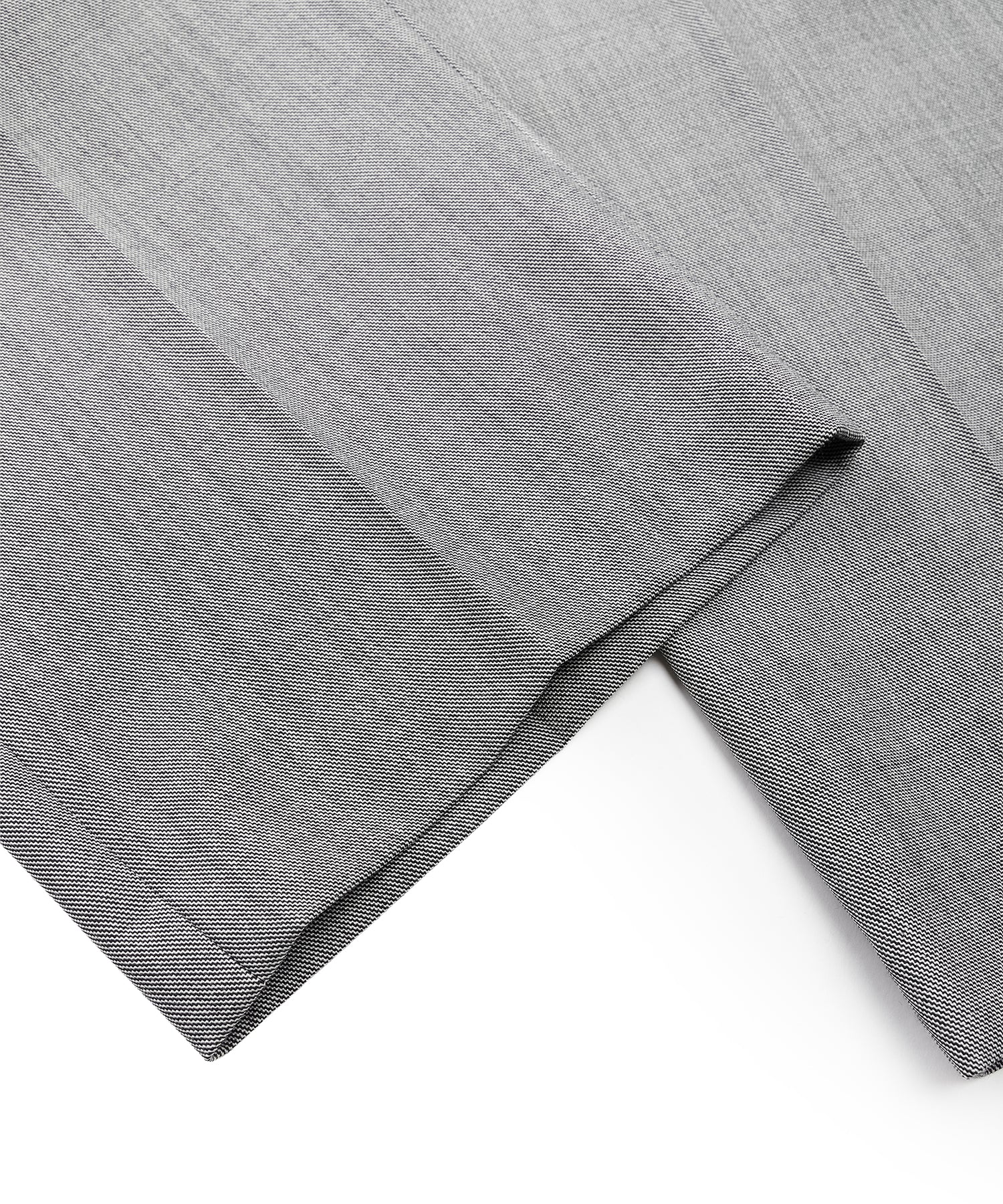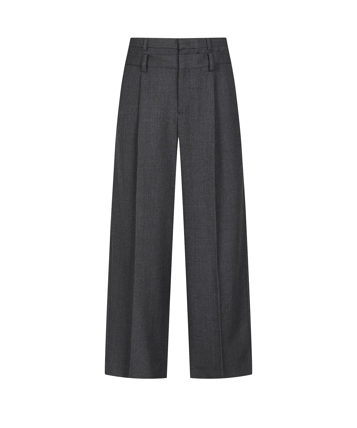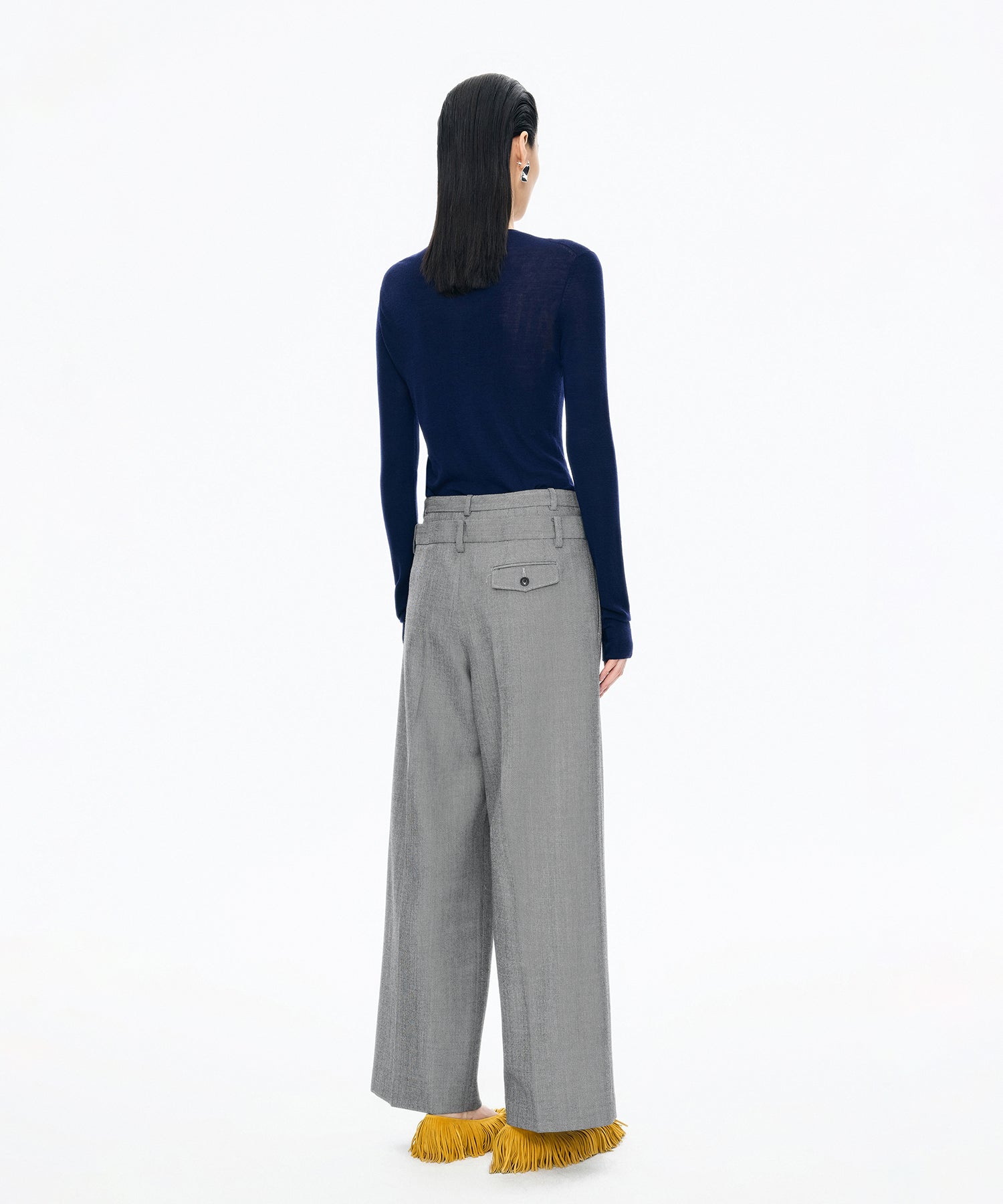 ダブルウエスト仕様が目を引くストレートパンツ。ハリとコシのある上質なウールを使用し、美しい落ち感を実現しています。ストレートレッグのデザインは脚をすっきりと見せ、シャープで洗練された印象に。きれいめスタイルからカジュアルコーデまで幅広く活躍する万能アイテムです。