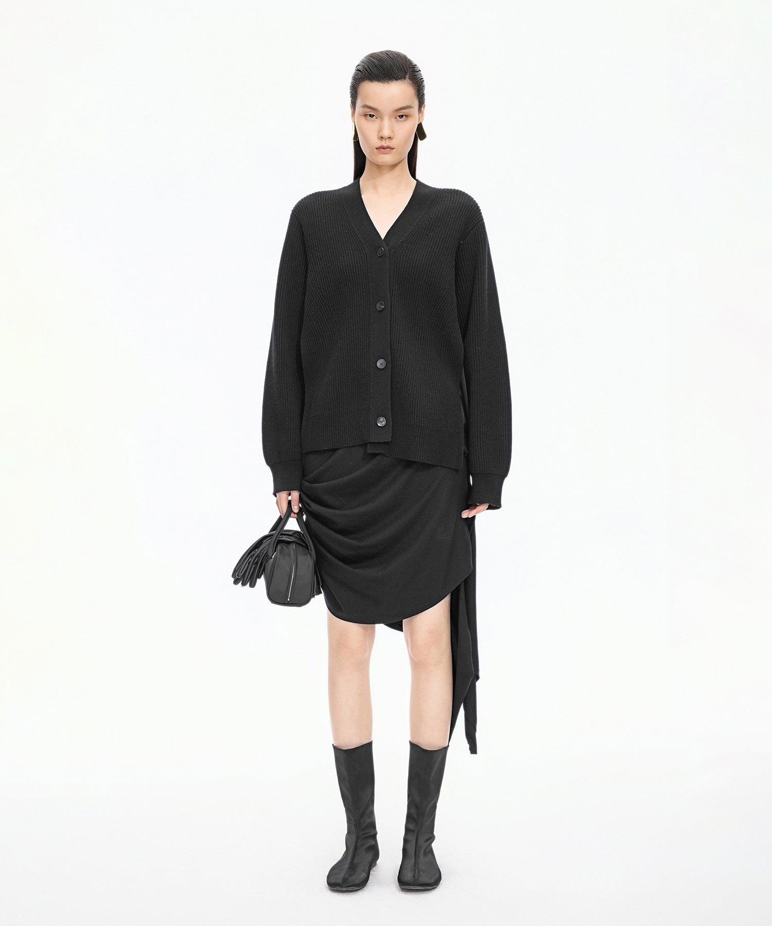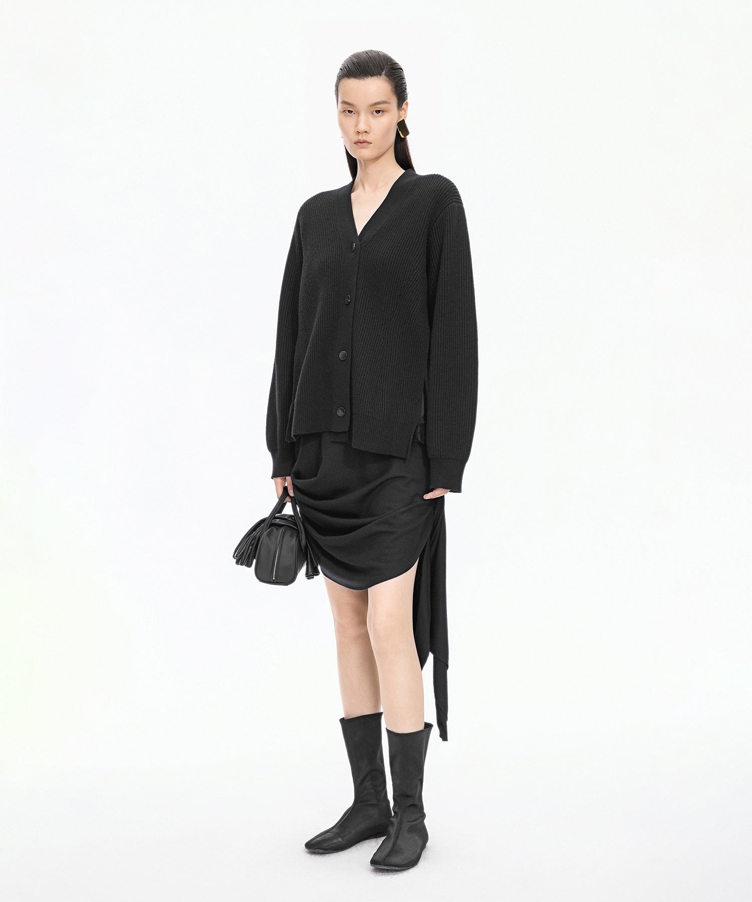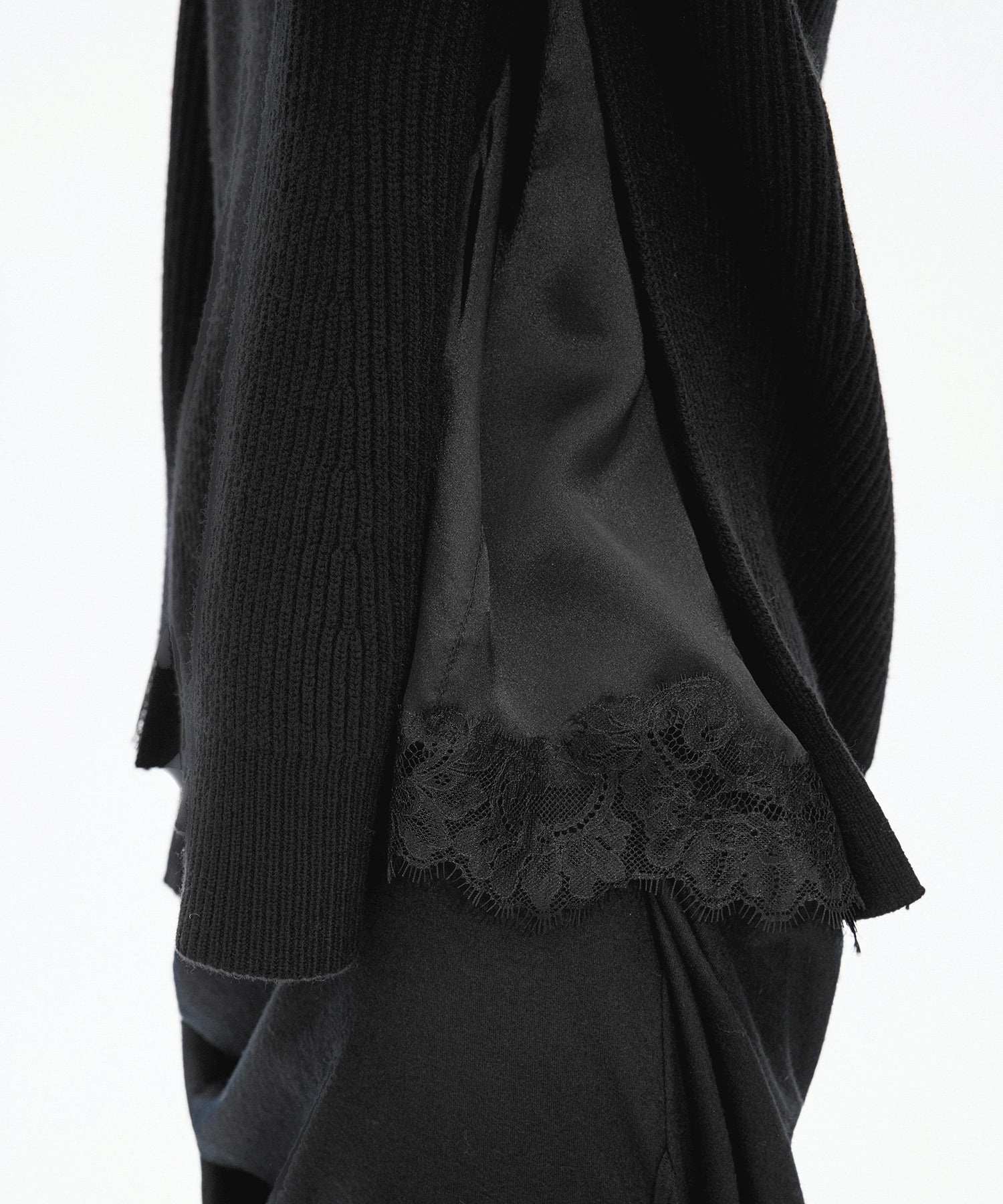上質なウールを贅沢に使用した厚手のVネックカーディガン。サイドに施したサテンレースがさりげない華やぎを添え、シンプルながらも洗練された印象に。デニムやカジュアルボトムスと合わせるだけで、上品なデイリースタイルが完成します。