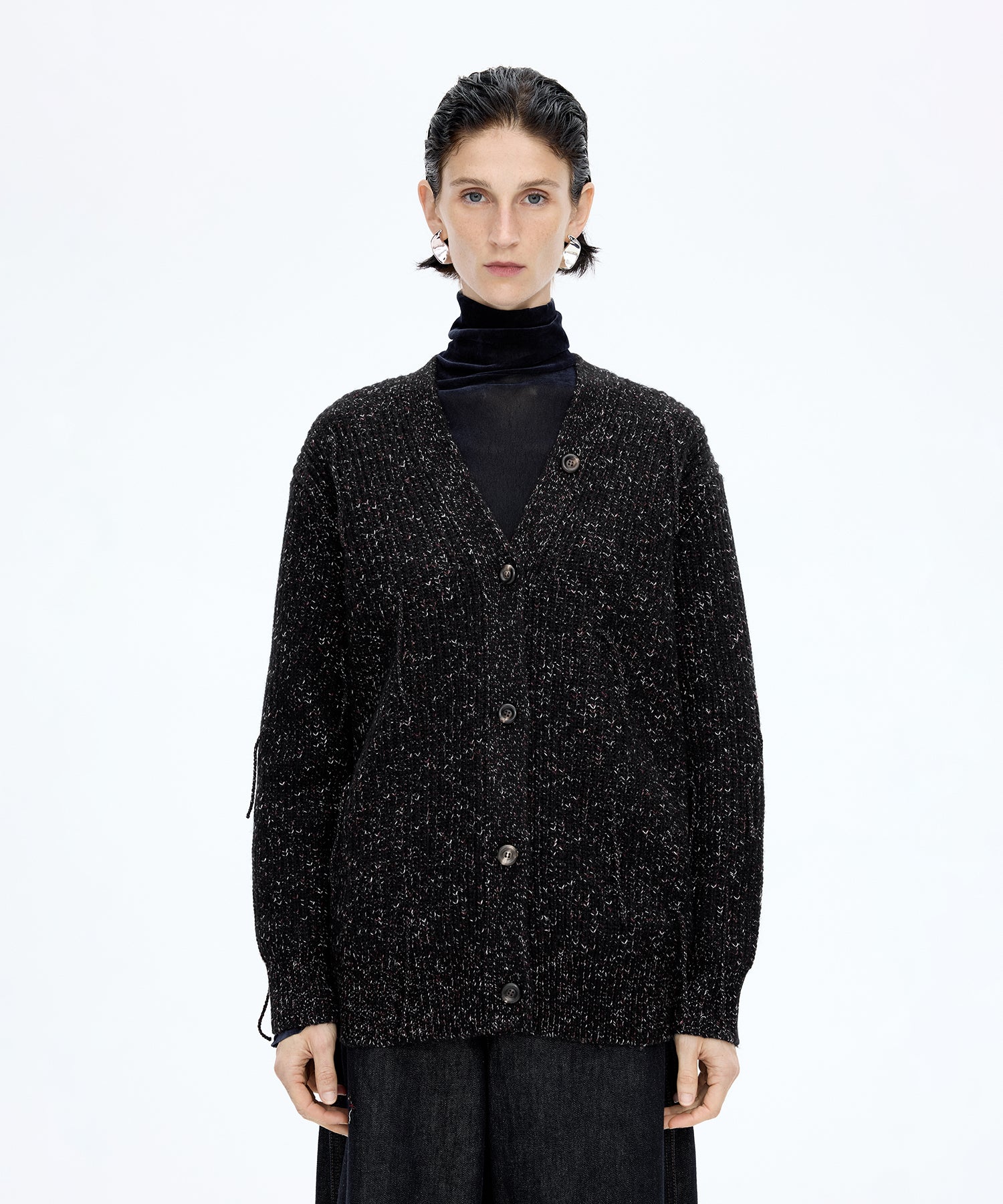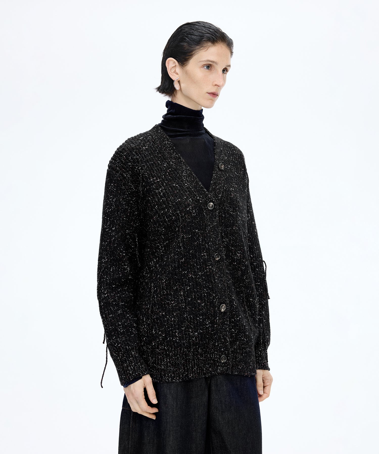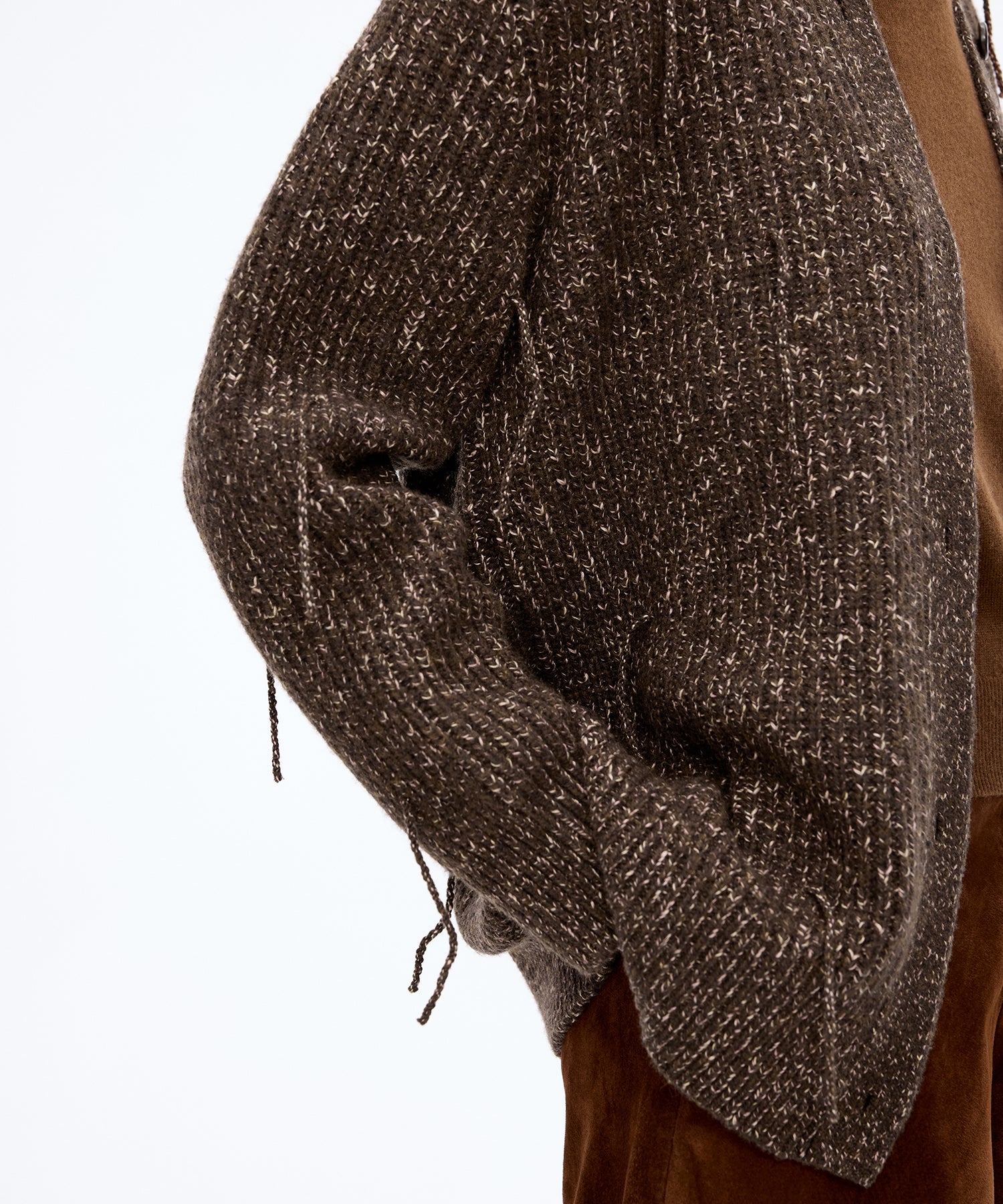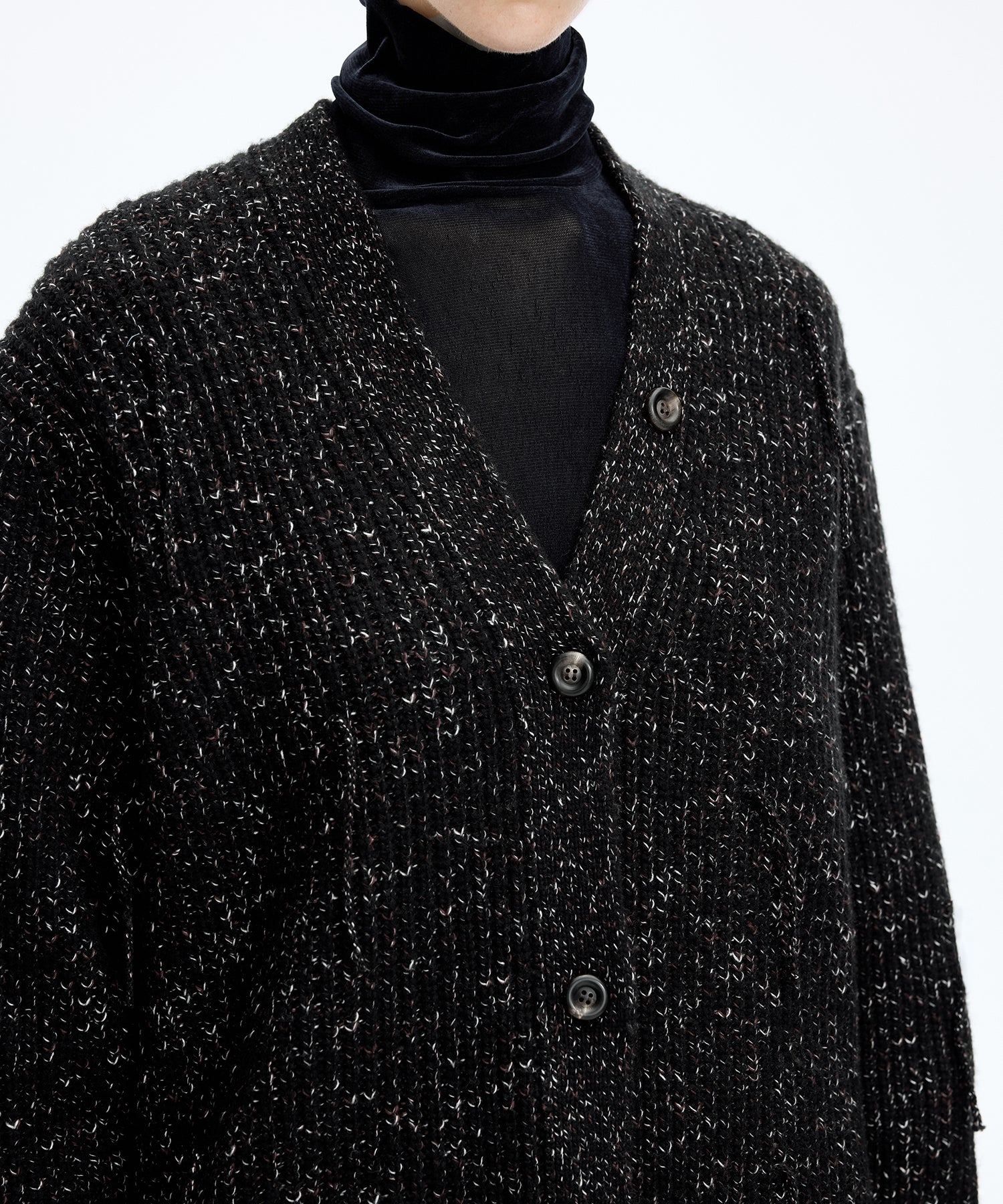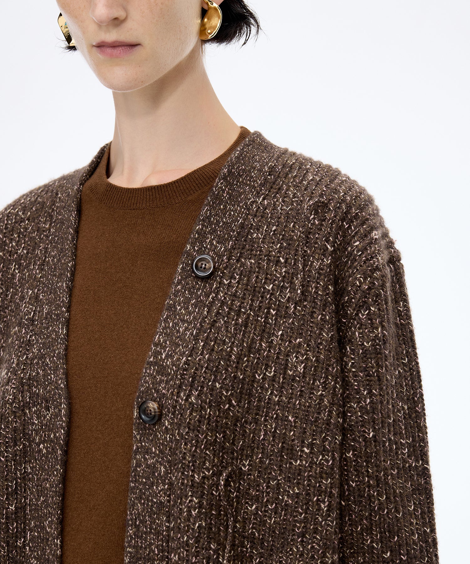 ふんわりとした表面感が魅力のニットカーディガン。暖かみのあるミックスヤーンを使用し、奥行きのあるカラーが落ち着いた印象を演出します。シンプルなVネックデザインで、シャツやタートルネックとのレイヤードもおすすめ。秋冬のスタイリングを上品に引き立てる一枚です。