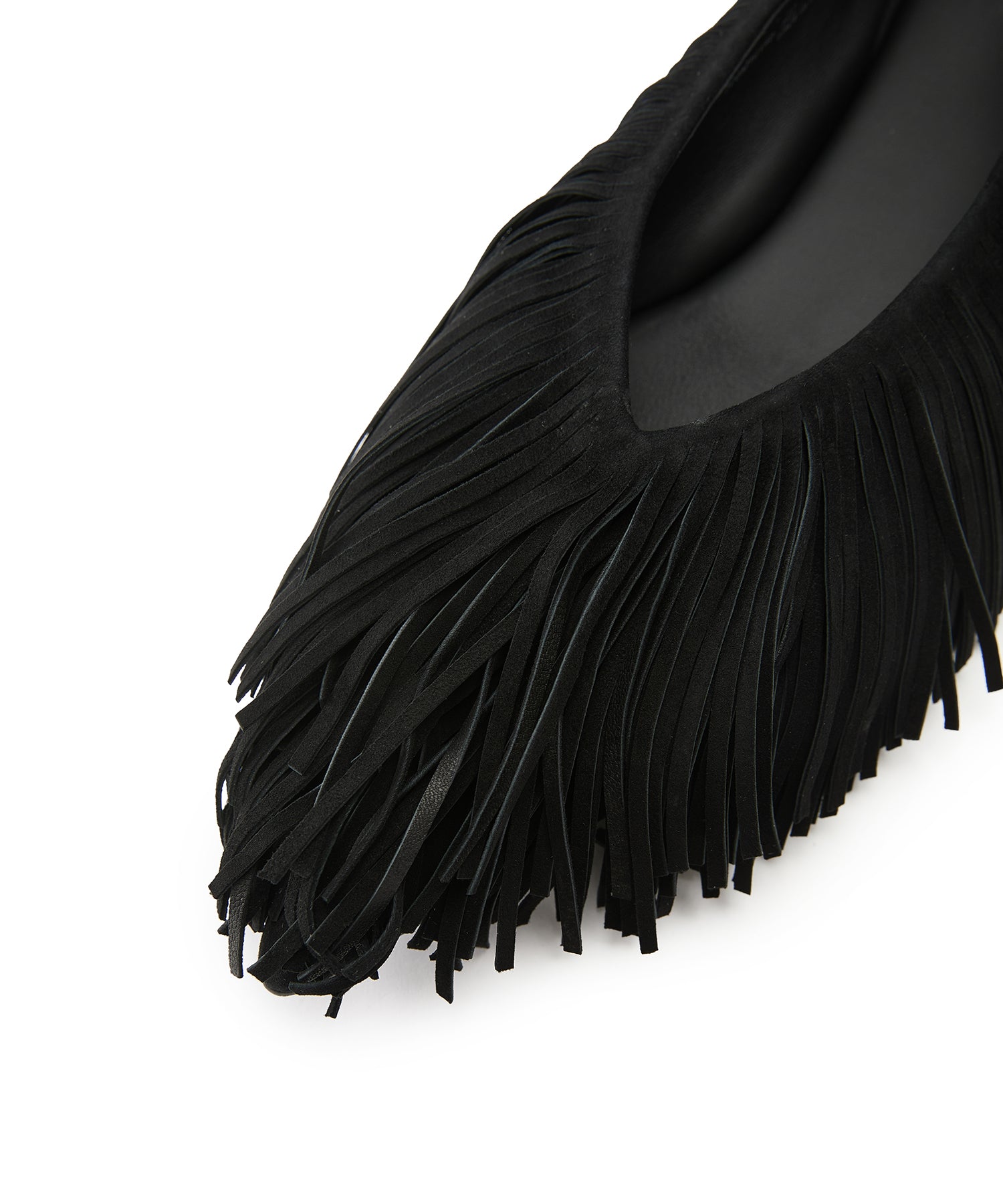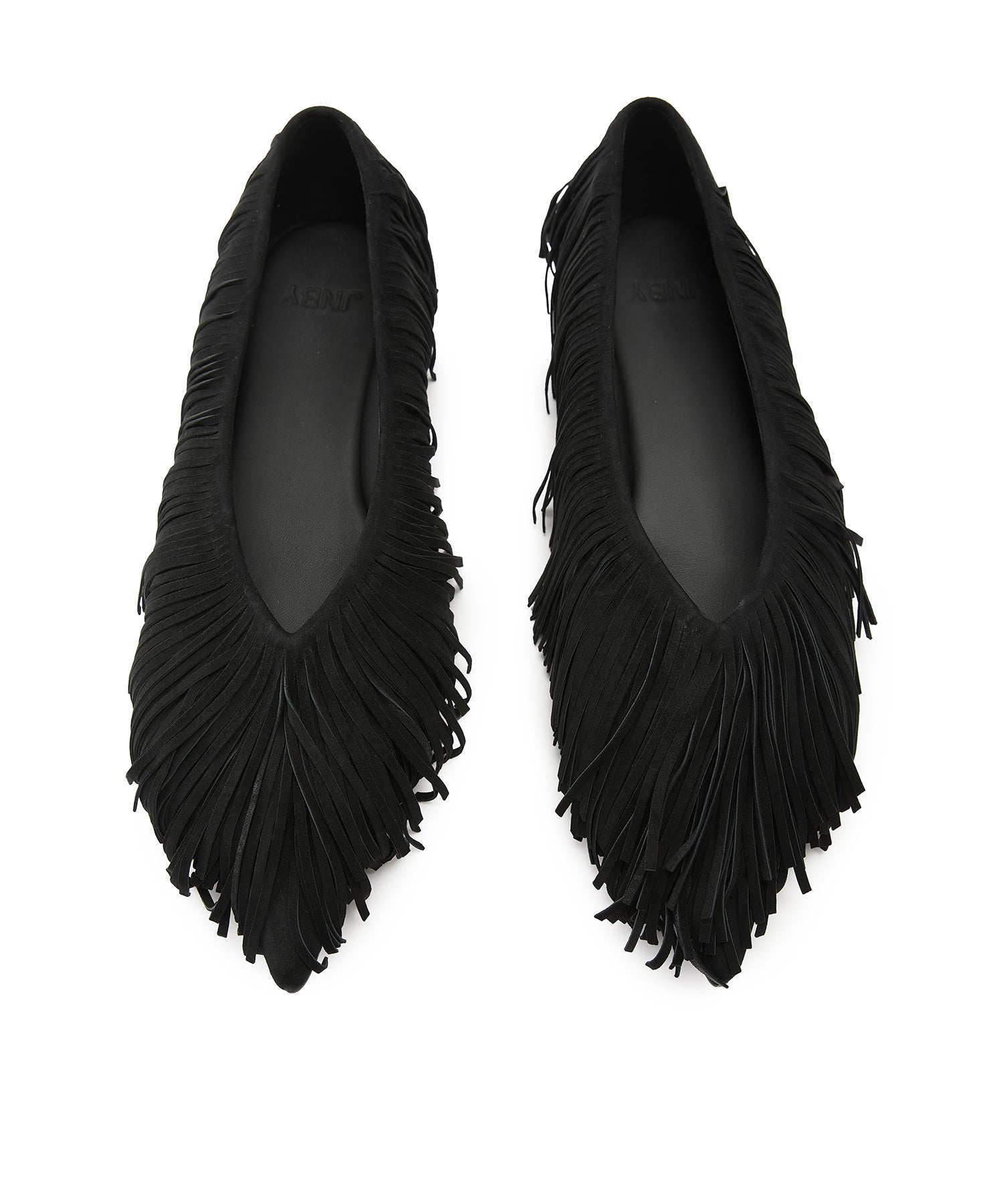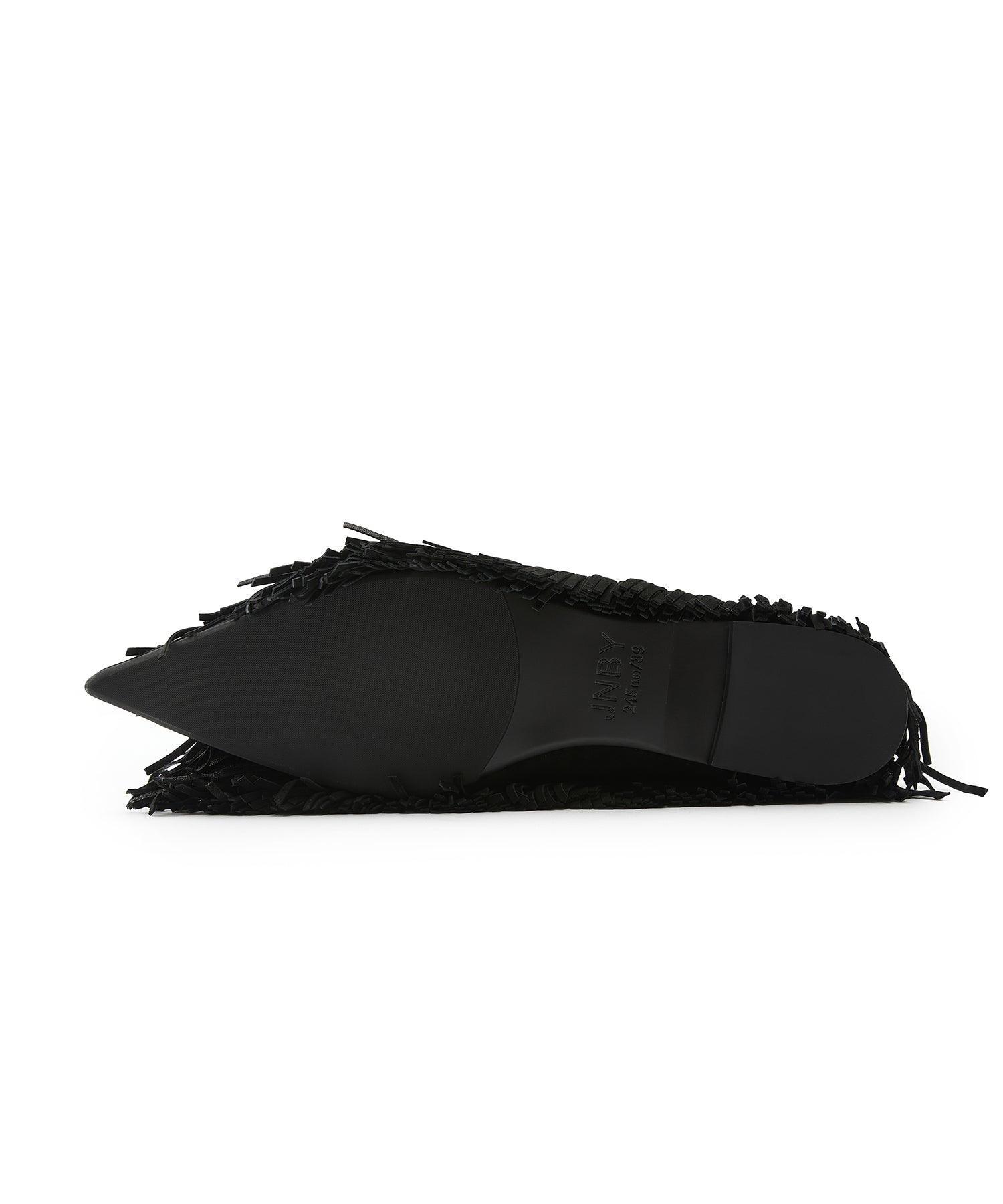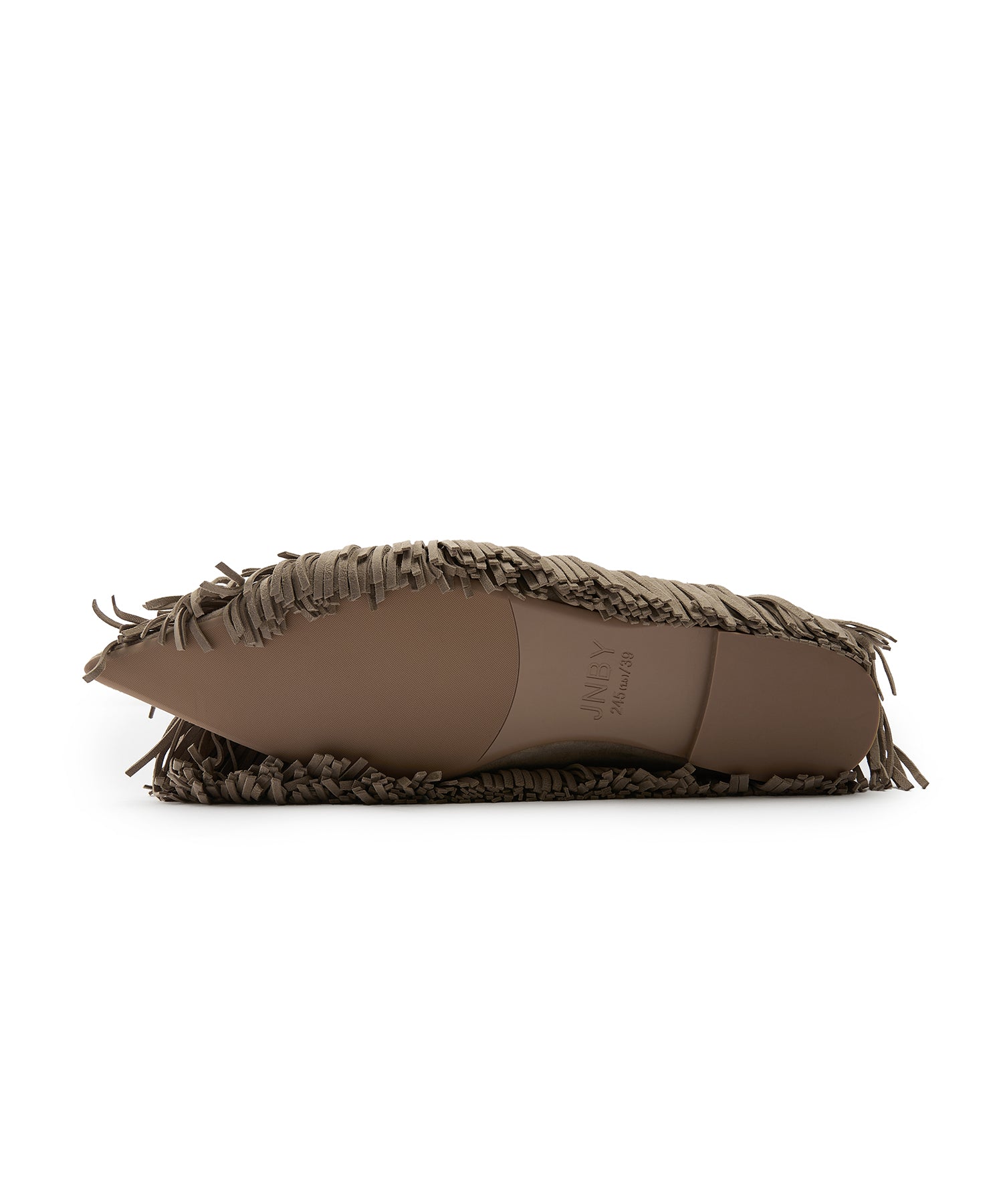 スエード フリンジ フラットパンプス。全体にあしらったフリンジが印象的な、JNBYらしい唯一無二のデザイン。柔らかなスエード素材が足元に秋冬らしい深みと温もりを添えます。フラットながらも存在感抜群で、履くだけでスタイリングをモードに格上げする一足です。