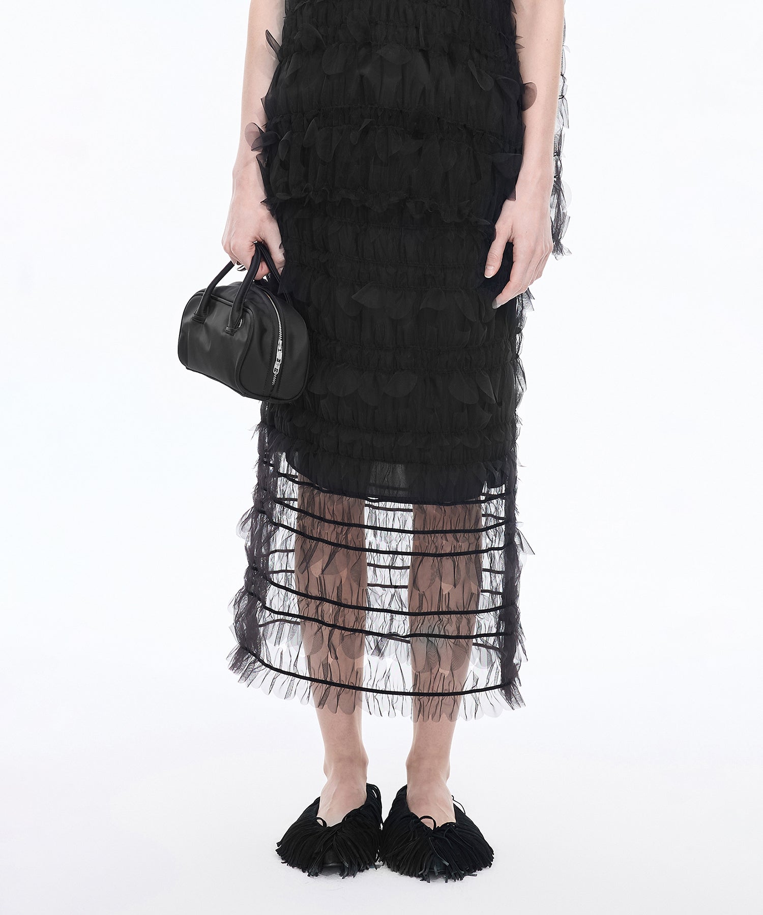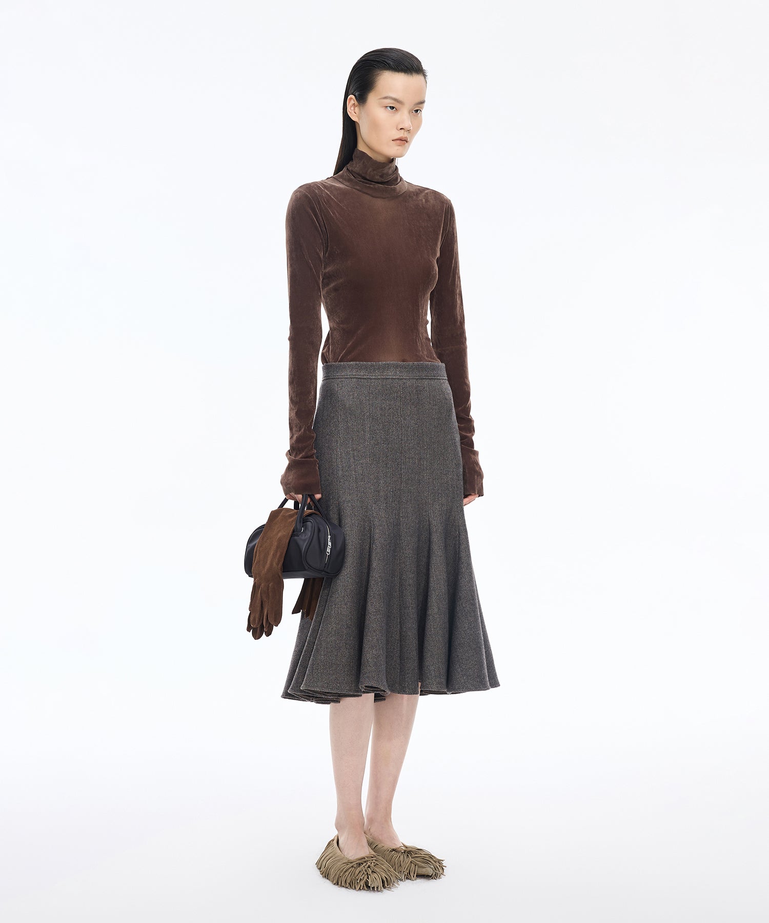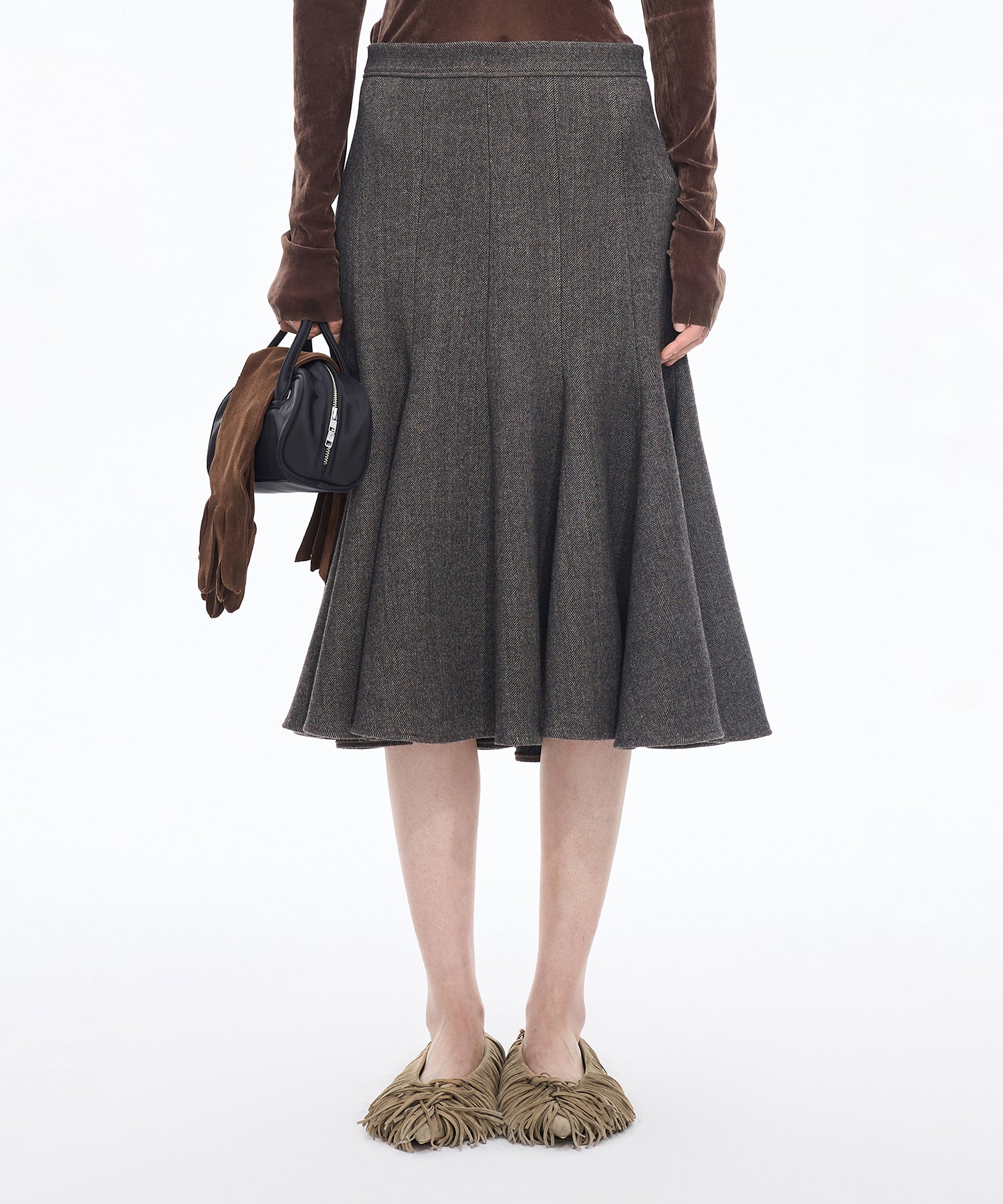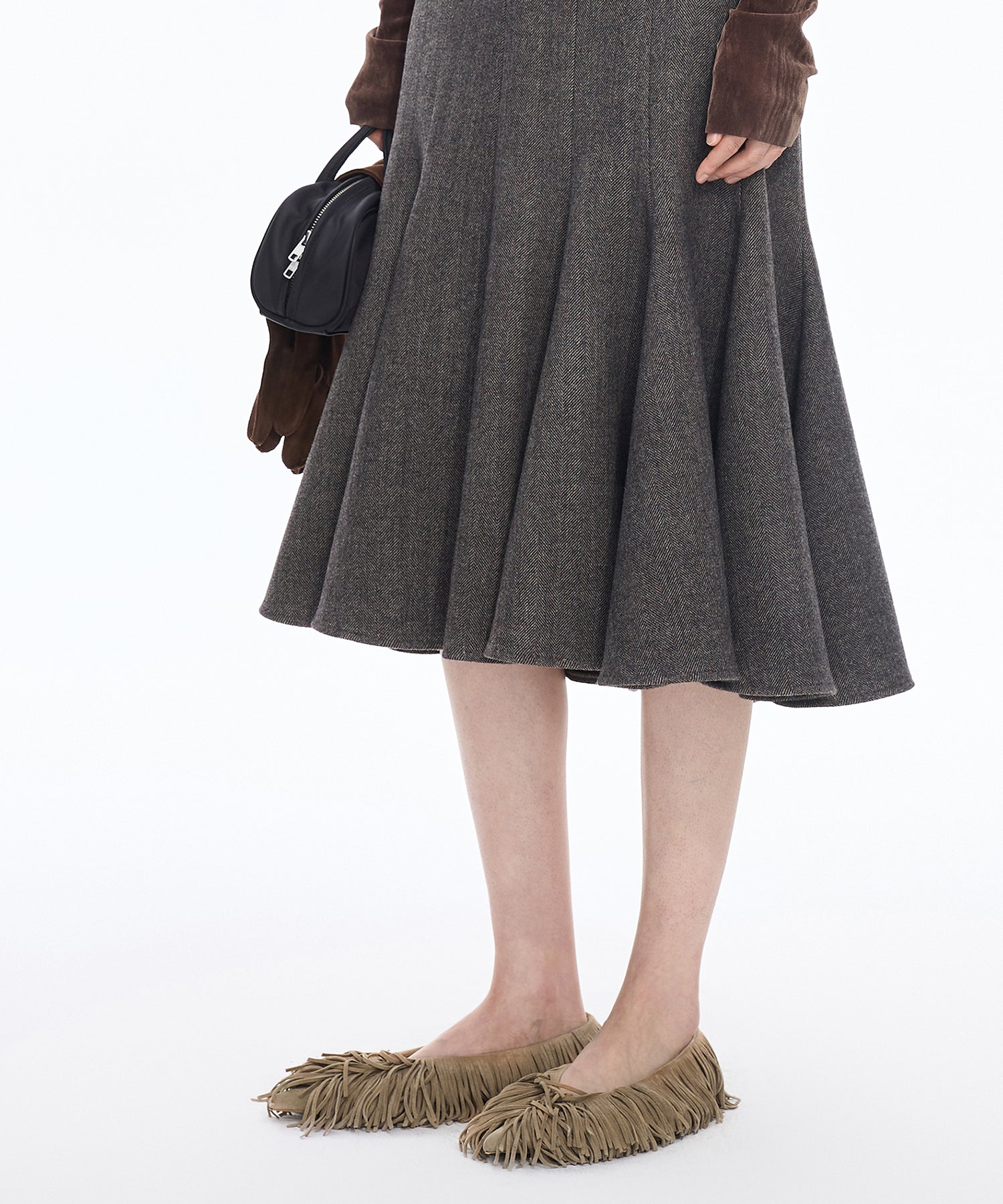 スエード フリンジ フラットパンプス。全体にあしらったフリンジが印象的な、JNBYらしい唯一無二のデザイン。柔らかなスエード素材が足元に秋冬らしい深みと温もりを添えます。フラットながらも存在感抜群で、履くだけでスタイリングをモードに格上げする一足です。